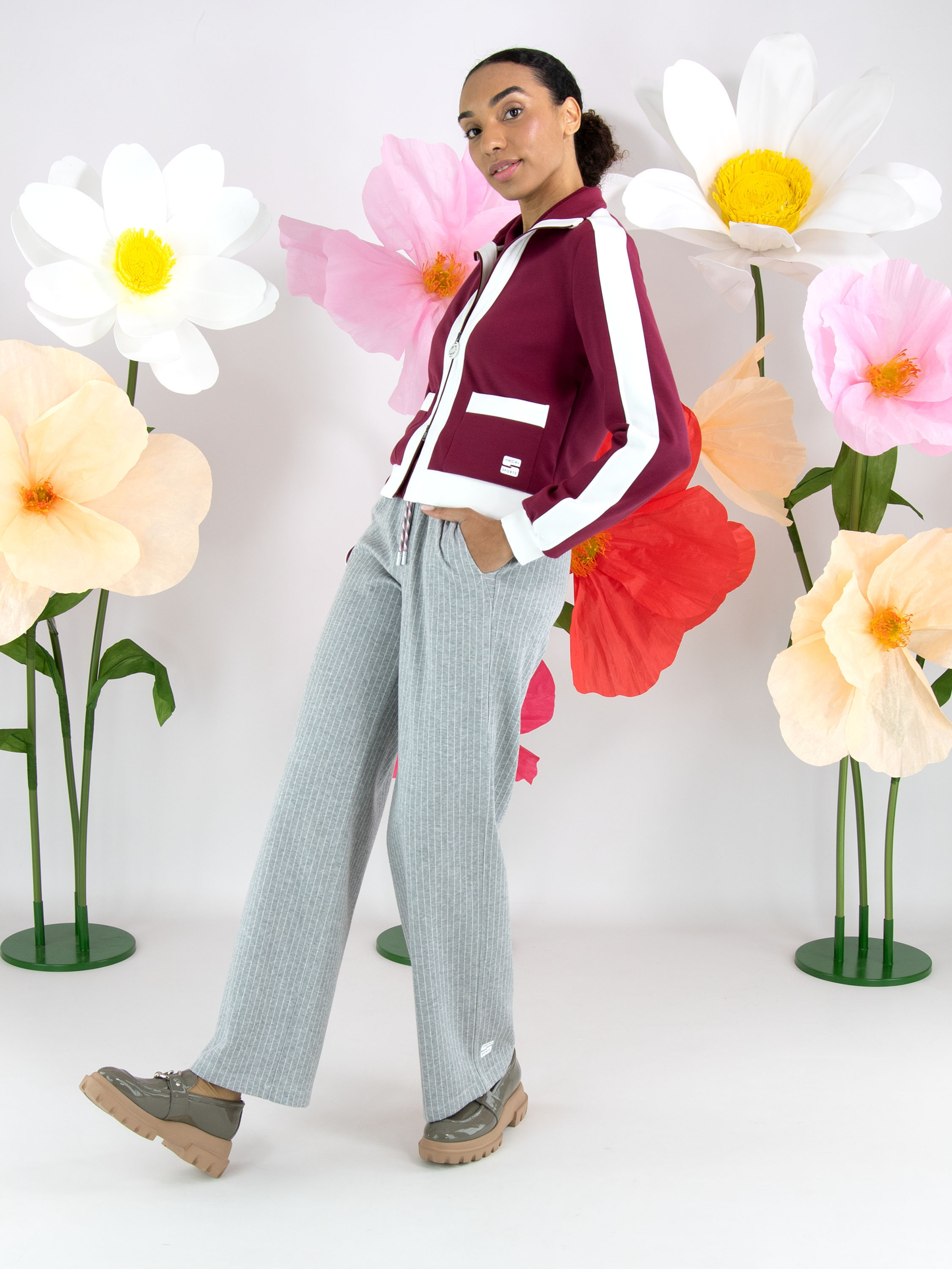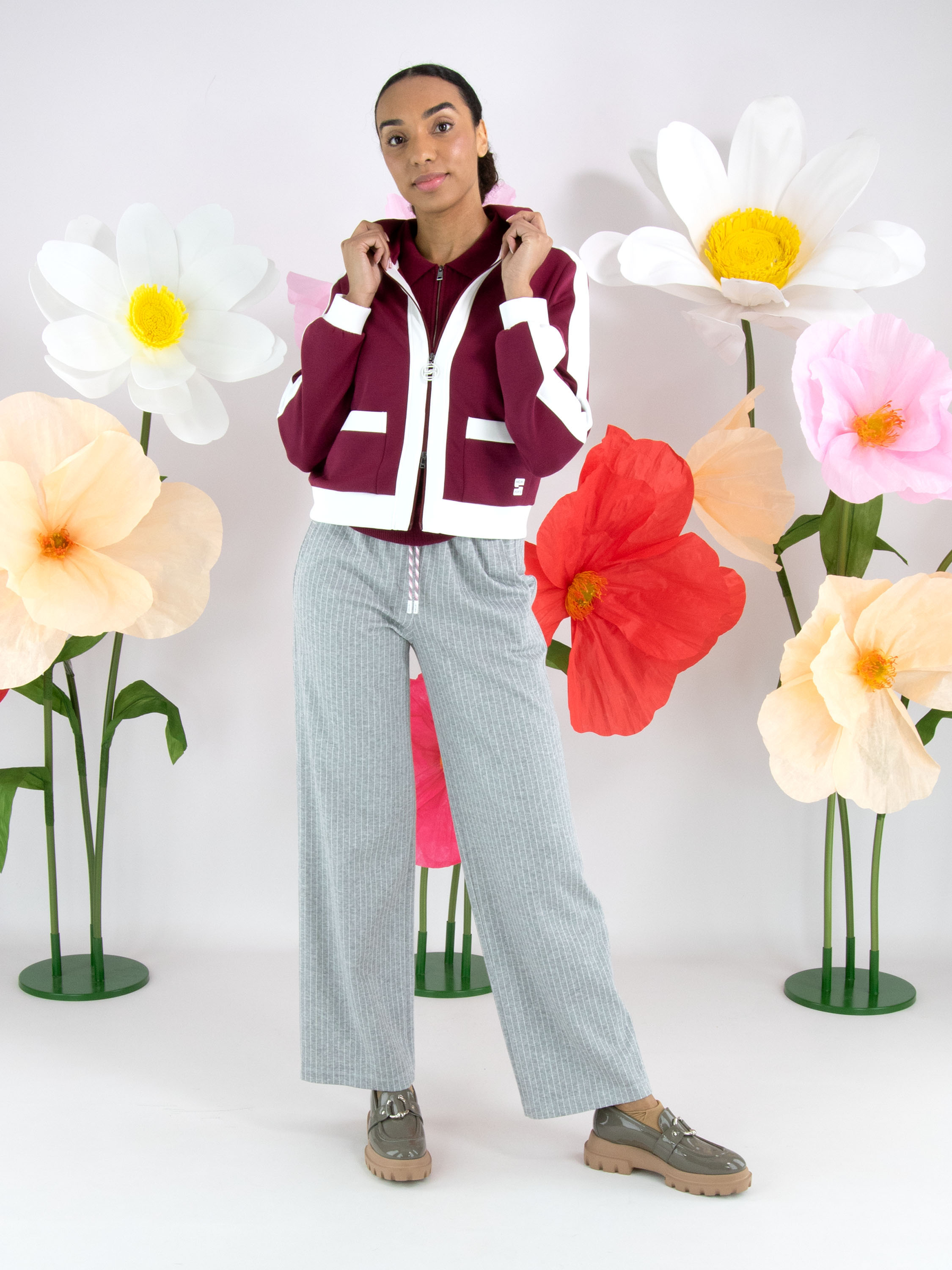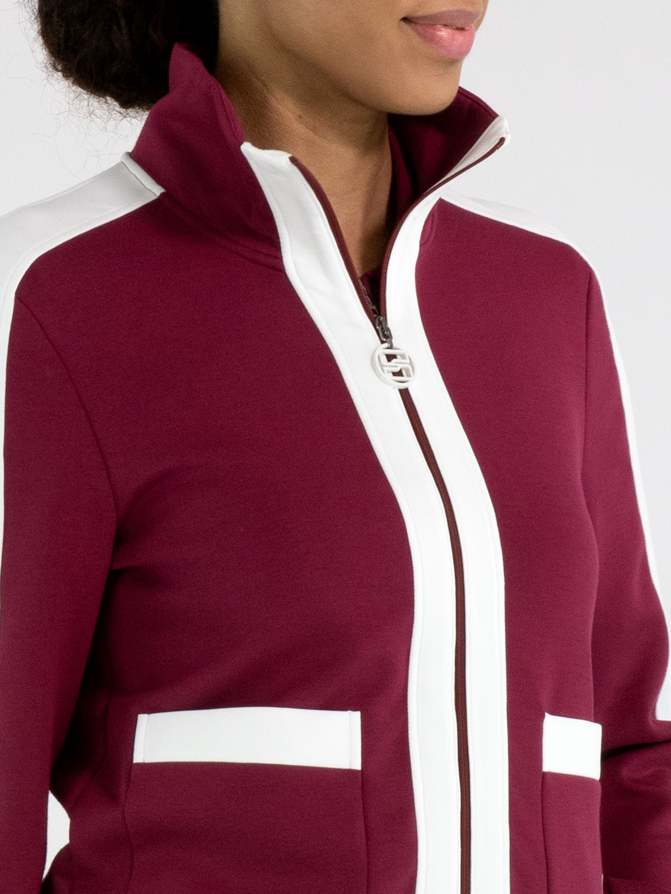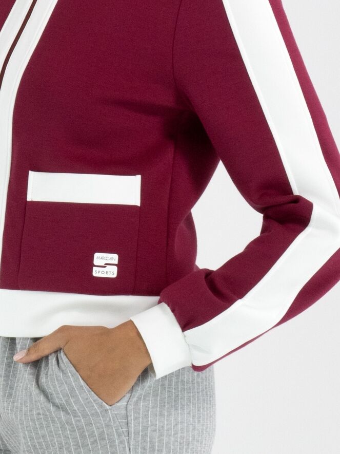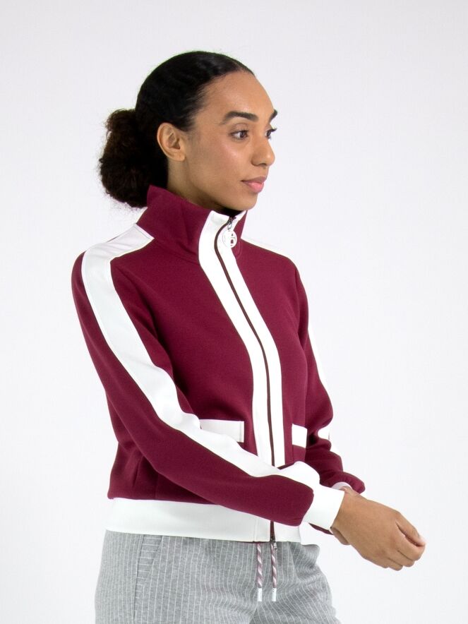 Eine Joggingjacke von Marc Cain in Bordeauxrot. Entlang des Reißverschlusses, auf der Oberseite der langen Ärmel und am unteren Saum verlaufen breite Biesen in Weiß. Diese Jacke kann bei 30 Grad gewaschen werden.