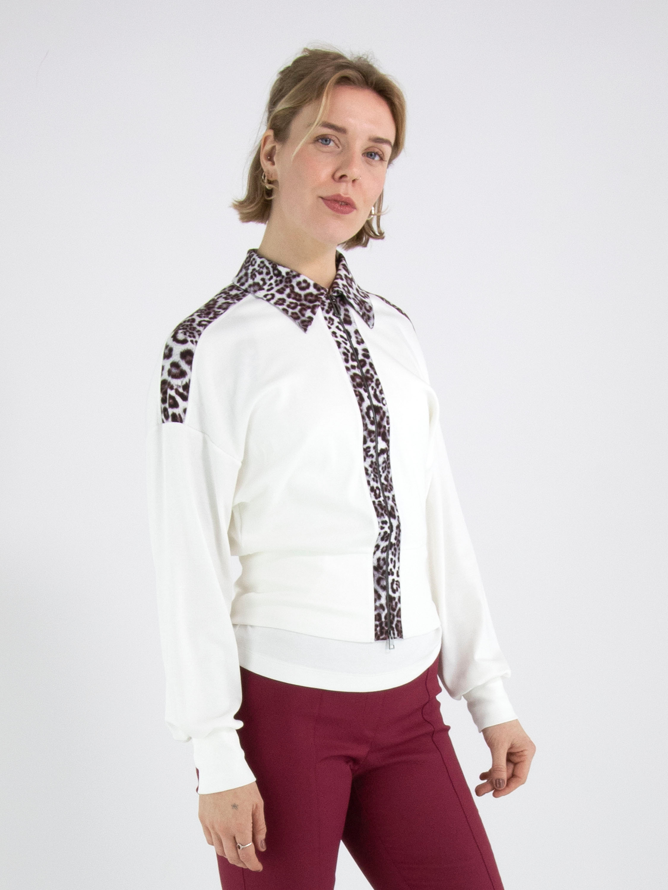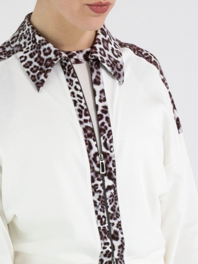 Eine kurze Strickjacke von Marc Cain aus fein geripptem Stoff in Cremeweiß. Auf beiden Seiten des Reißverschlusses befindet sich eine Biese im Leopardenprint mit verschiedenen Grau-, Bordeaux- und Cremeweißtönen. Dieser Print findet sich auch am Kragen und auf den Schultern wieder. Am unteren Abschluss befindet sich ein breites Band mit einer Naht, die einen Blouson-Effekt erzeugt. Die Strickjacke hat Fledermausärmel und kann bei 30 Grad gewaschen werden.