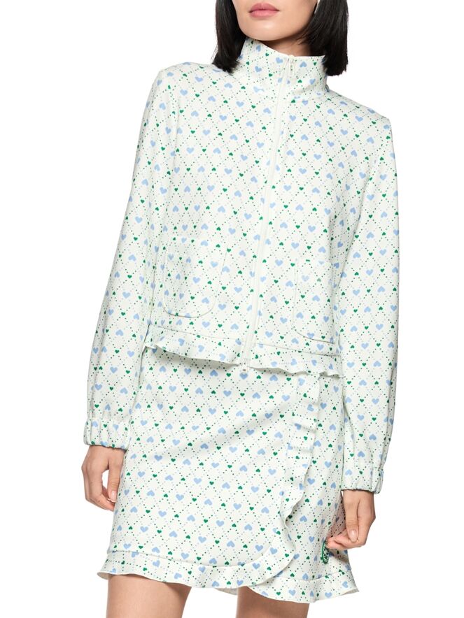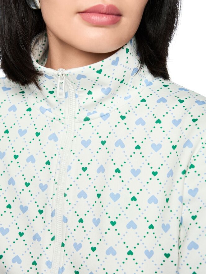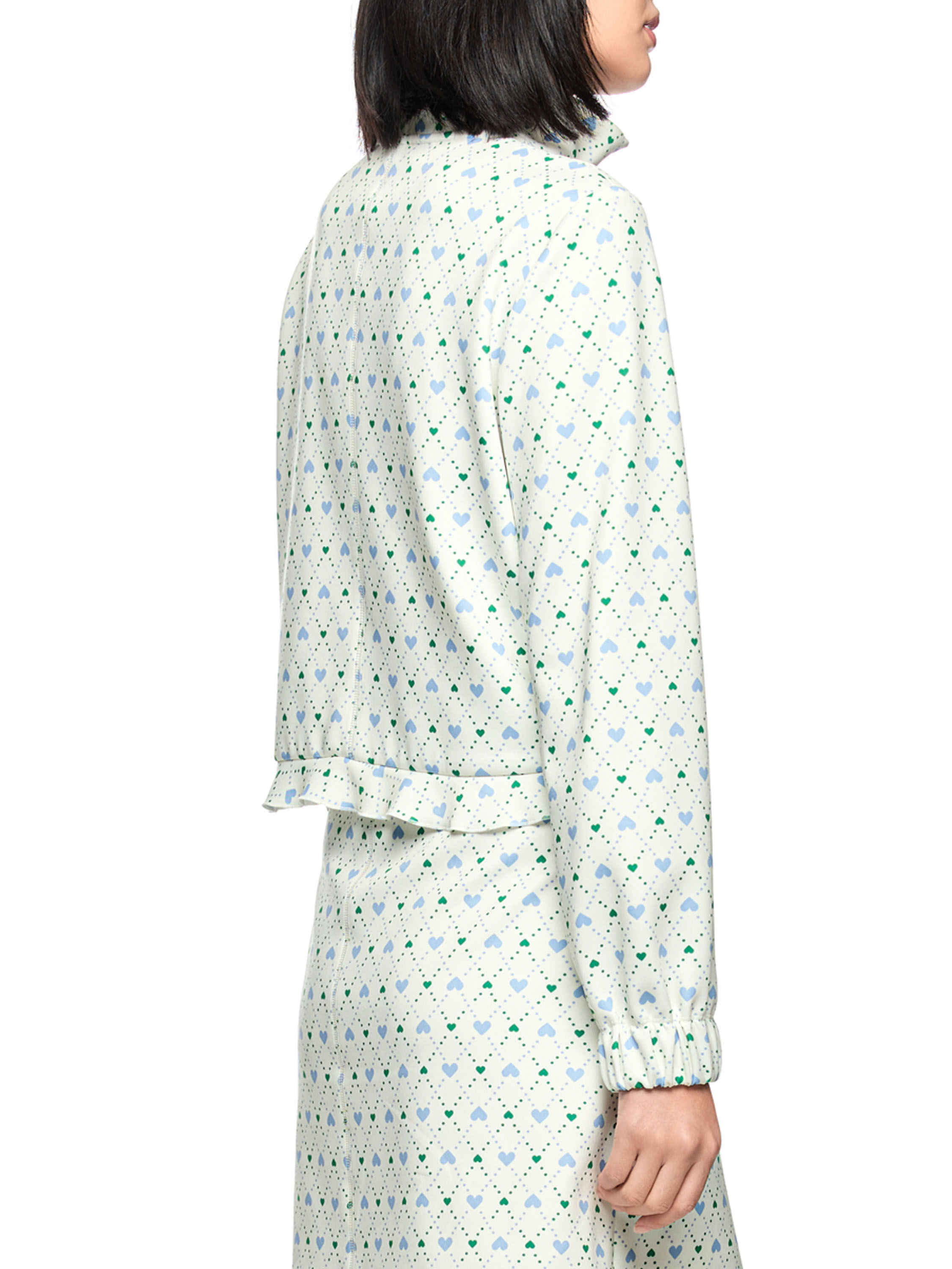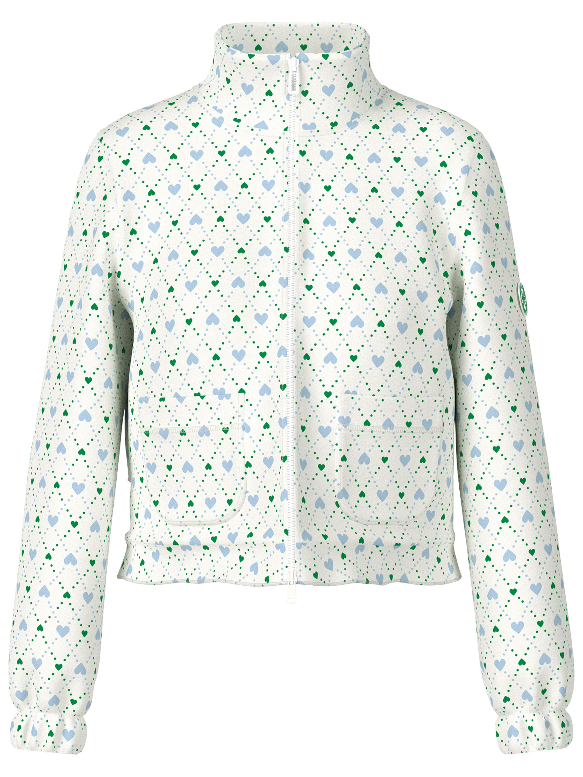 Eine kurze Jacke von Marc Cain in Scuba-Qualität mit einem Karomuster mit Tupfen und Herzmotiven in Blau und Dunkelgrün auf cremeweißem Hintergrund. Die Jacke hat einen Reißverschluss. Die Abschlüsse der langen Ärmel sind mit elastischen, plissierten Bündchen versehen. Die Rückseite der Jacke ist gefüttert. Diese Jacke kann von Hand gewaschen werden.