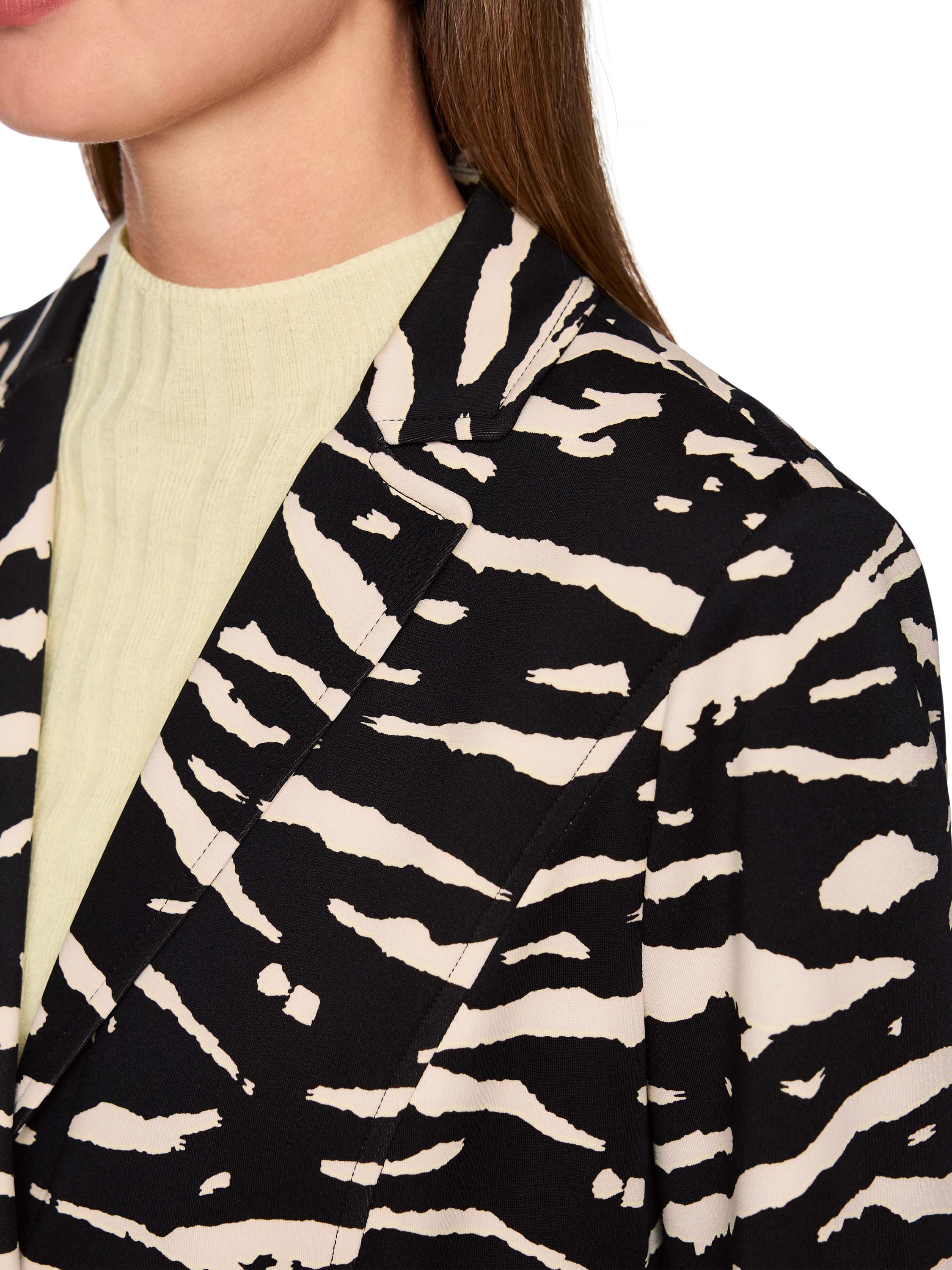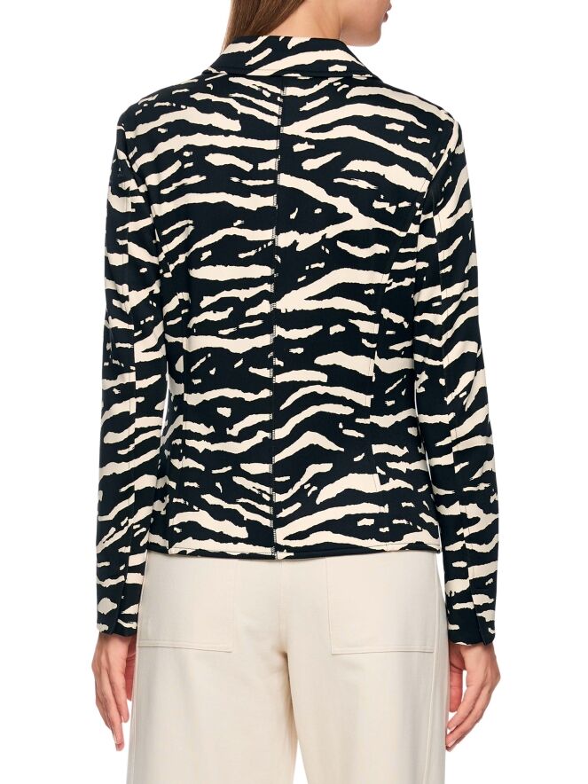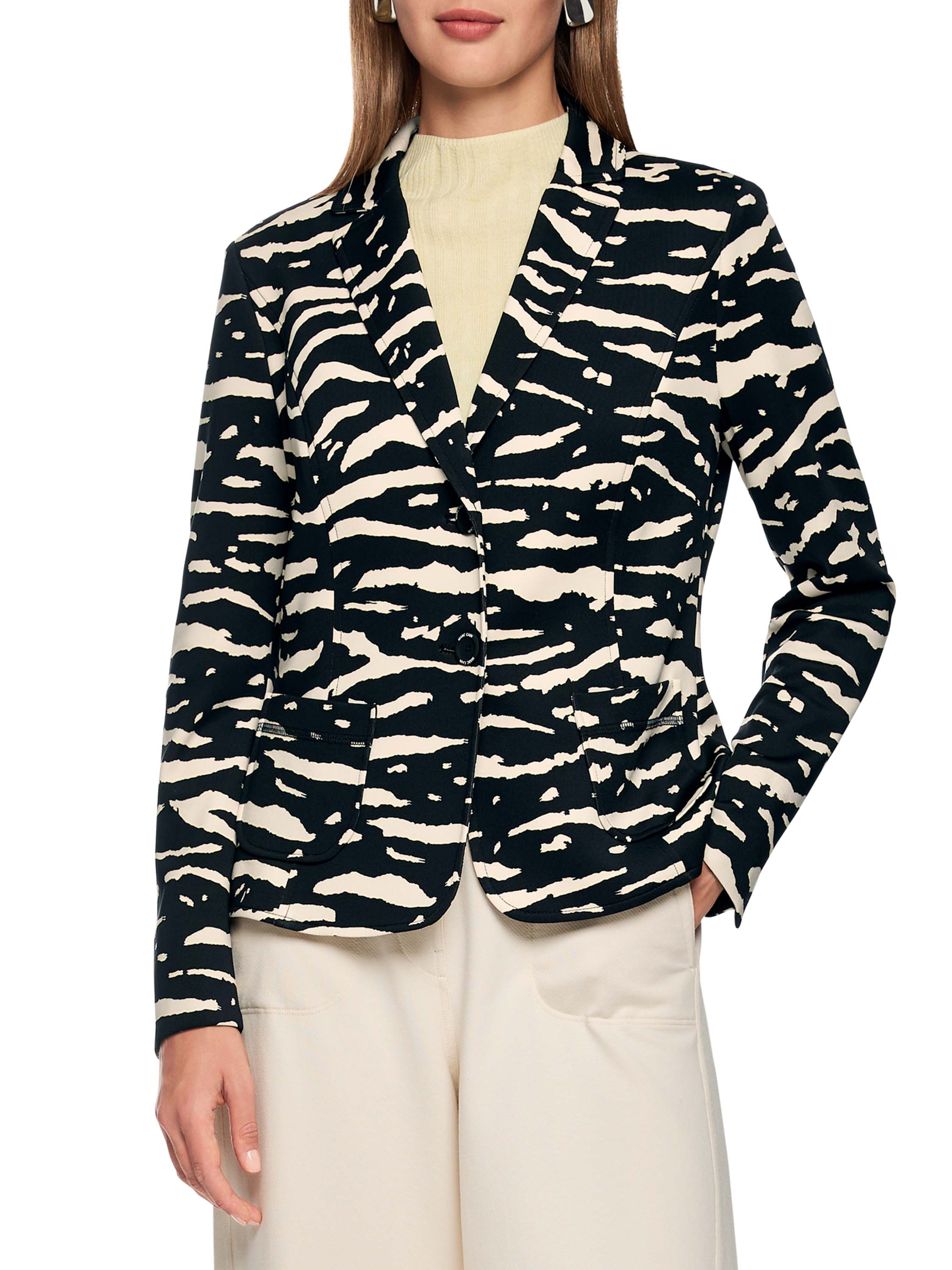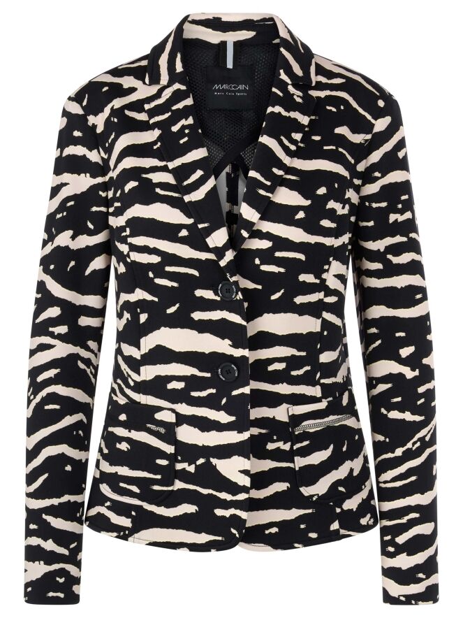 Ein Blazer von Marc Cain im Zebramuster in Schwarz und Beige. Der Blazer ist aus Scuba-Material gefertigt und hat einen Verschluss mit 2 Knöpfen. Dieser Blazer kann bei 30 Grad gewaschen werden.