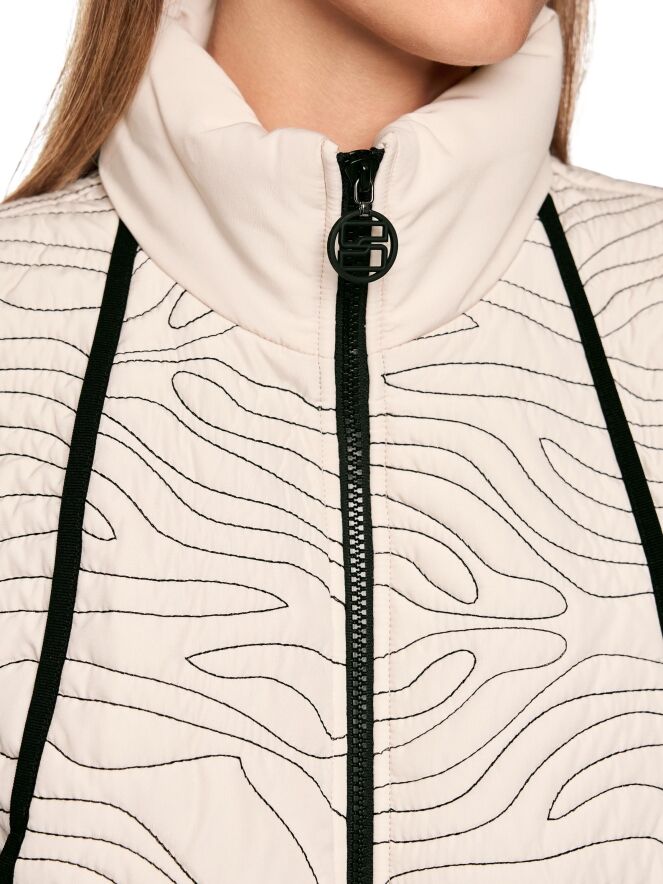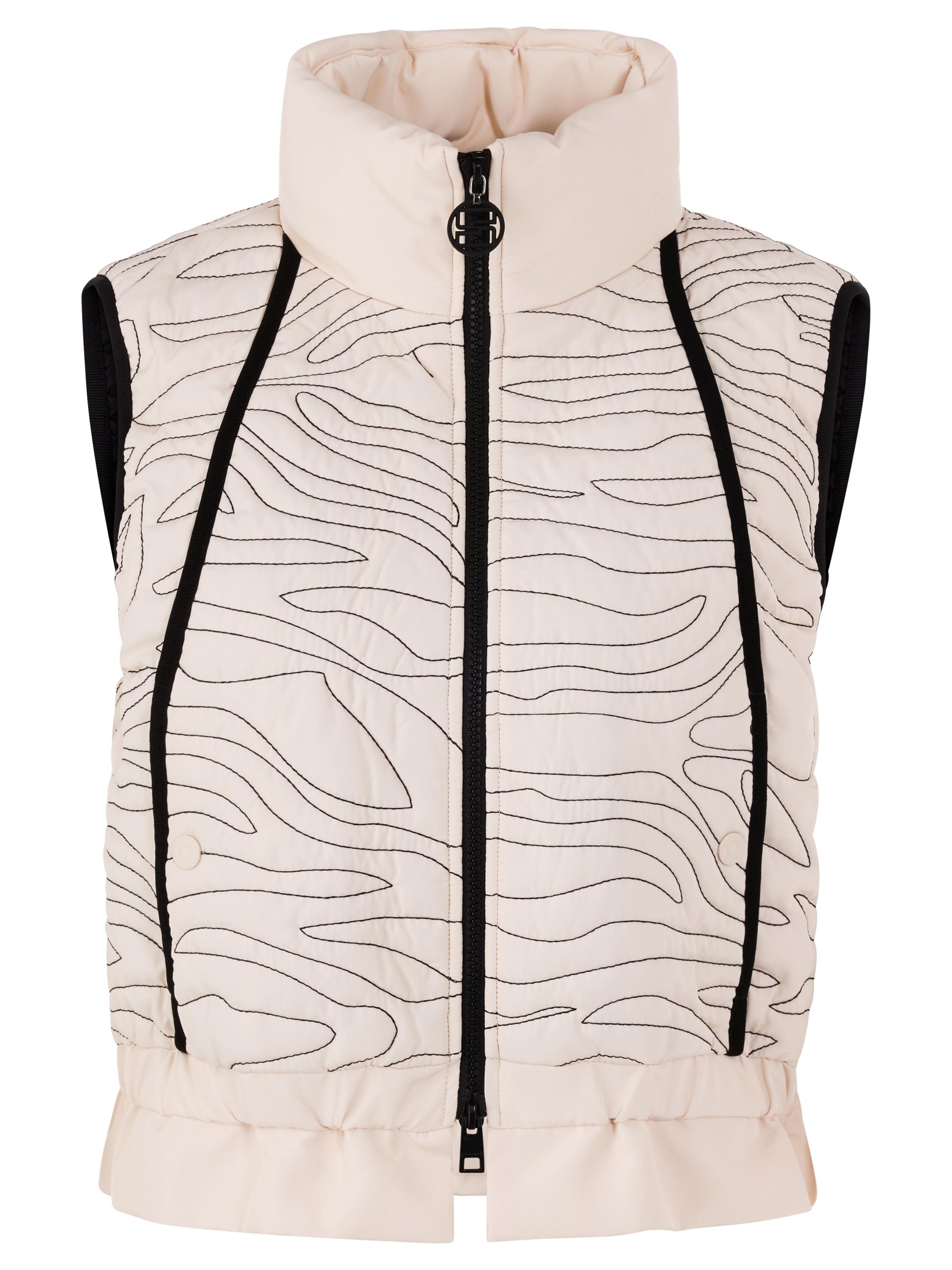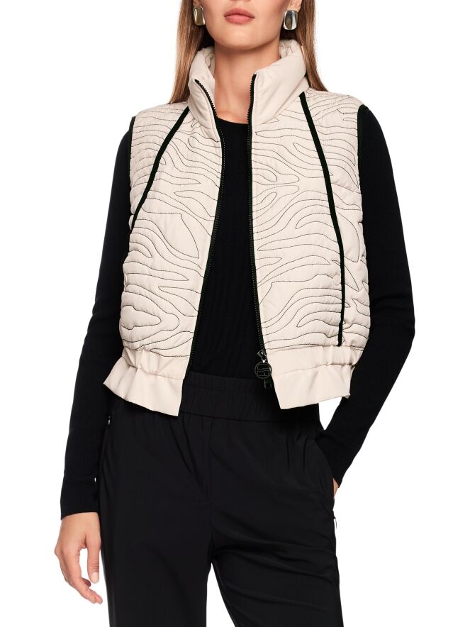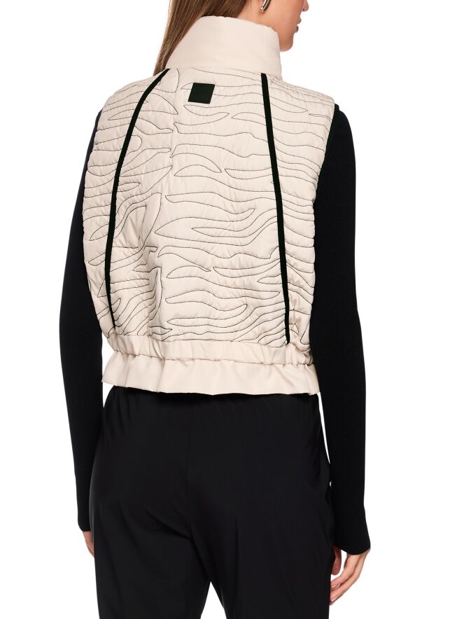 Eine Weste von Marc Cain in Beige mit dekorativen, wellenförmigen Steppnähten. Vorder- und Rückseite haben schwarze vertikale Biesen. Der Kragen und der untere Saum sind aus mattem Satin gefertigt, wobei der Stoff entlang der unteren Naht fein gelegt ist. Darüber befindet sich eine elastische, plissierte Kante. Diese Weste kann bei 30 Grad gewaschen werden.