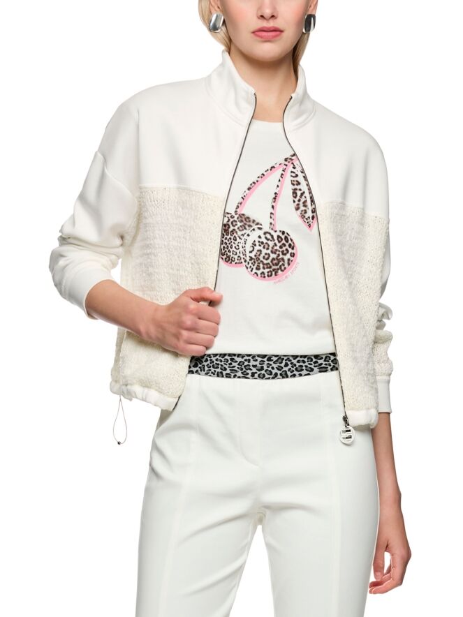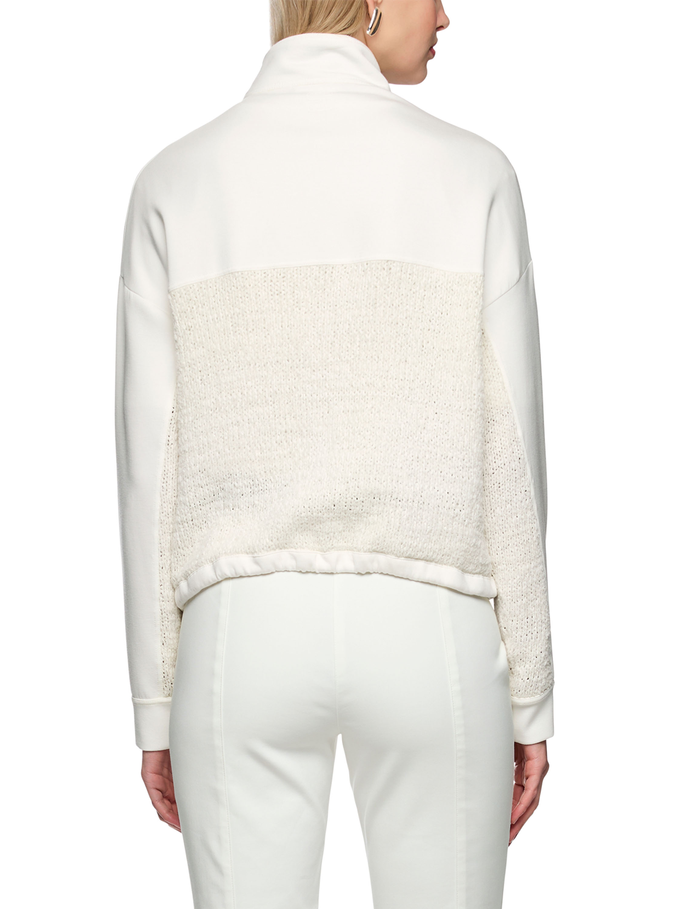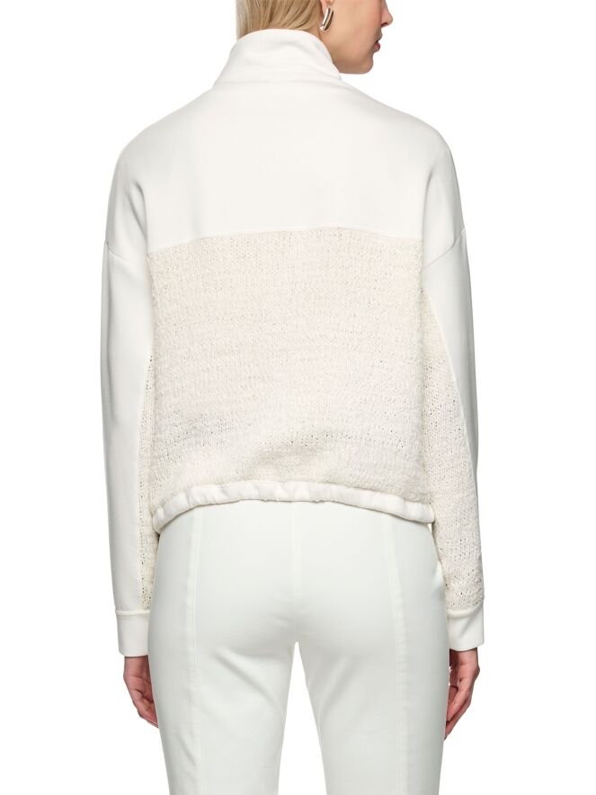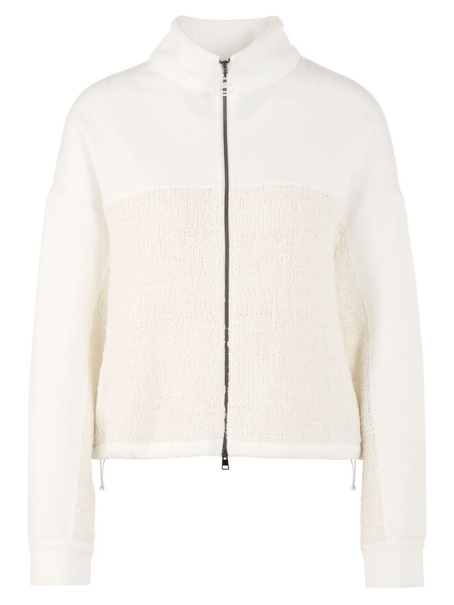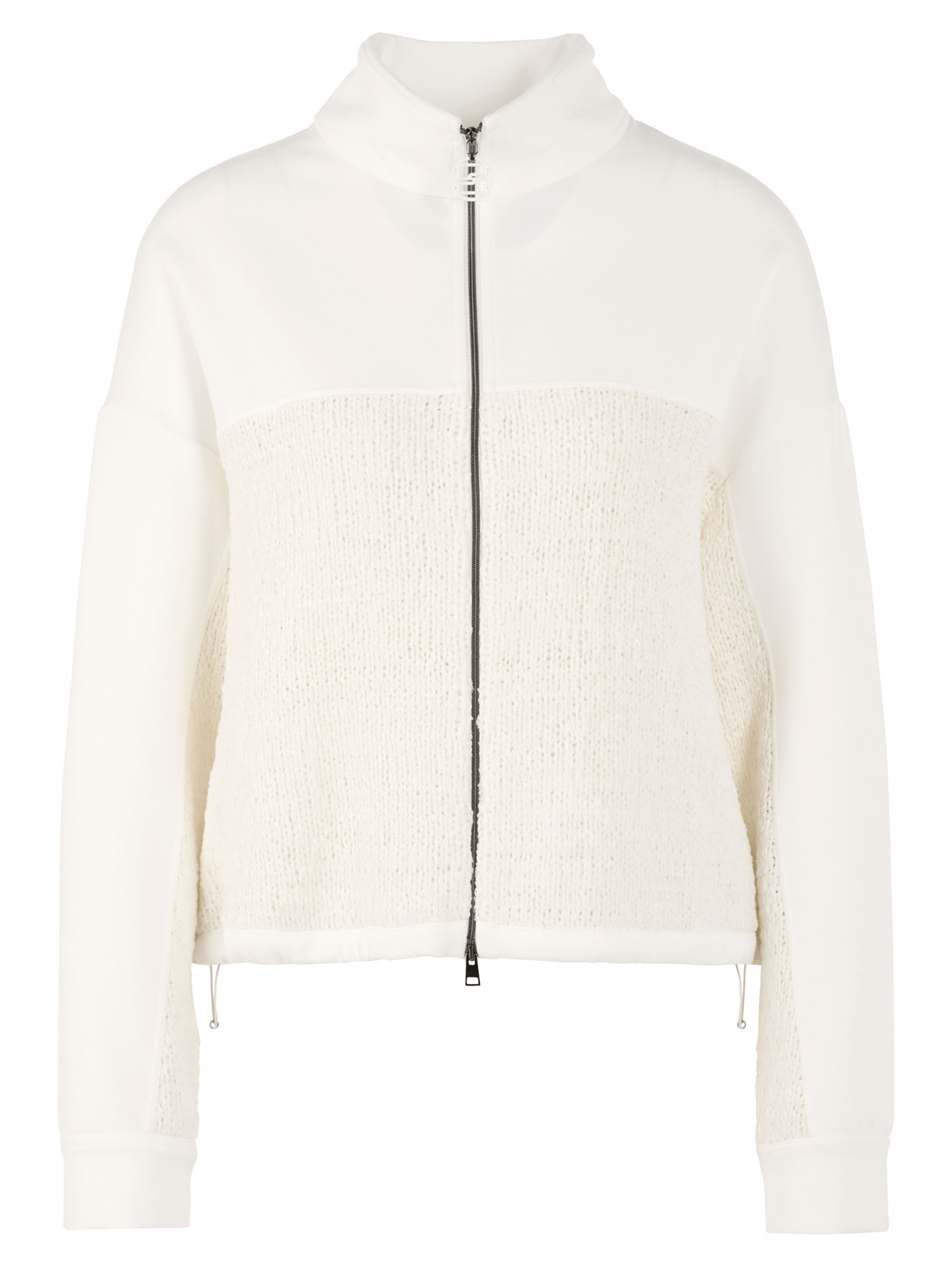 Eine Strickjacke von Marc Cain in Cremeweiß. Der obere Bereich bis zur Brust sowie die langen Ärmel sind aus einer Scuba-Qualität gefertigt. Ab der Brust ist die Jacke gestrickt. Am unteren Abschluss befindet sich eine Blende mit einem verstellbaren Kordelzug in Tunnelverarbeitung, mit dem ein Falt-Effekt erzeugt werden kann. Die Strickjacke hat einen Reißverschluss und kann bei 30 Grad gewaschen werden.