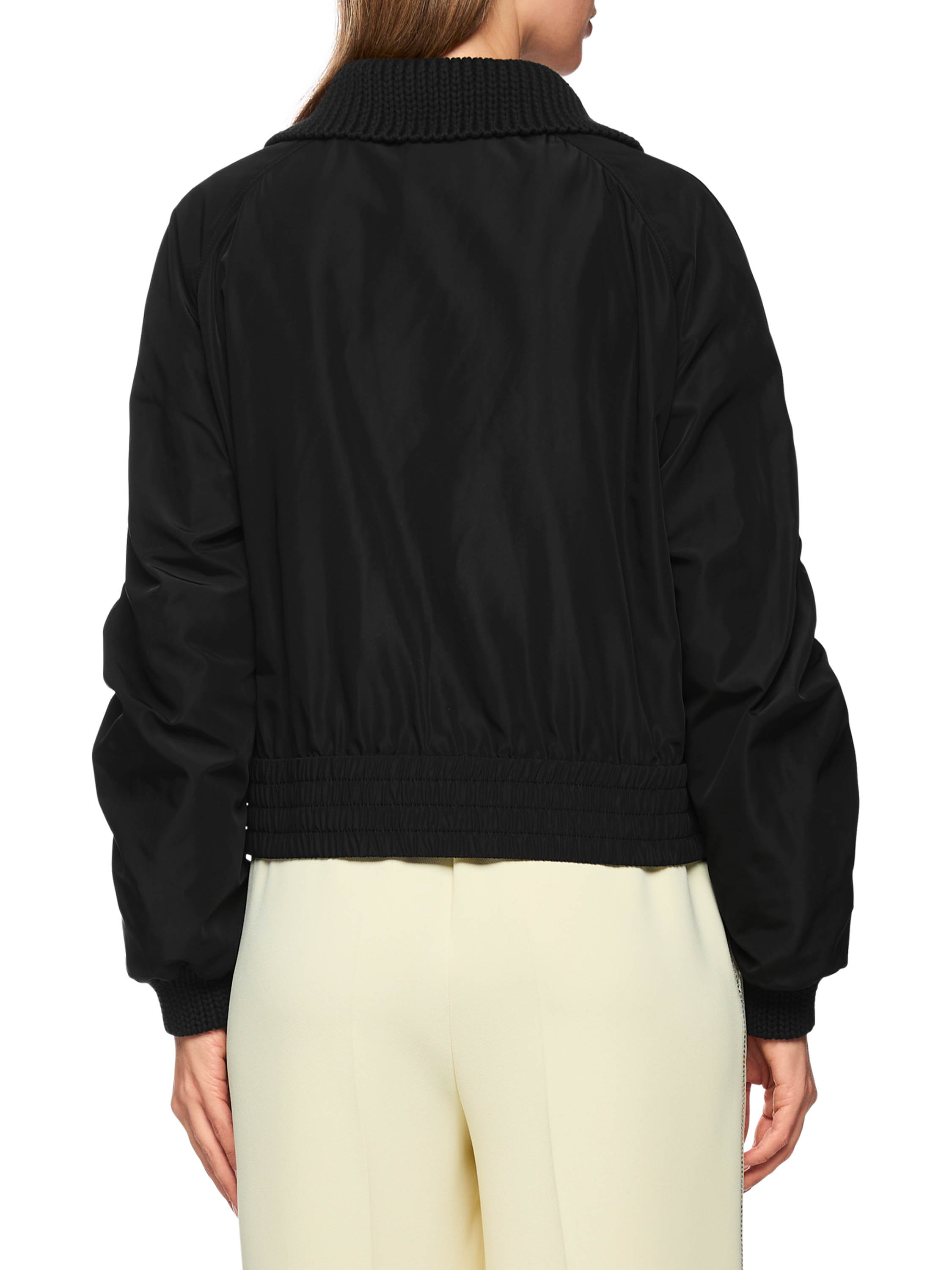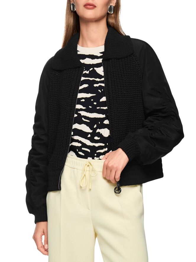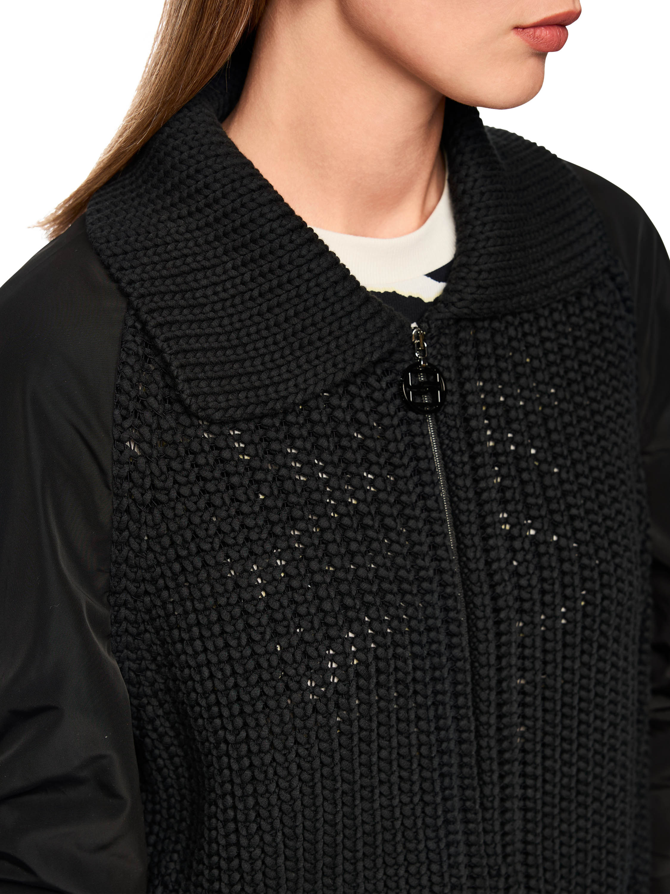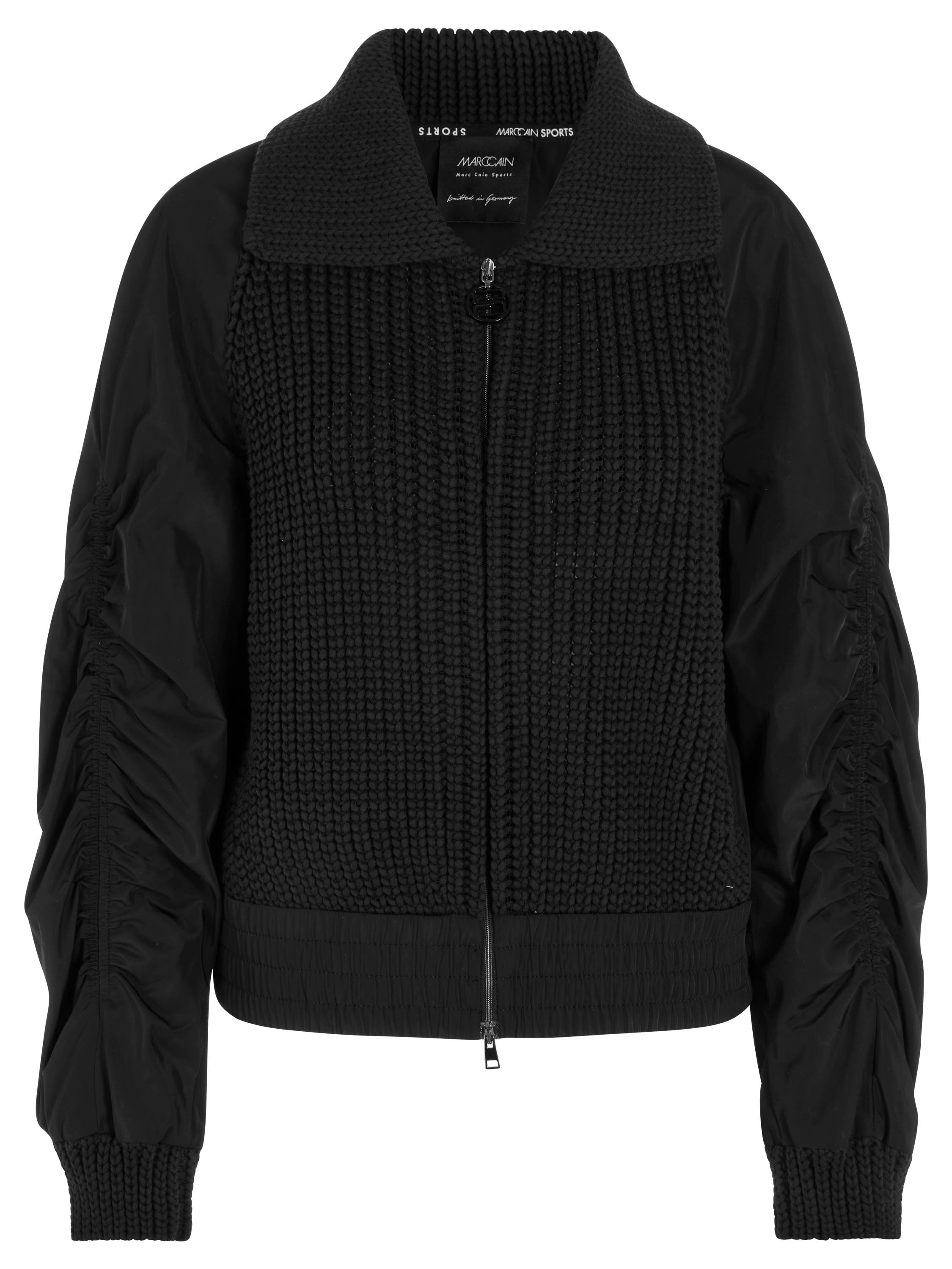Eine Strickjacke von Marc Cain in Schwarz. Die Vorderseite der Jacke, die Manschetten und der Kragen sind in Patentstrick gearbeitet, während die Rückseite und die Ärmel aus Fallschirmstoff gefertigt sind. Die Naht über der Oberseite der langen Ärmel ist beidseitig fein gelegt. Am unteren Abschluss befindet sich ein breites, fein gelegtes Band. Die Strickjacke hat einen Reißverschluss und kann bei 30 Grad gewaschen werden.