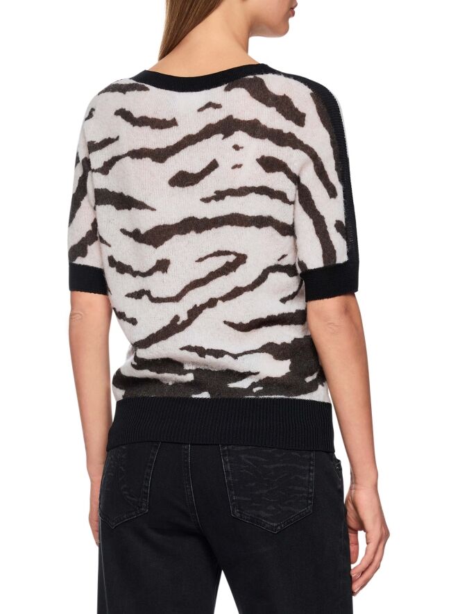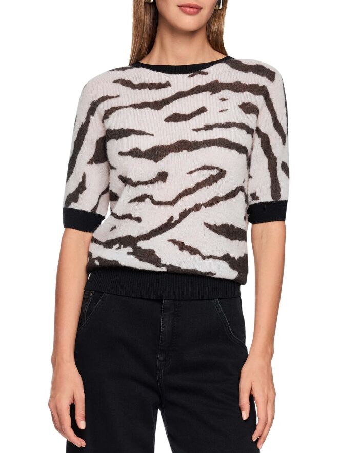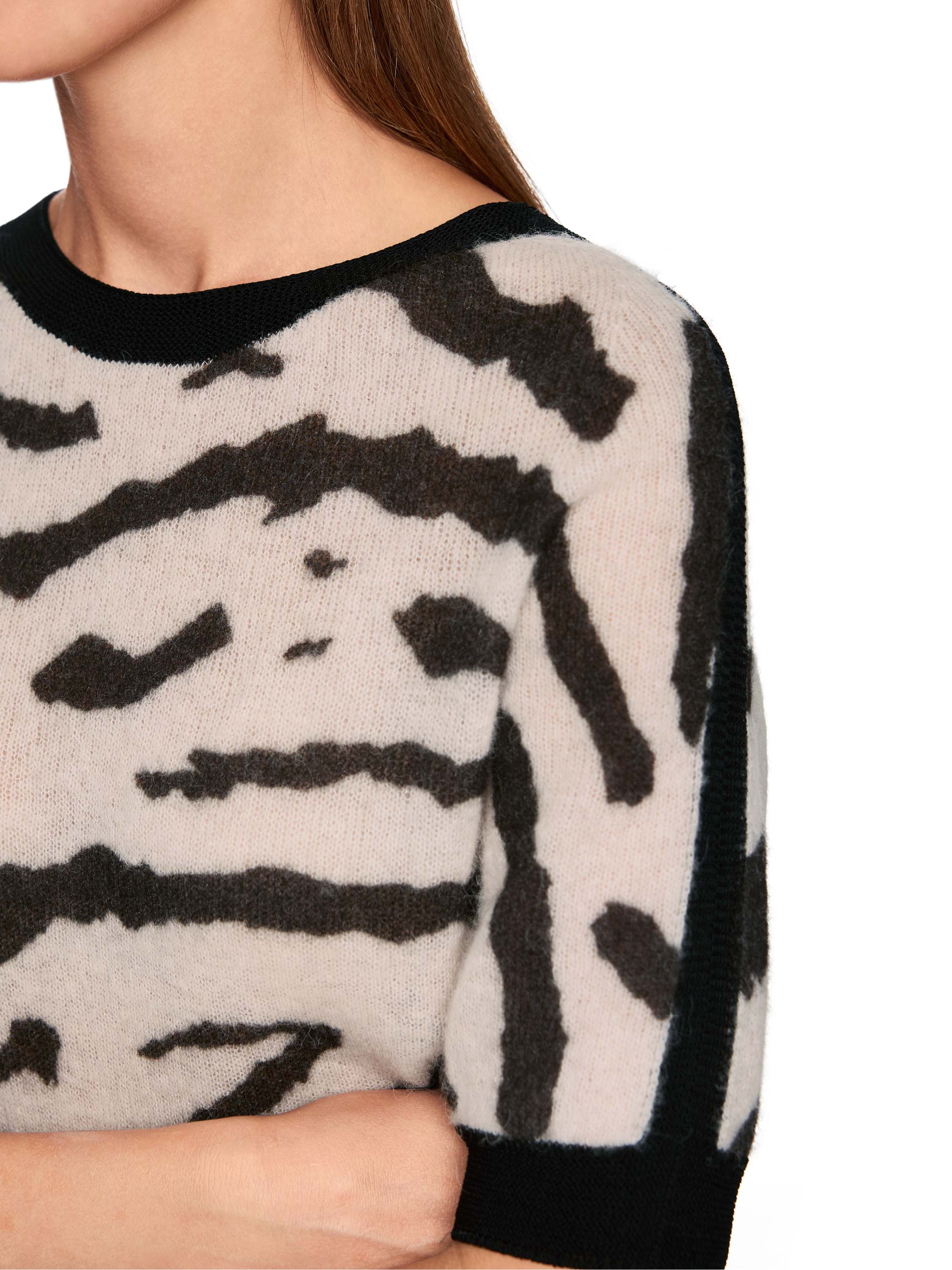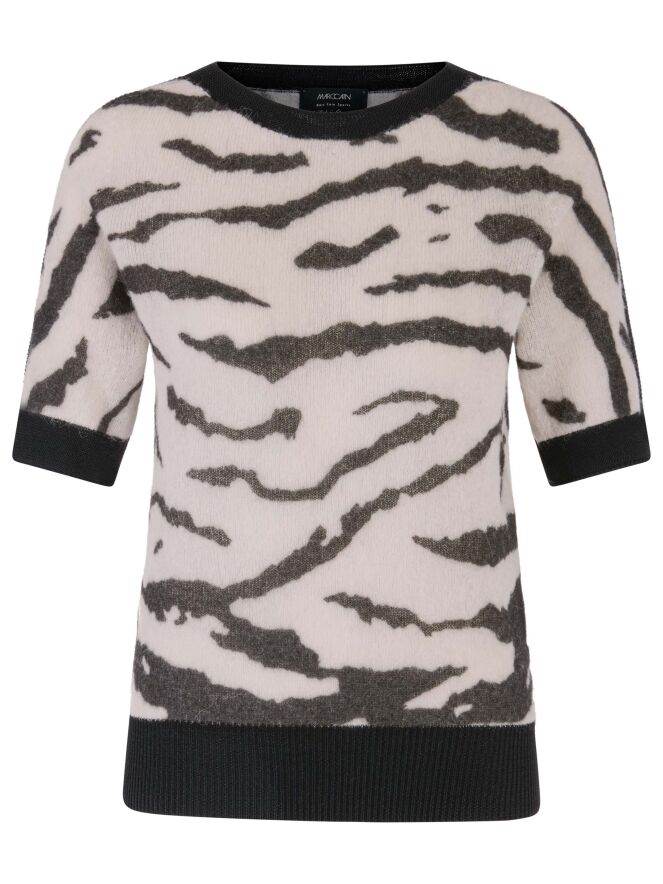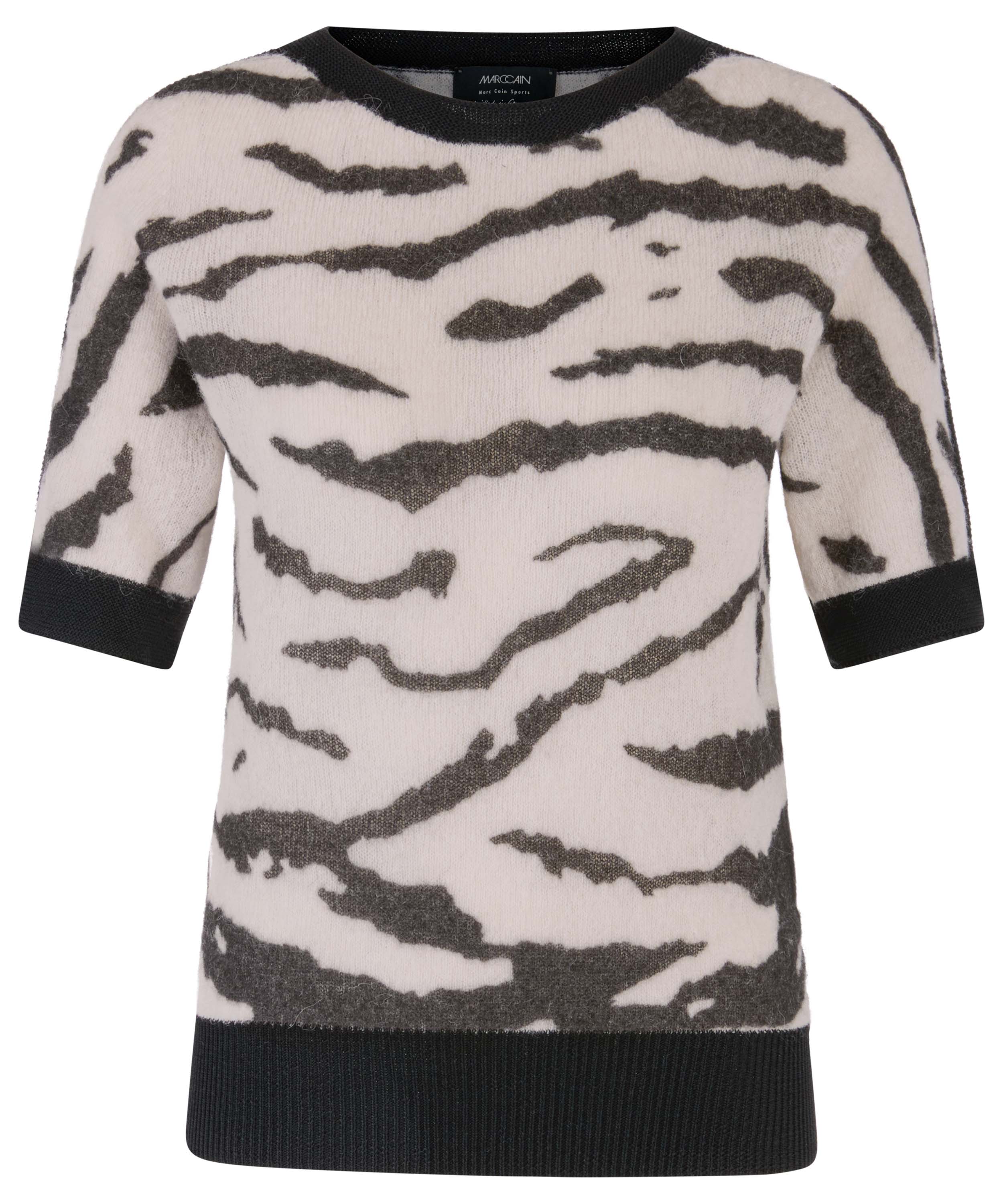 Ein Pullover von Marc Cain im Zebramuster in Cremeweiß und Schwarz. Die kurzen Ärmel haben einen fein gerippten Strickbund, der sich ebenfalls am Rundhalsausschnitt und am Saum wiederfindet. Dieser Pullover kann per Hand gewaschen werden.