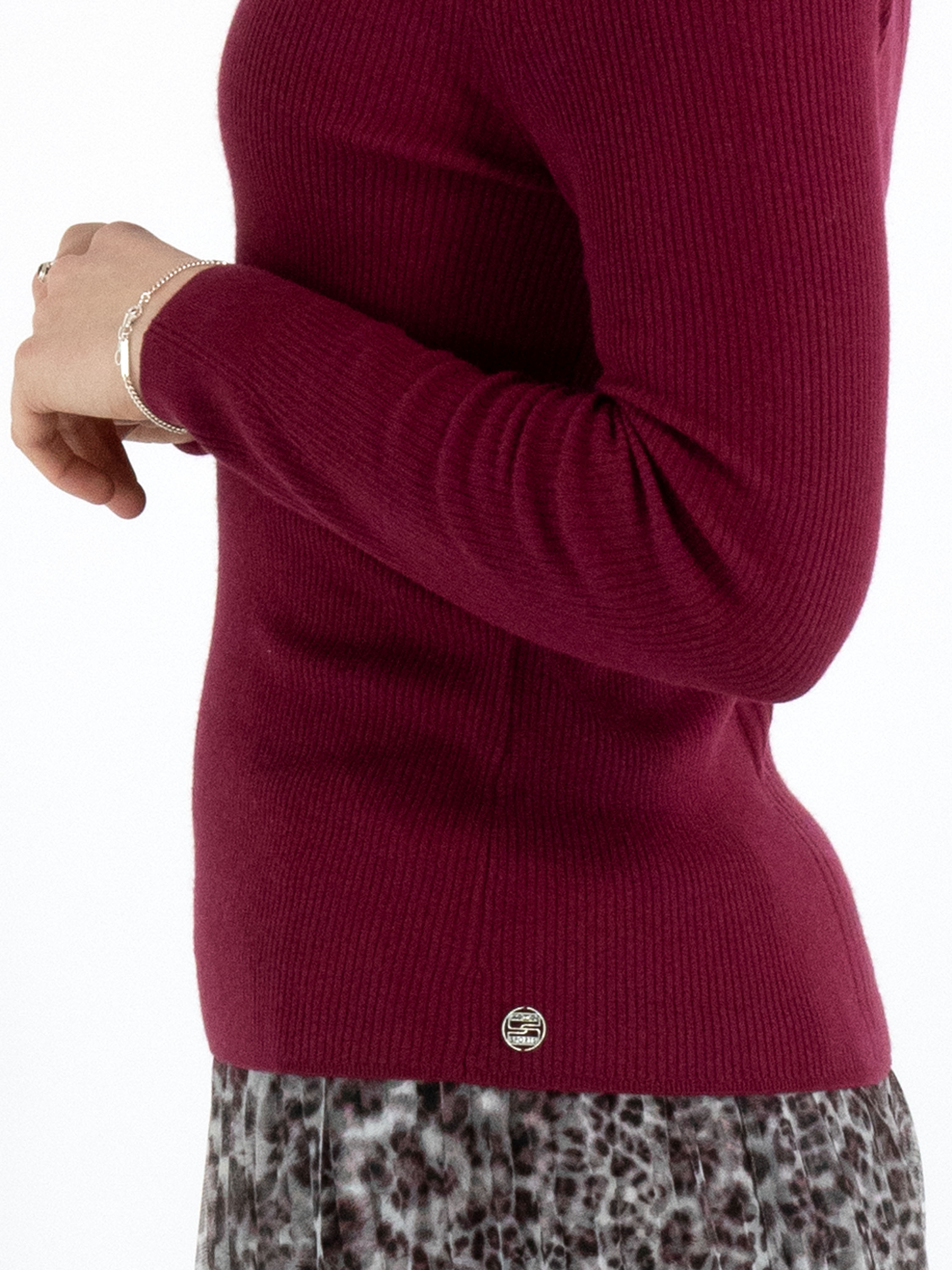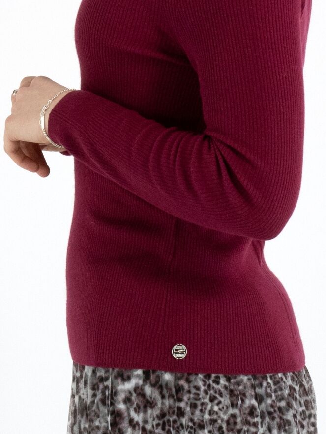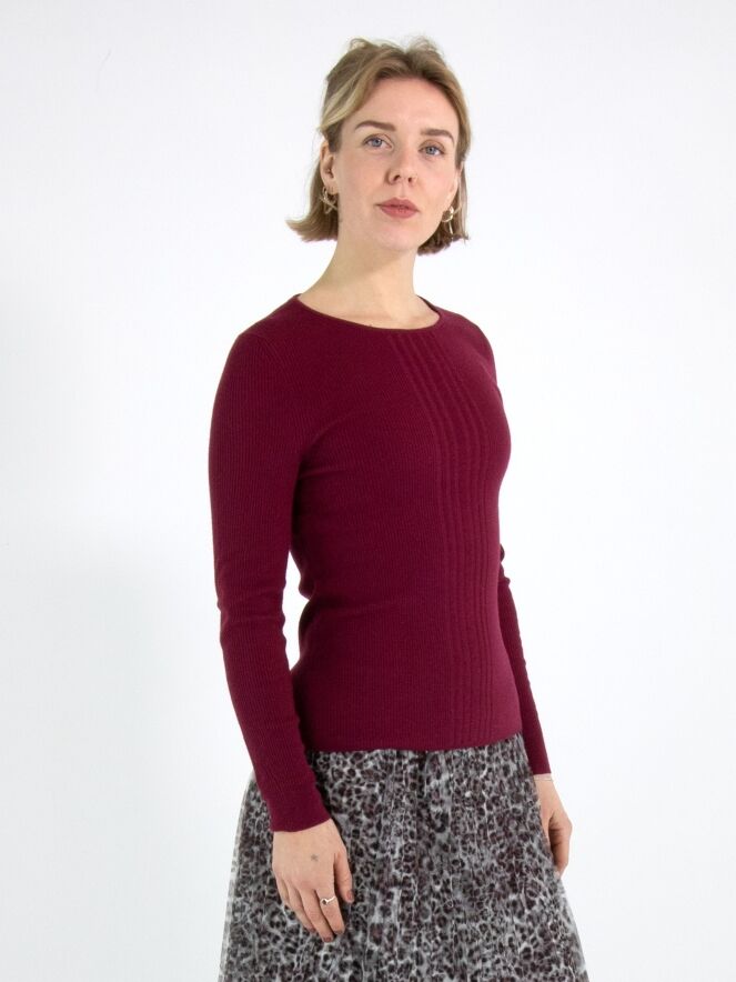 Ein Pullover von Marc Cain in Bordeauxrot. Der Stoff ist fein gerippt, mit einem breiten Einsatz auf der Vorderseite, wo die Rippen breiter gearbeitet sind. Der Pullover hat einen Rundhalsausschnitt und lange Ärmel. Dieser Pullover kann per Hand gewaschen werden.