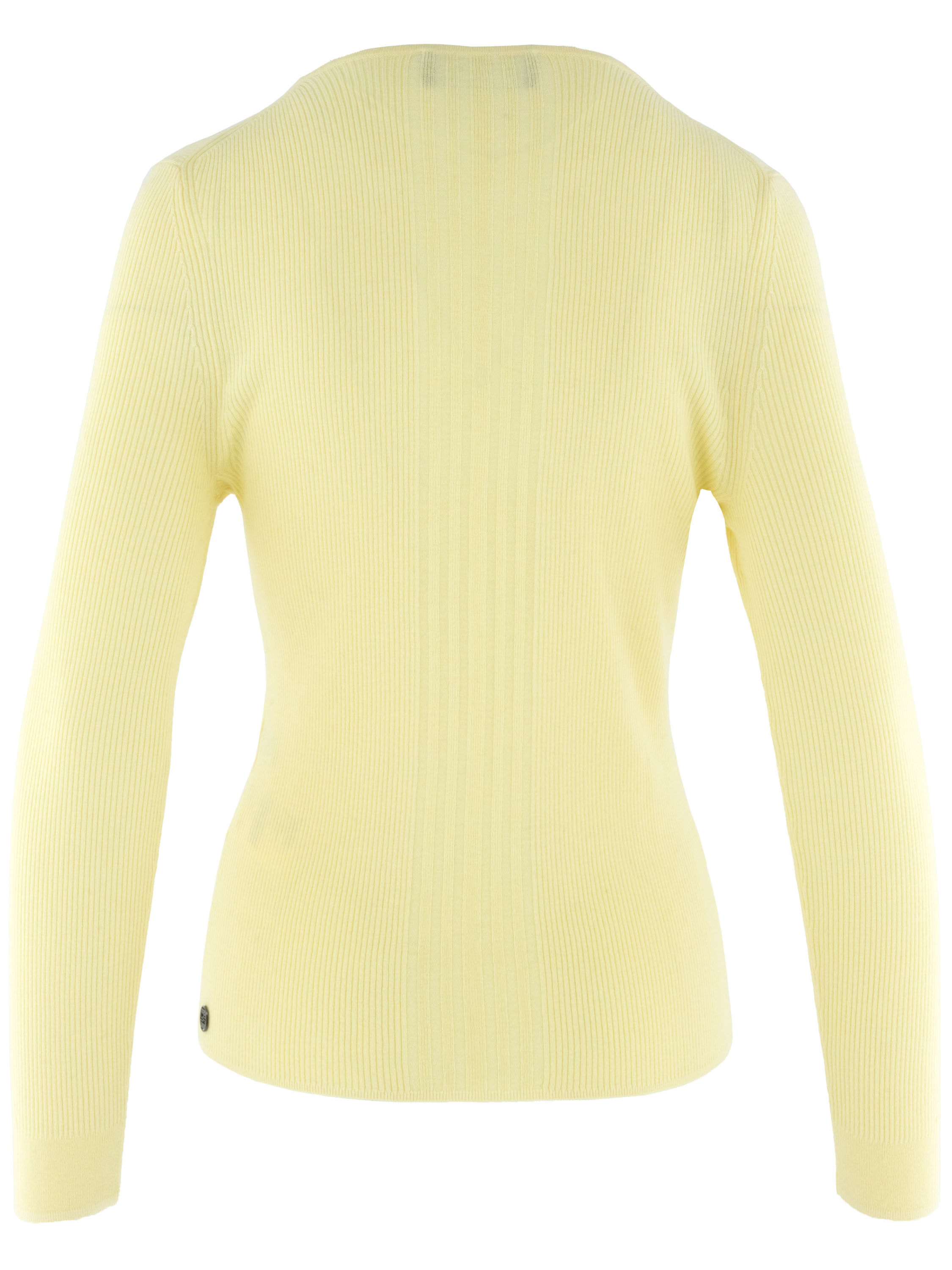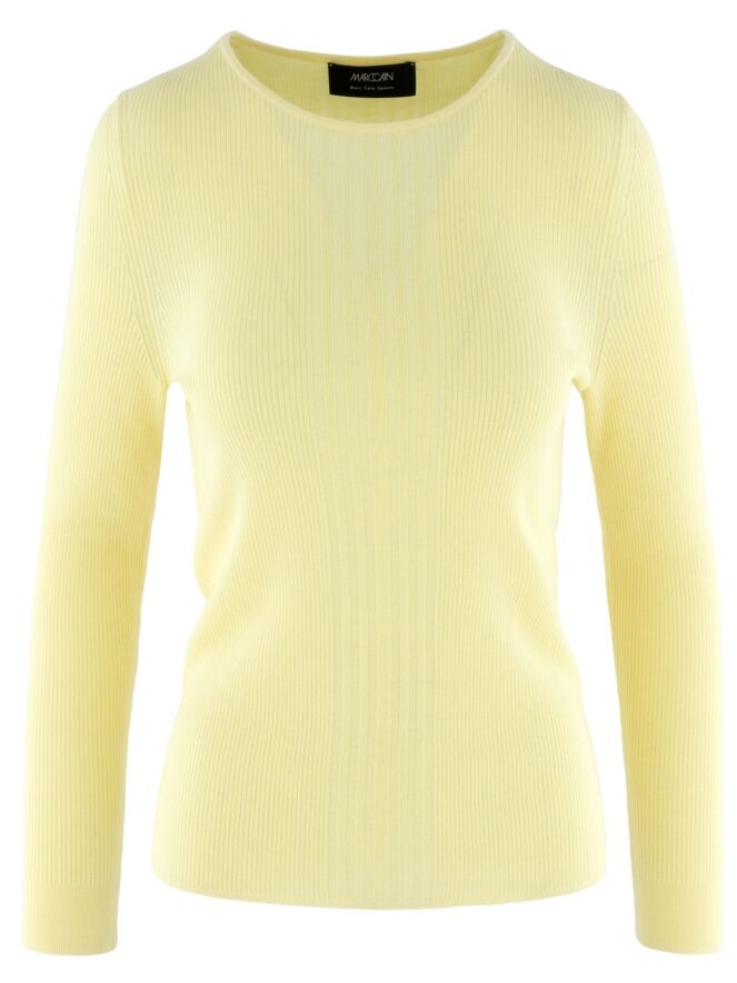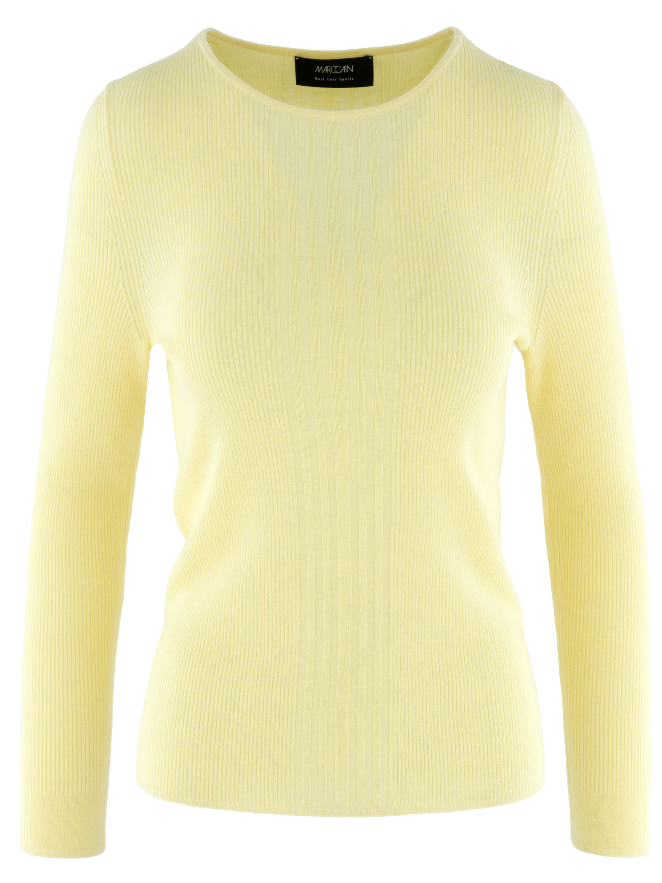 Ein Pullover von Marc Cain in Gelb. Der Stoff ist fein gerippt, mit einem breiten Einsatz auf der Vorderseite, wo die Rippen breiter gearbeitet sind. Der Pullover hat einen Rundhalsausschnitt und lange Ärmel. Dieser Pullover kann per Hand gewaschen werden.
