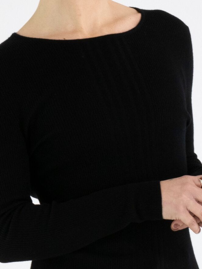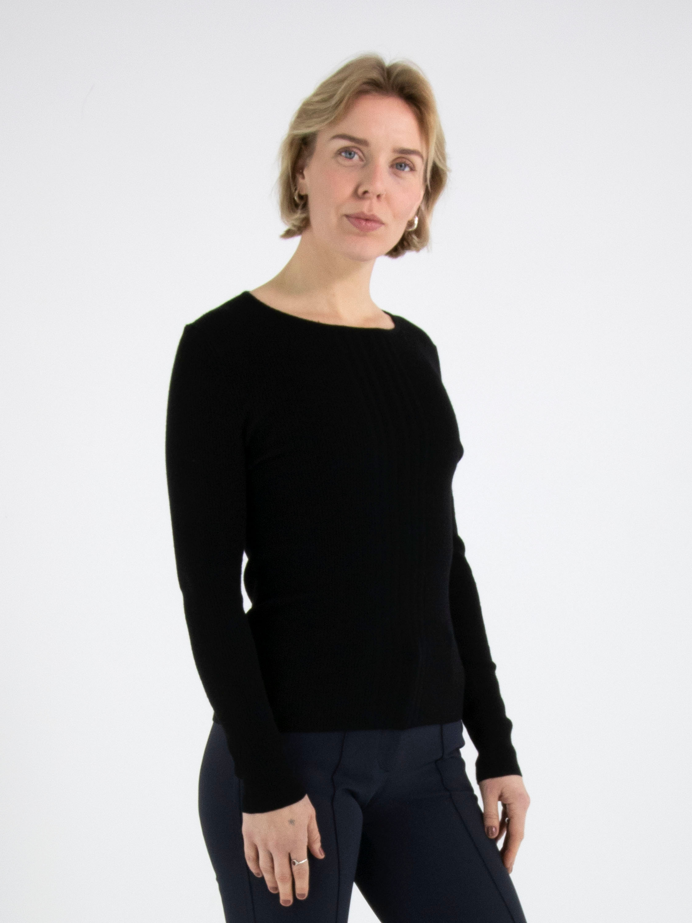 Ein Pullover von Marc Cain in Schwarz. Der Stoff ist fein gerippt, mit einem breiten Einsatz vorne, bei dem die Rippen breiter gearbeitet sind. Der Pullover hat einen Rundhalsausschnitt und lange Ärmel. Dieser Pullover kann per Hand gewaschen werden.