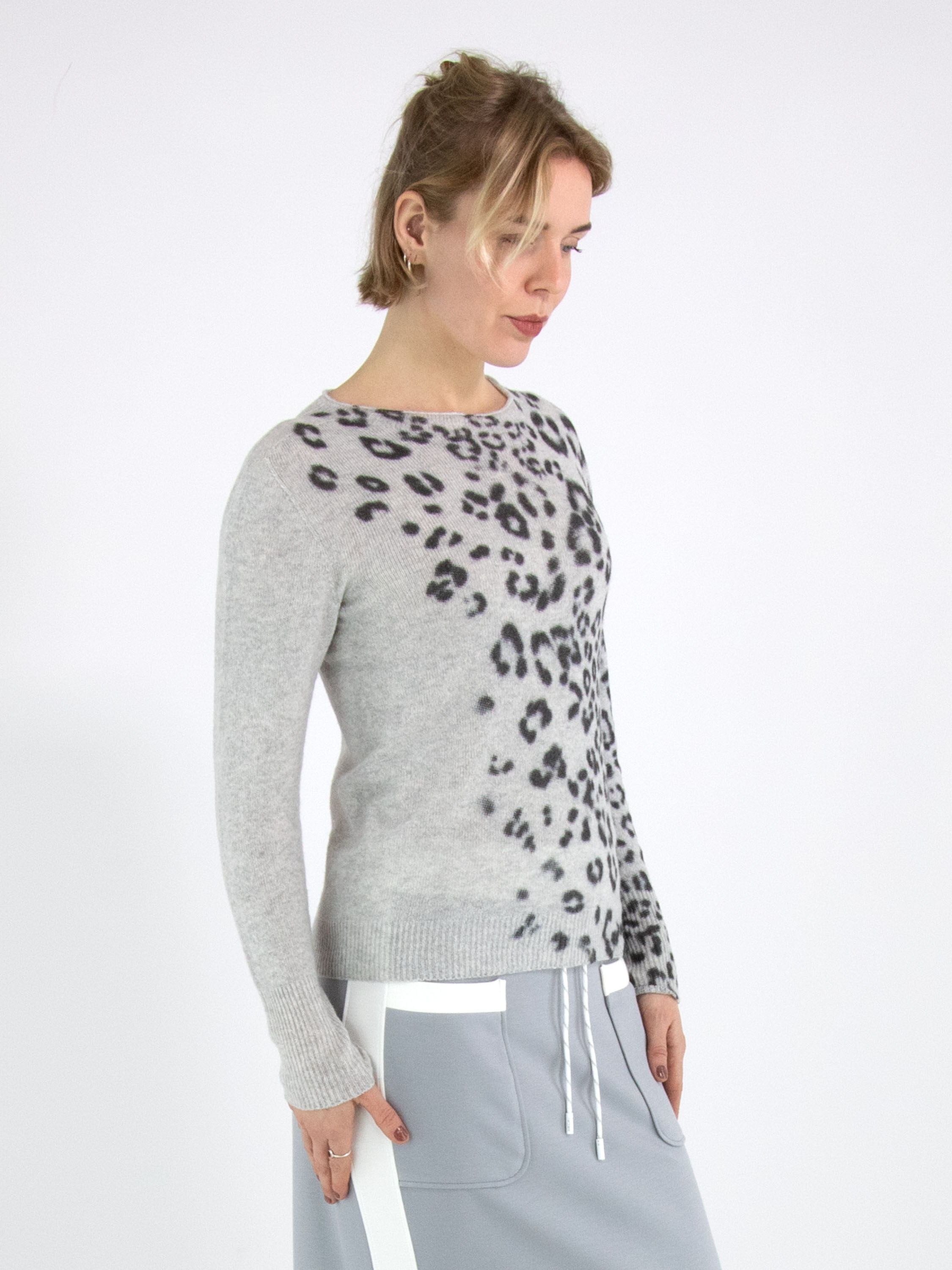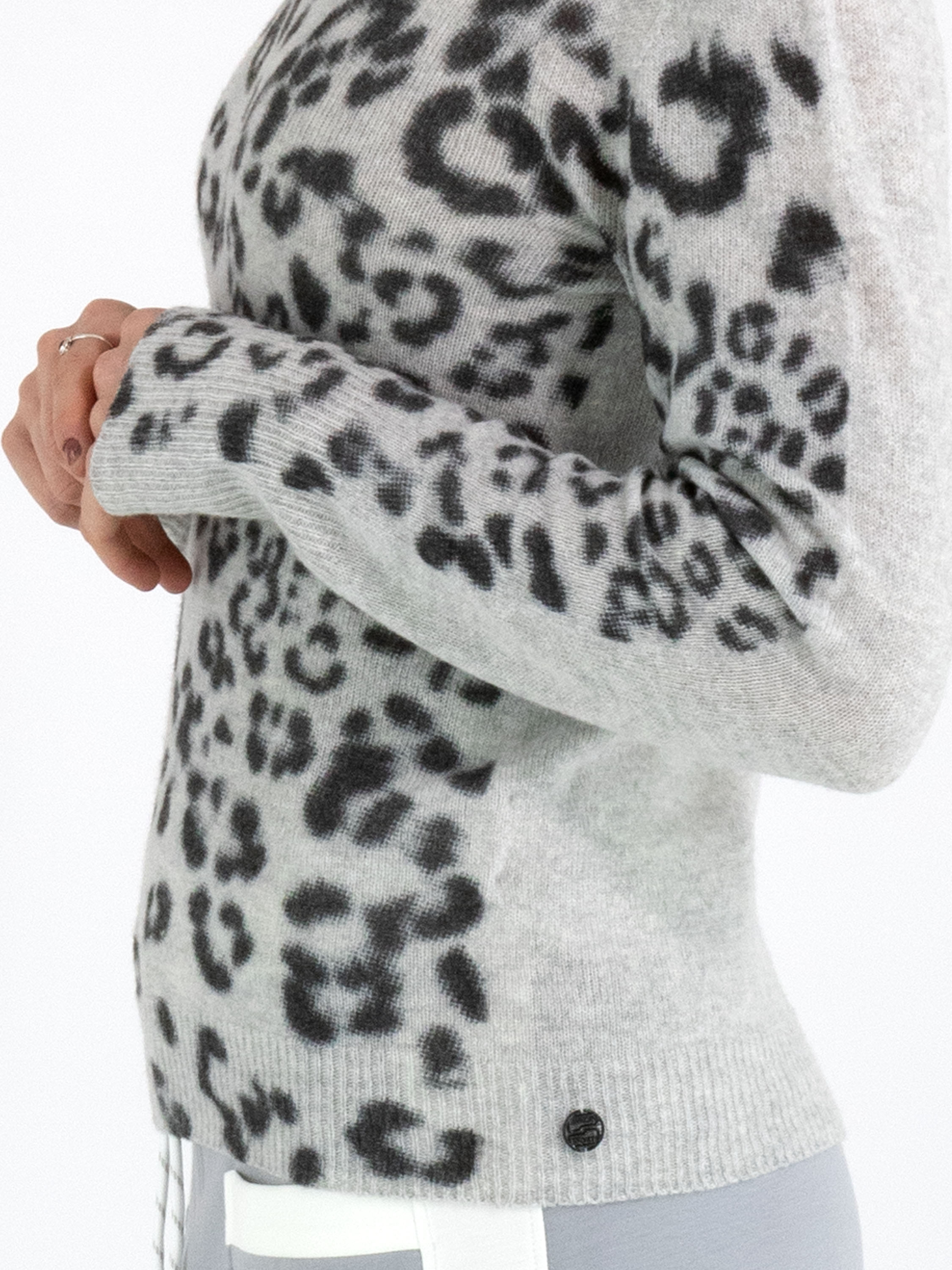 Ein luxuriöser Pullover von Marc Cain mit einem schwarzen Leopardenprint auf hellgrauem Hintergrund auf der Vorderseite. Die Rückseite ist in Uni-Grau gehalten. Der Pullover hat einen Rundhalsausschnitt und kann per Hand gewaschen werden.