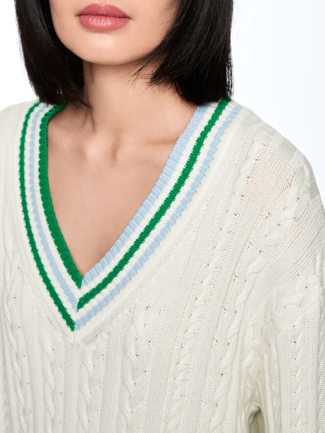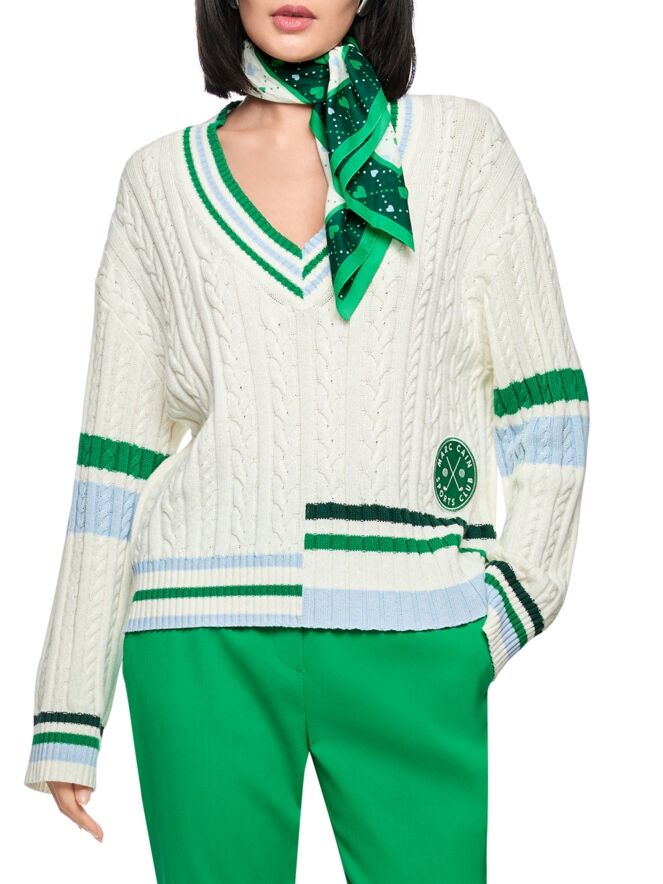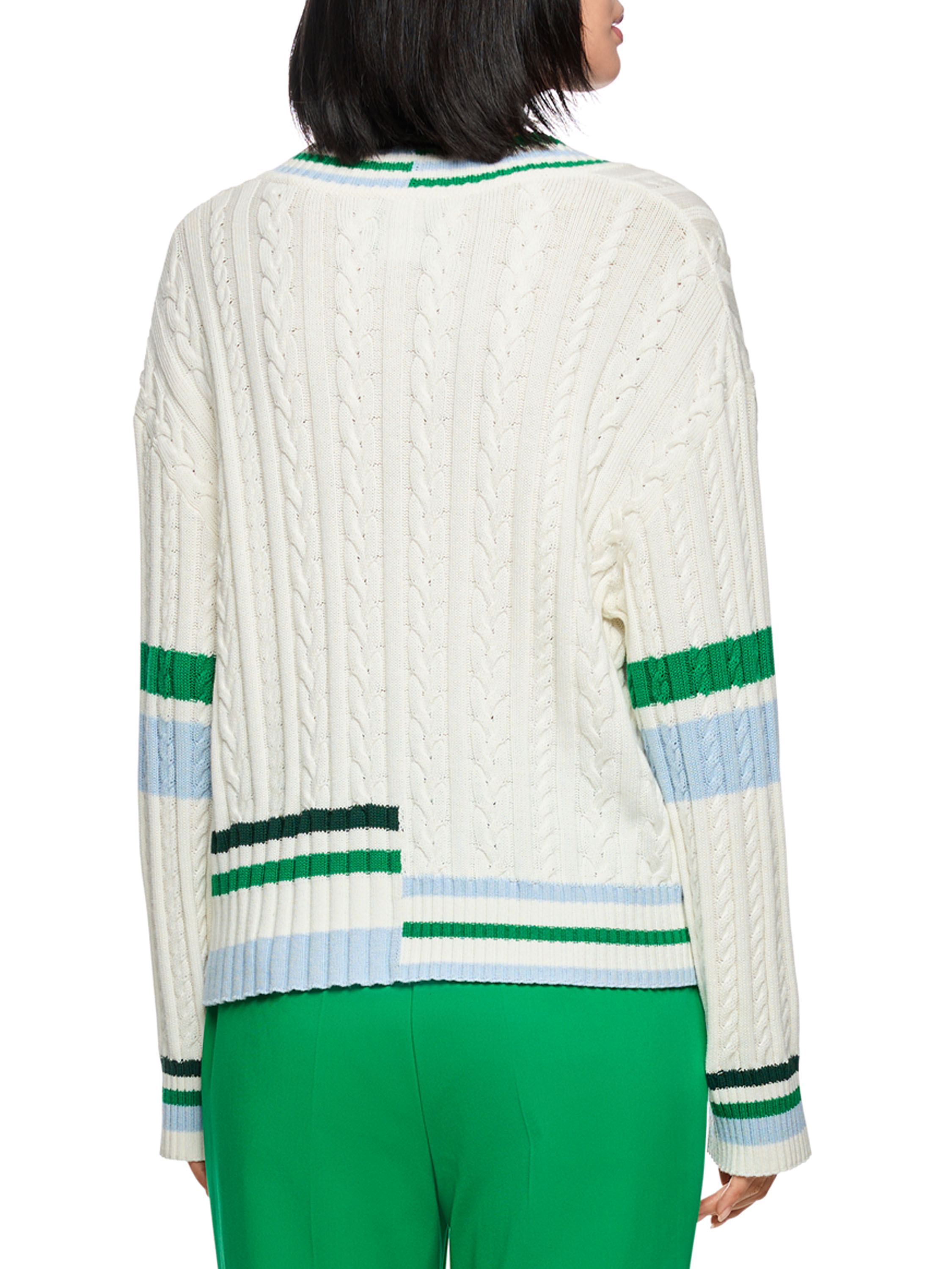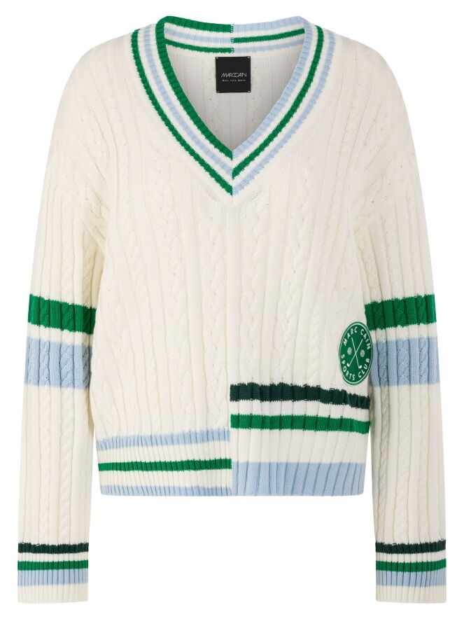Ein Zopfpullover von Marc Cain in Cremeweiß. Entlang des V-Ausschnitts, am Saum und an den Abschlüssen der langen Ärmel ist ein geripptes Strickbündchen mit Streifenmuster in Blau, Hellgrün und Dunkelgrün gearbeitet. Auf Oberarmhöhe verläuft ein Streifen in Blau und Hellgrün. Auf der rechten Seite, auf Taillenhöhe, befindet sich ein Emblem mit der Aufschrift „Marc Cain Sports Club“. Dieser Pullover kann bei 30 Grad gewaschen werden.