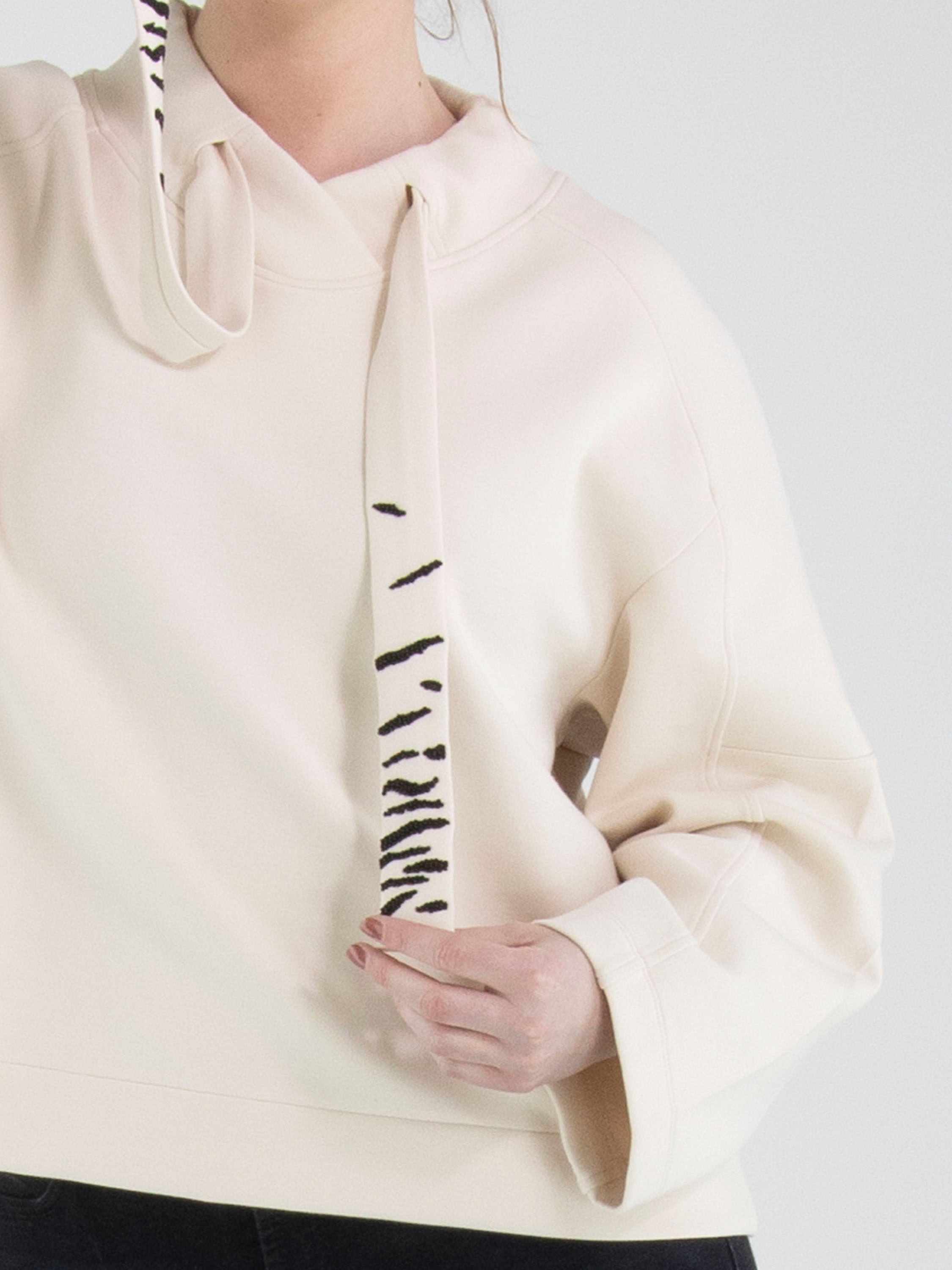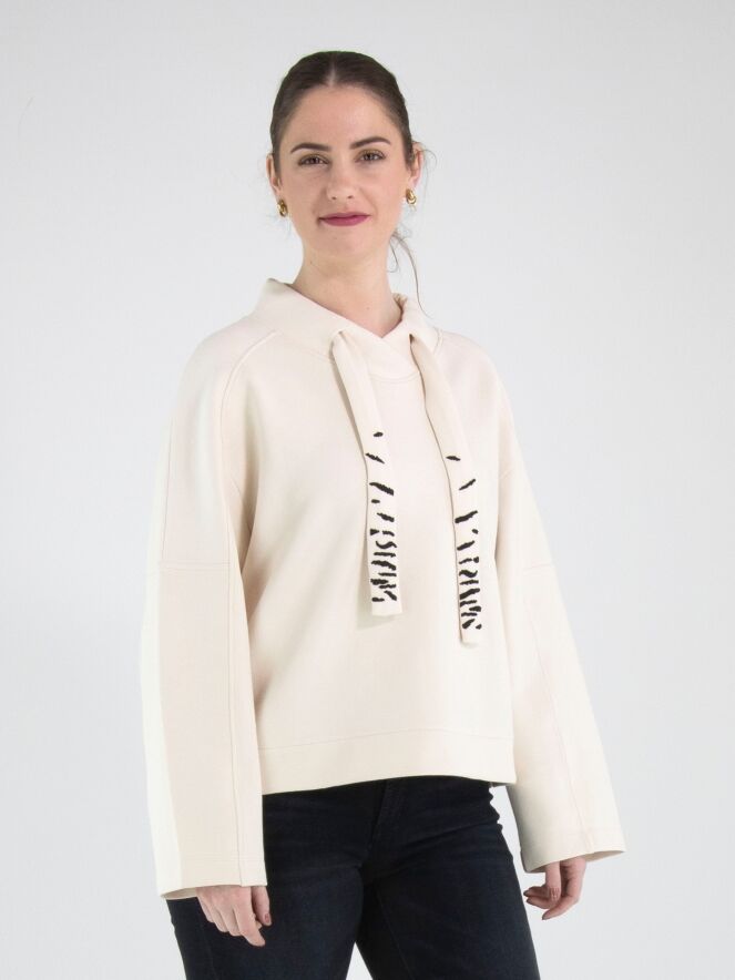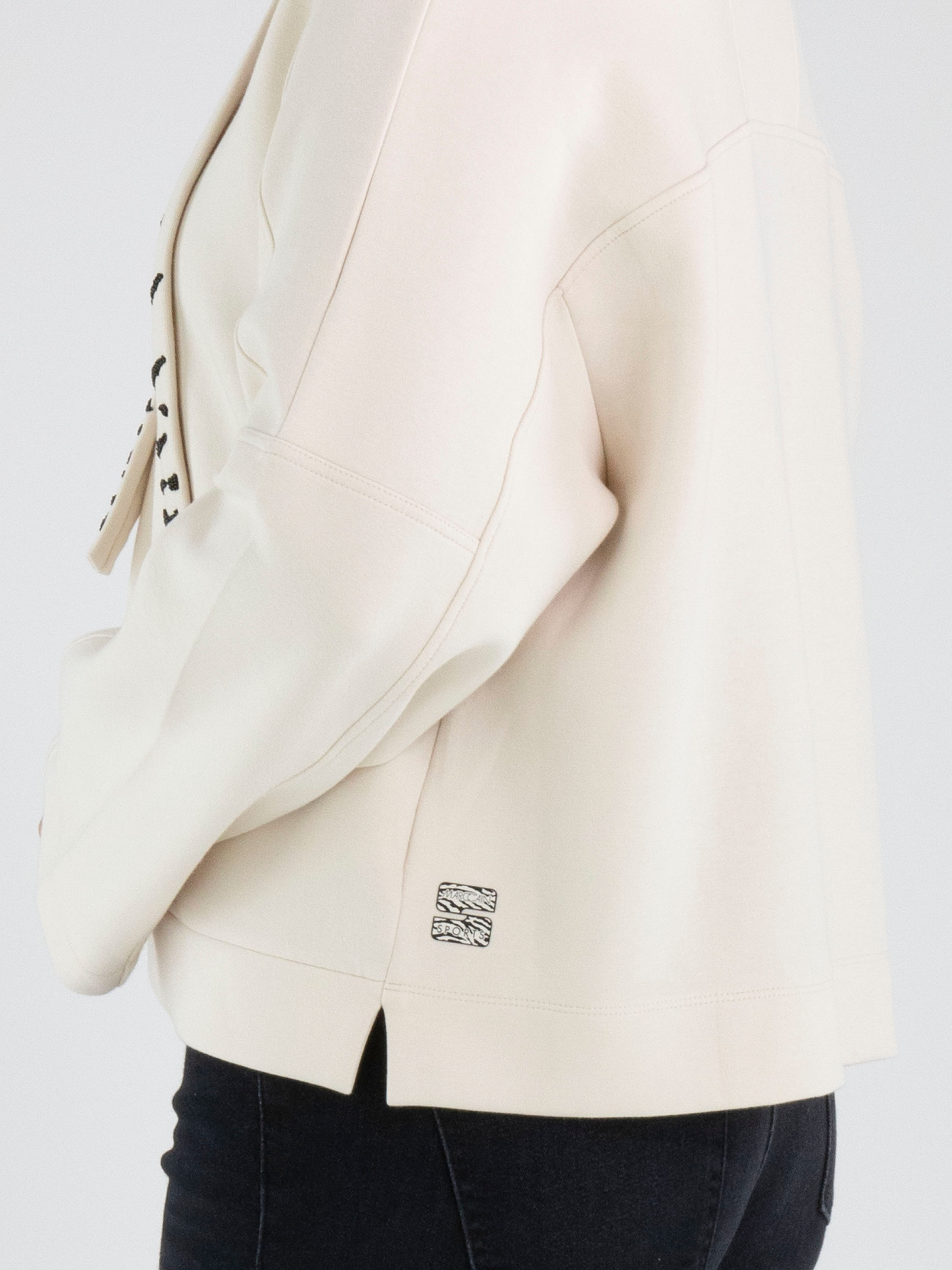 Ein Sweatshirt von Marc Cain in Beige. Vom Halsausschnitt verläuft ein beiges Band mit schwarzen Strasssteinen in einem Zebramuster. Dieses Sweatshirt kann bei 30 Grad gewaschen werden.