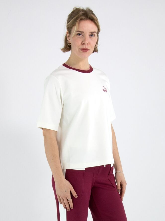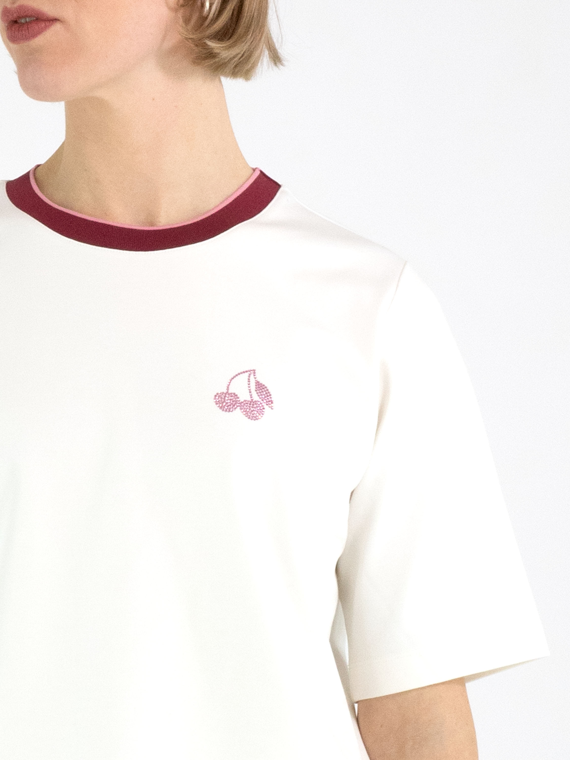 Ein weit und gerade geschnittenes Shirt von Marc Cain in Cremeweiß mit einem Kirschemblem aus Strasssteinen. Der Rundhalsausschnitt hat eine fein gerippte Strickblende im Streifenmuster in Bordeauxrot und Pastellrosa. Das Shirt hat kurze Ärmel und kann bei 30 Grad gewaschen werden.