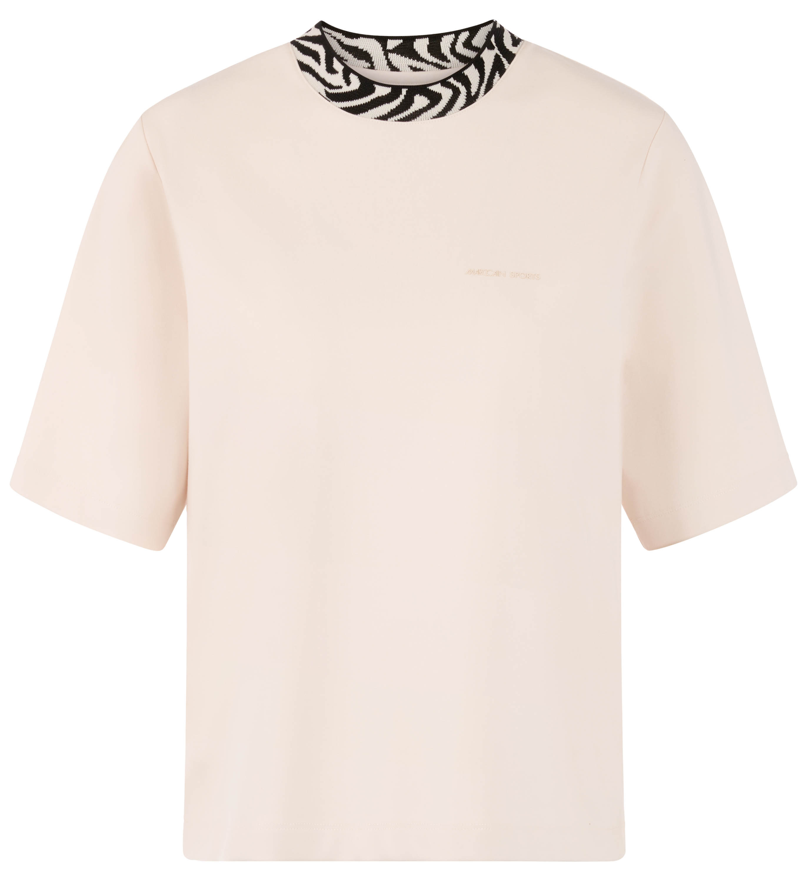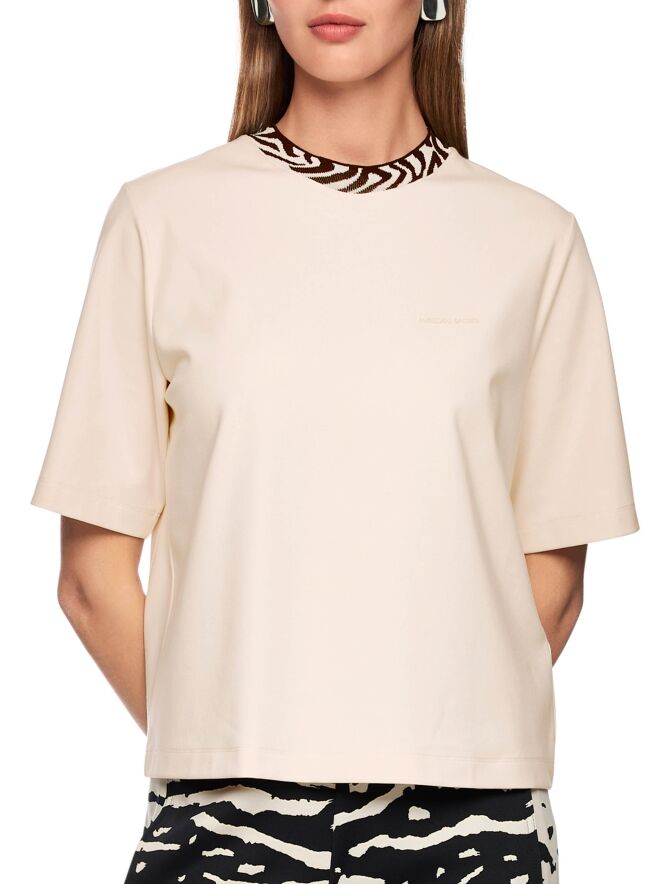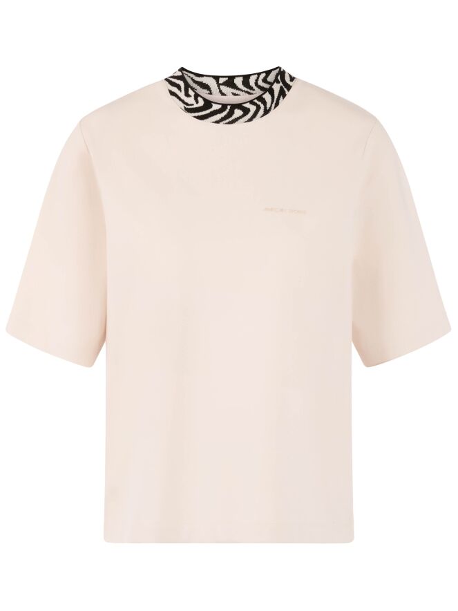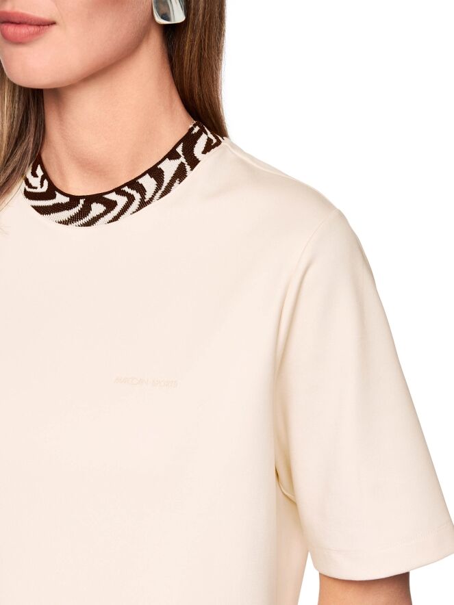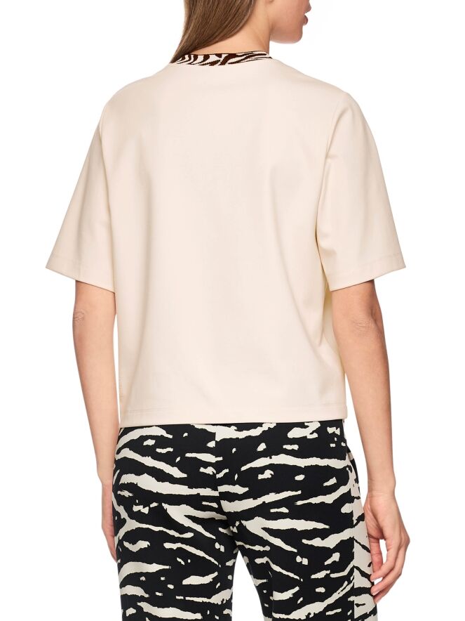 Ein Shirt von Marc Cain in Beige. Das Shirt hat kurze Ärmel. Am Rand des Rundhalsausschnitts befindet sich eine Biese im Zebramuster in Beige und Schwarz. Dieses Shirt kann bei 30 Grad gewaschen werden.