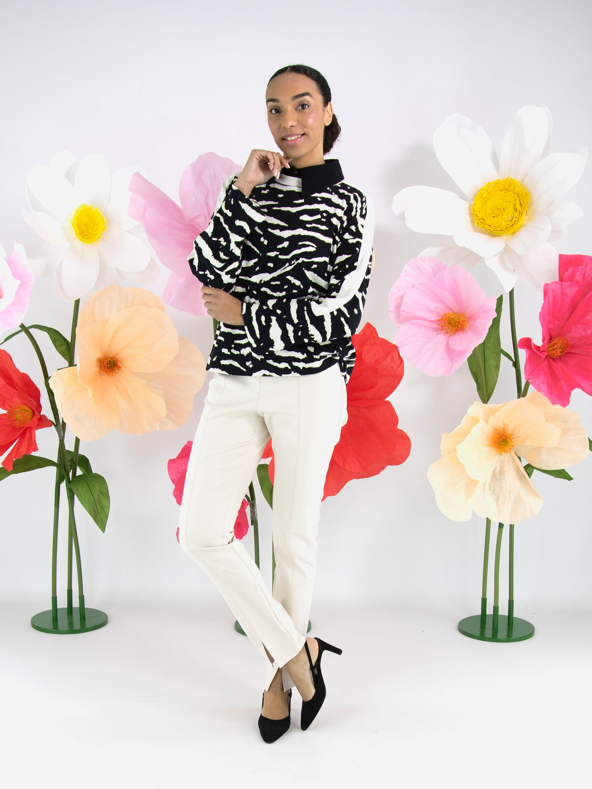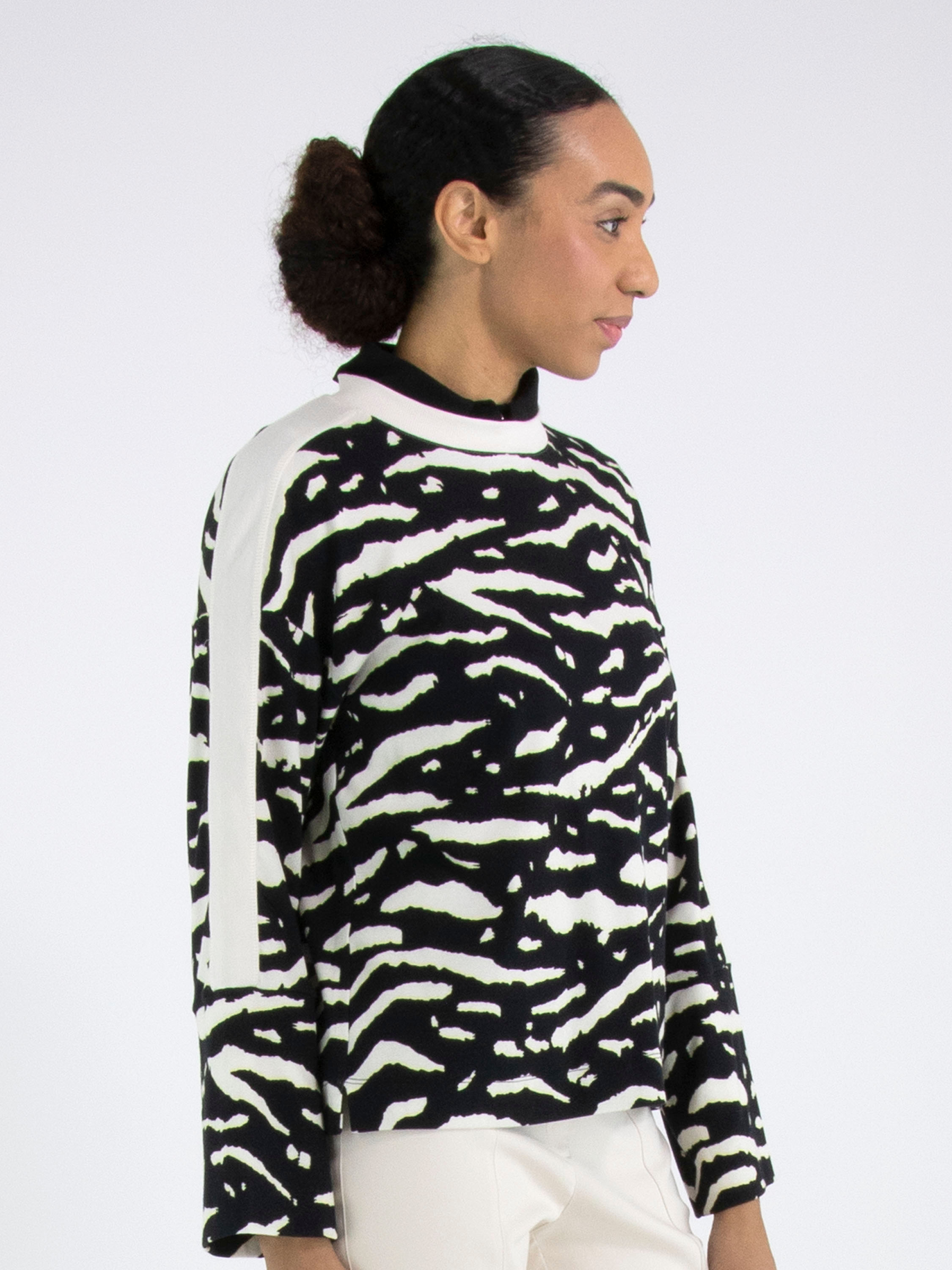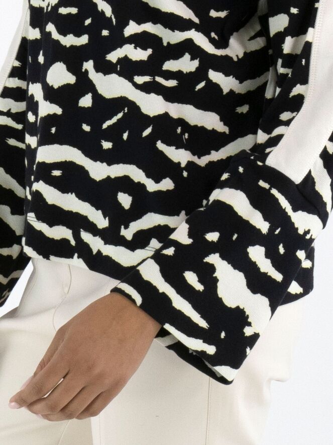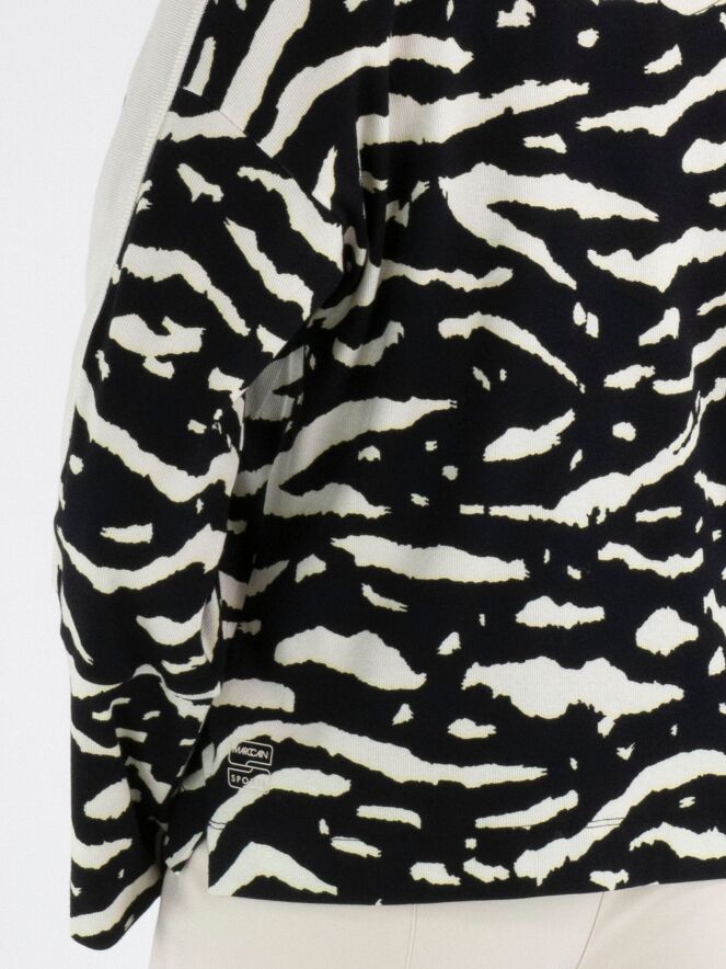 Ein weit geschnittenes Shirt von Marc Cain im Zebramuster in Schwarz und Beige. Der Stoff ist fein gerippt. Am Rundhalsausschnitt befindet sich ein fein gerippter Strickbund. Von den Schultern bis zur Mitte des Unterarms verläuft oben an den Ärmeln eine unifarbene beigefarbene Biese. Die langen Manschetten sind aus doppellagigem Stoff gefertigt. Dieses Shirt kann bei 30 Grad gewaschen werden.