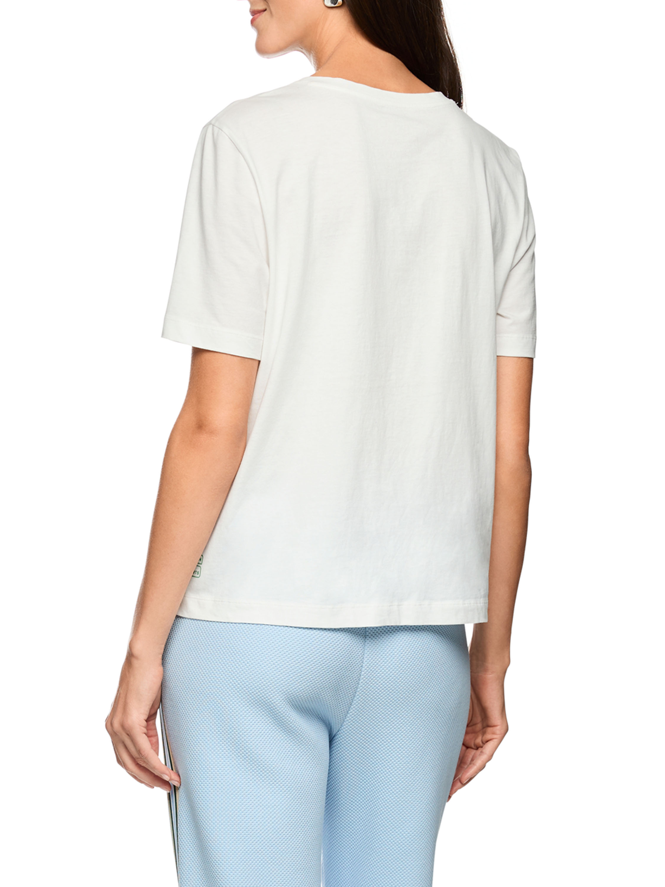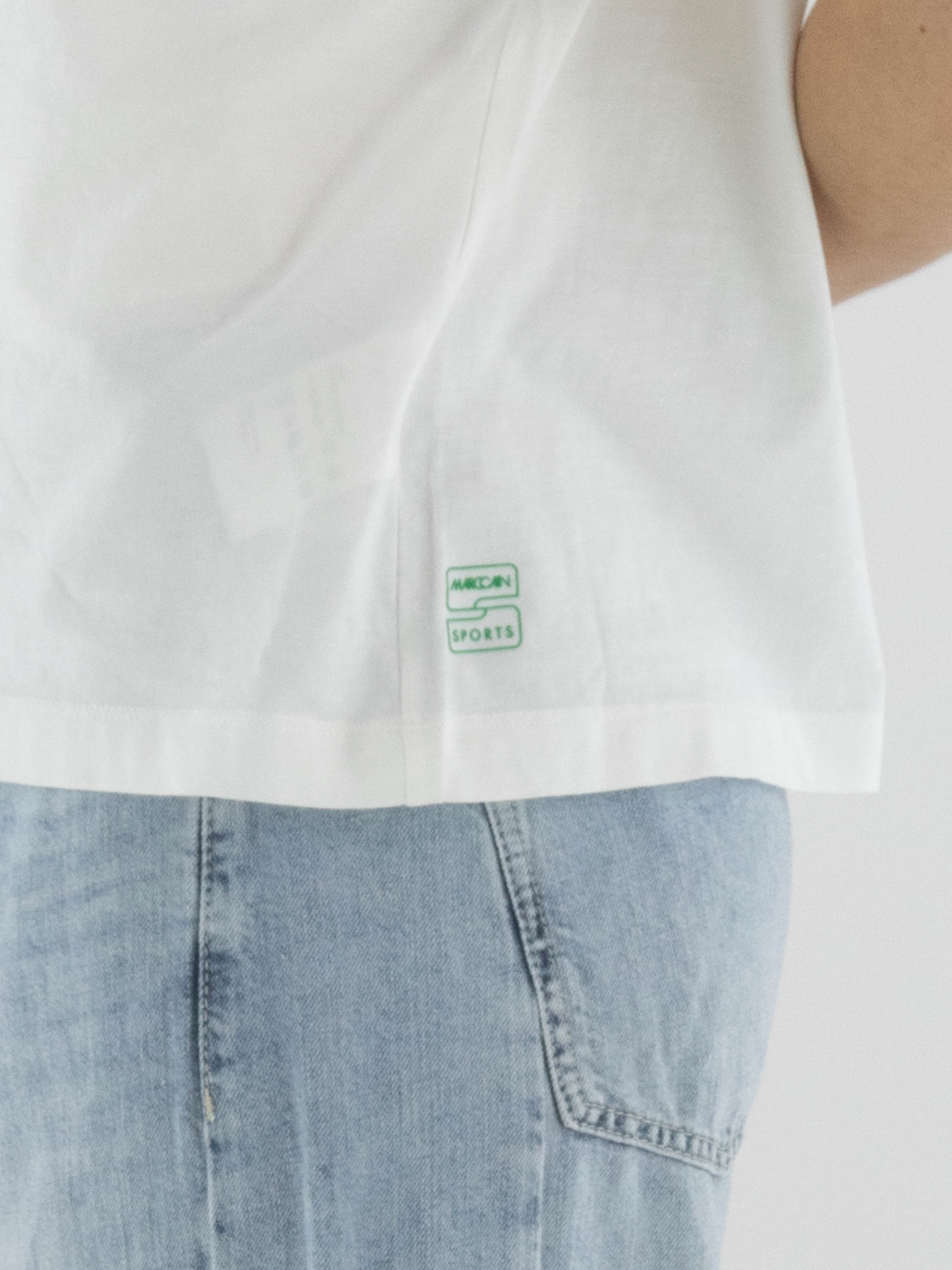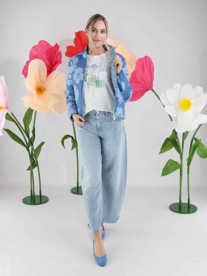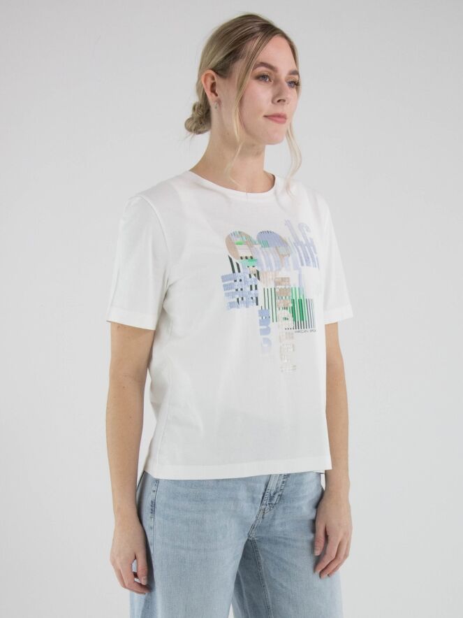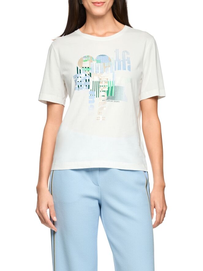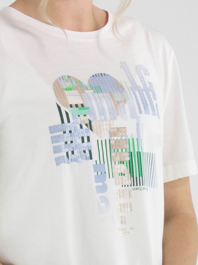 Shirt von Marc Cain mit grafischem Print und dezent eingearbeiteten transparenten Pailletten in Blau-, Grün- und Beigetönen auf weißem Grund. Mit Rundhalsausschnitt und kurzen Ärmeln überzeugt es durch eine frische, moderne Ausstrahlung. Dieses exklusive Designeroberteil kann bei 30 Grad gewaschen werden.