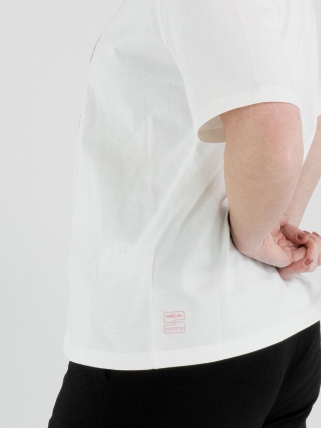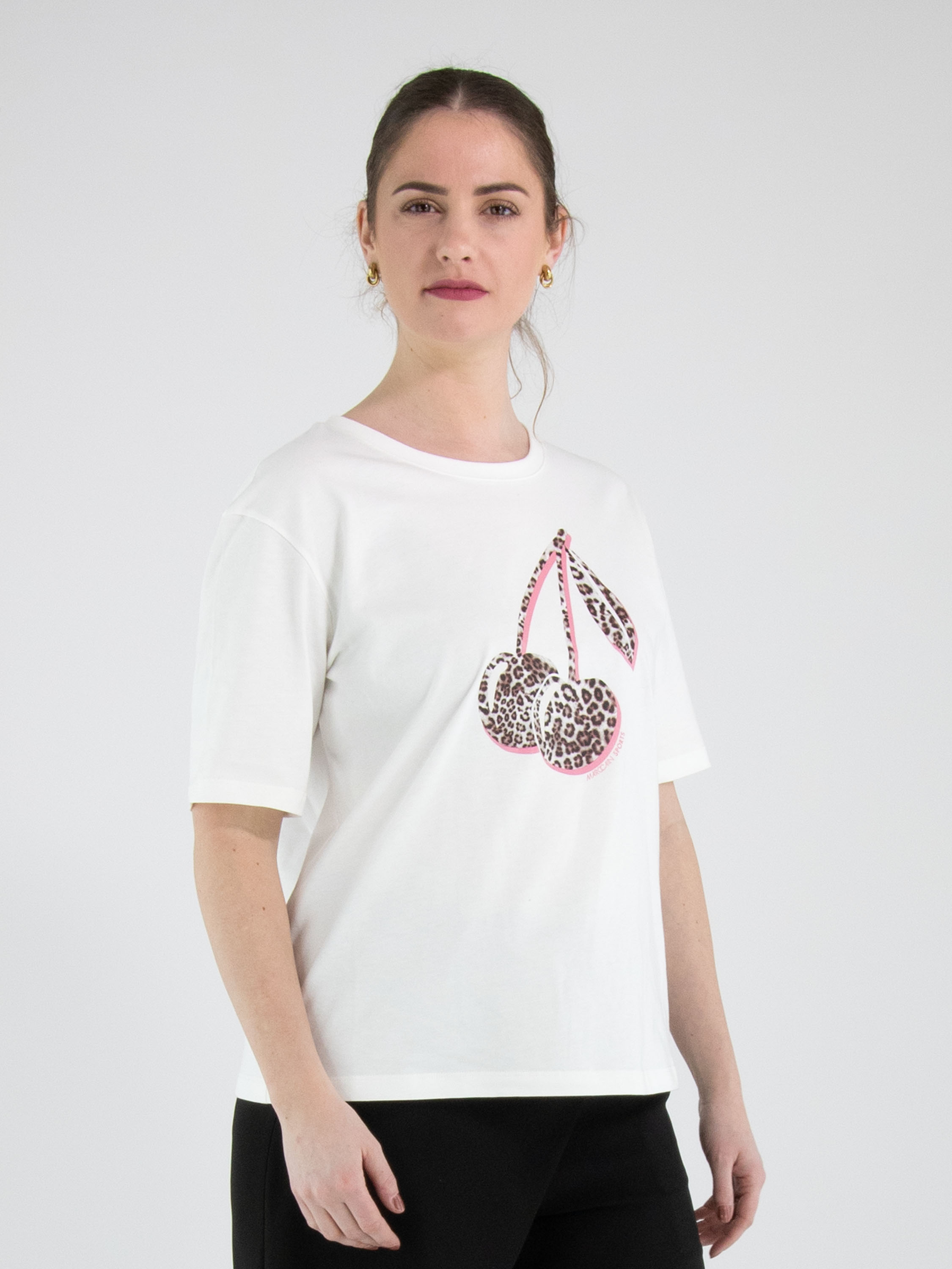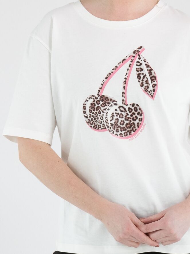 Ein weit und gerade geschnittenes Shirt von Marc Cain in Weiß. Auf der Vorderseite befindet sich eine dekorative Kirschgruppe im Leopardenprint, mit einer lachsfarbenen Biese entlang der Ränder der Kirschstiele. Das Shirt hat einen Rundhalsausschnitt und kurze Ärmel. Dieses Shirt kann bei 30 Grad gewaschen werden.