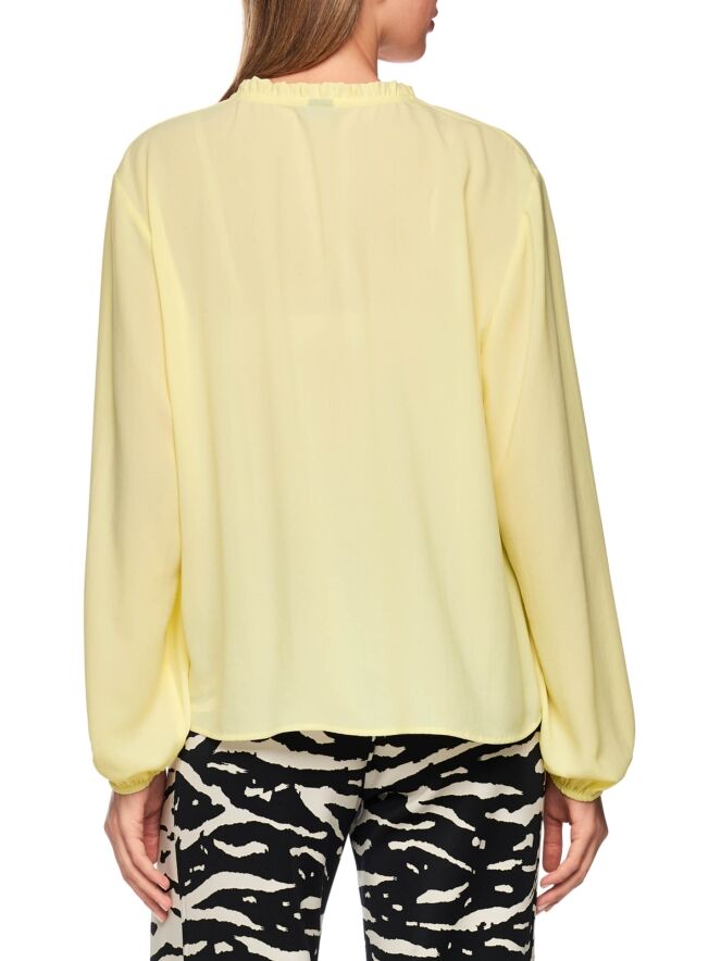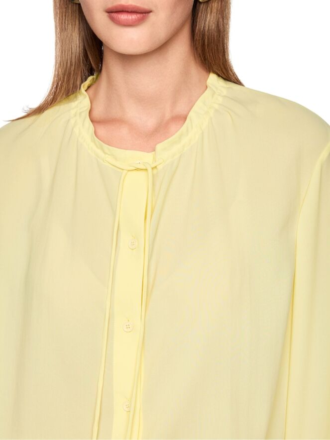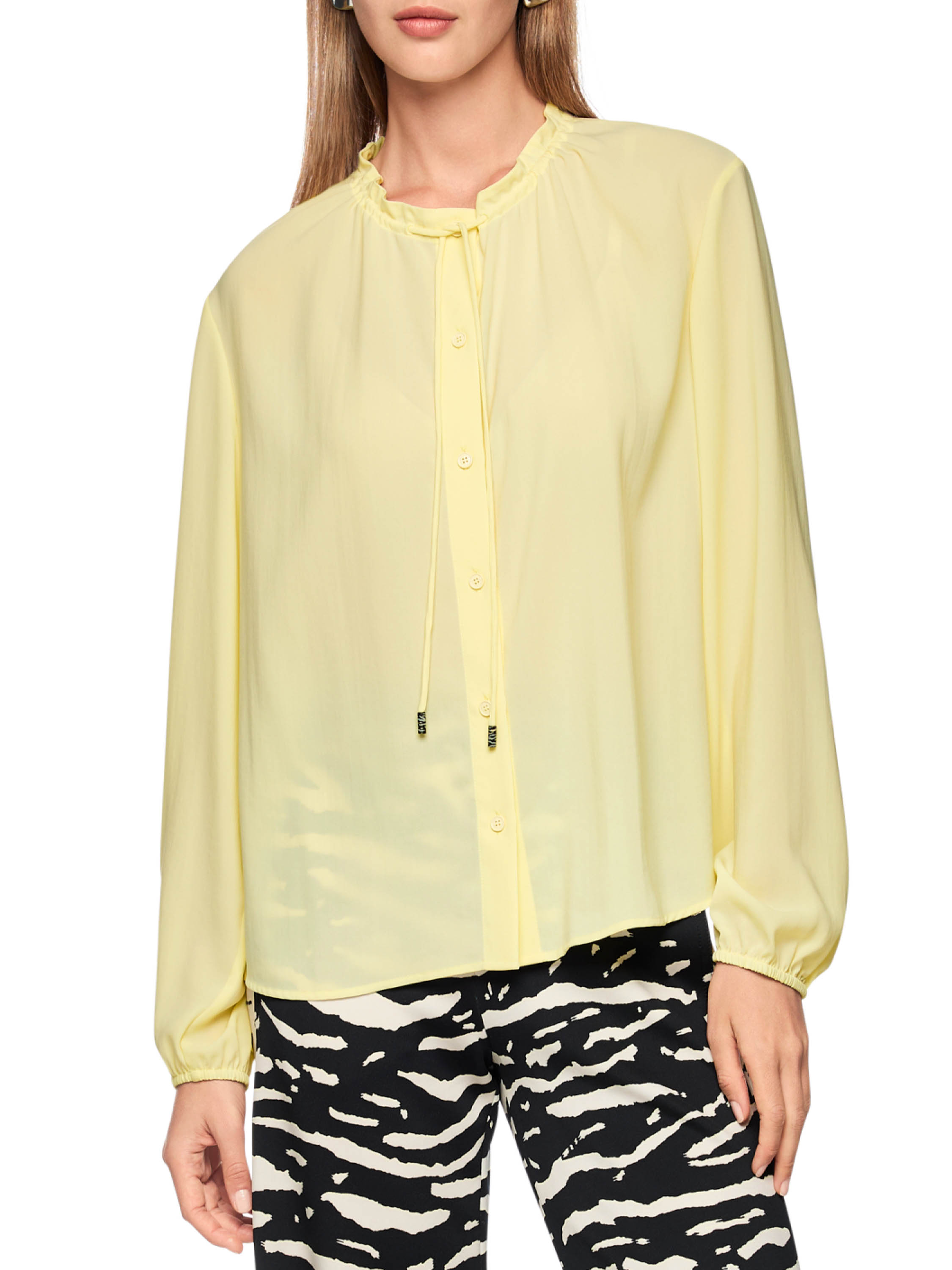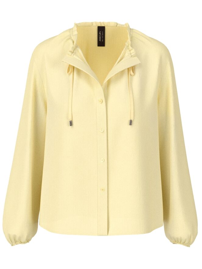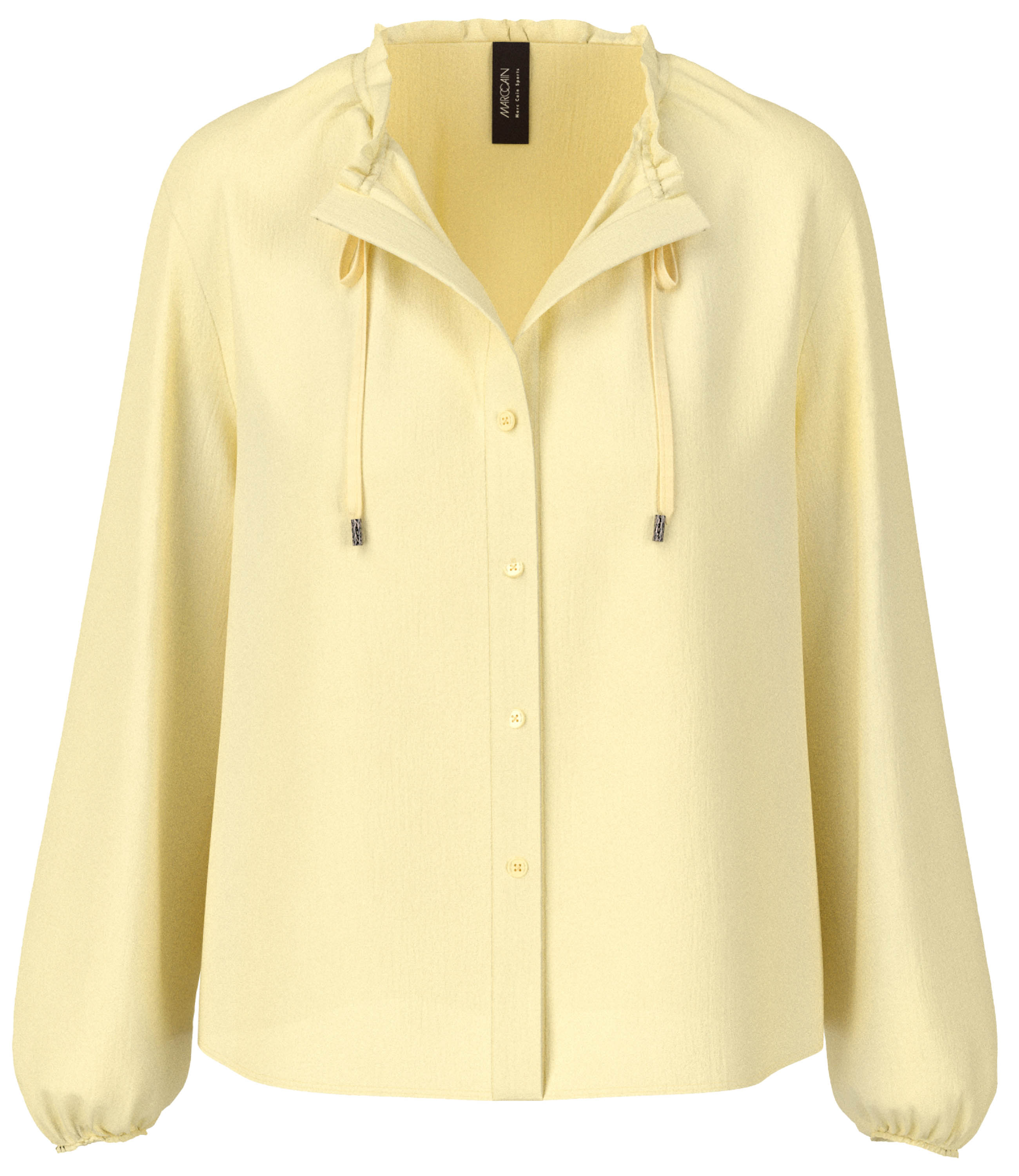 Eine Bluse von Marc Cain in Pastellgelb. Am Rand des Rundhalsausschnitts befindet sich eine dekorative Kordel in einer Tunnelverarbeitung, mit der ein Falt-Effekt erzeugt werden kann. Die Bluse hat lange Ärmel und kann bei 30 Grad gewaschen werden.