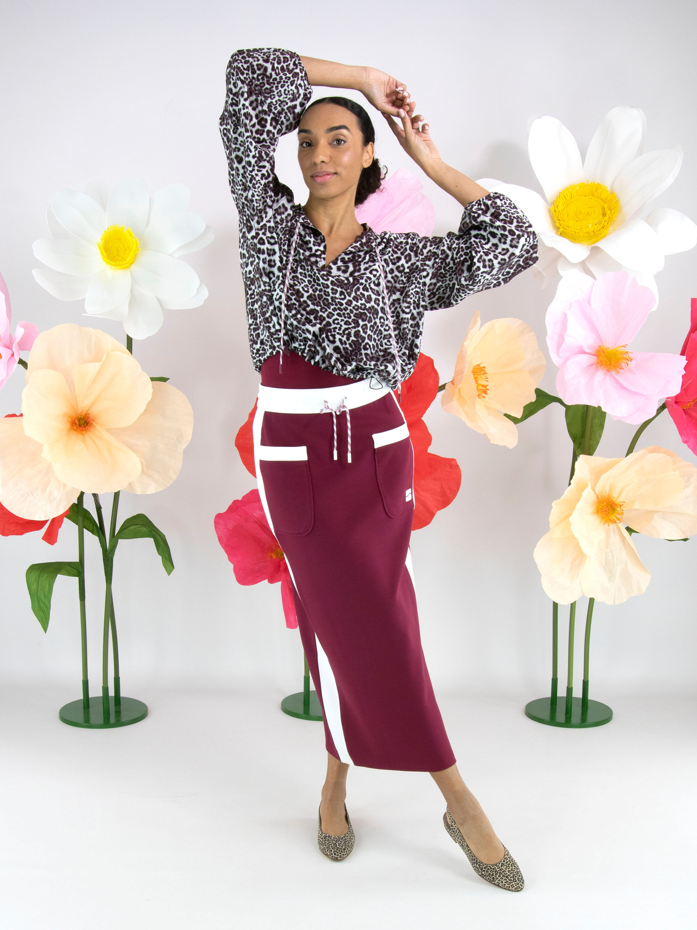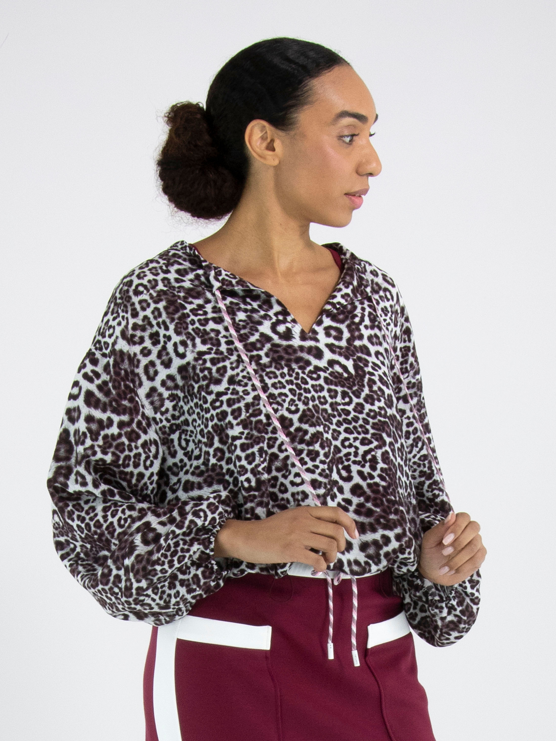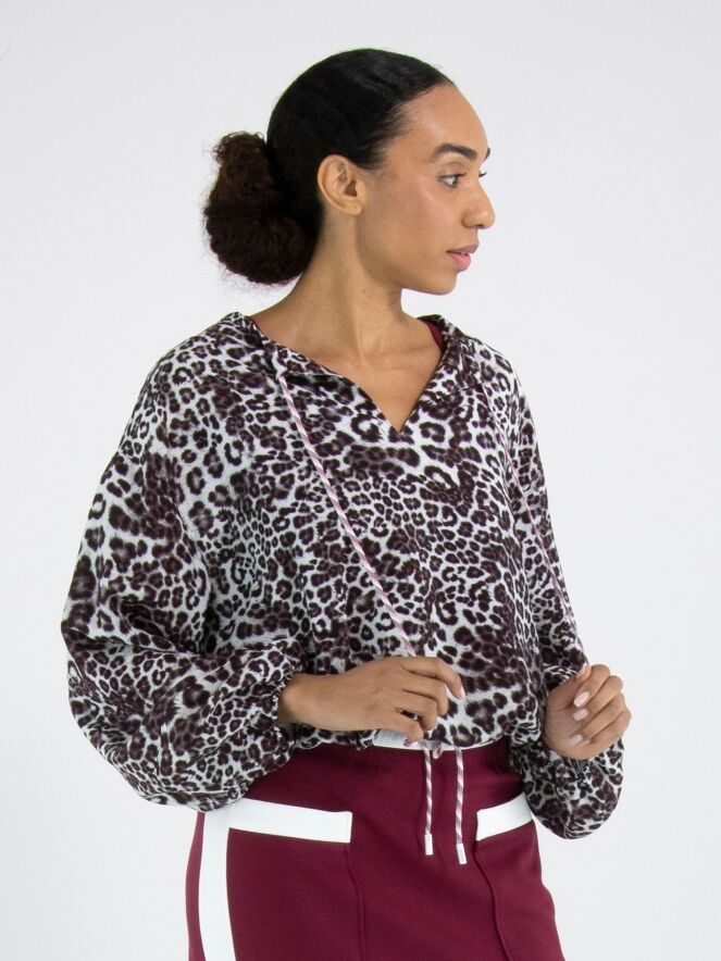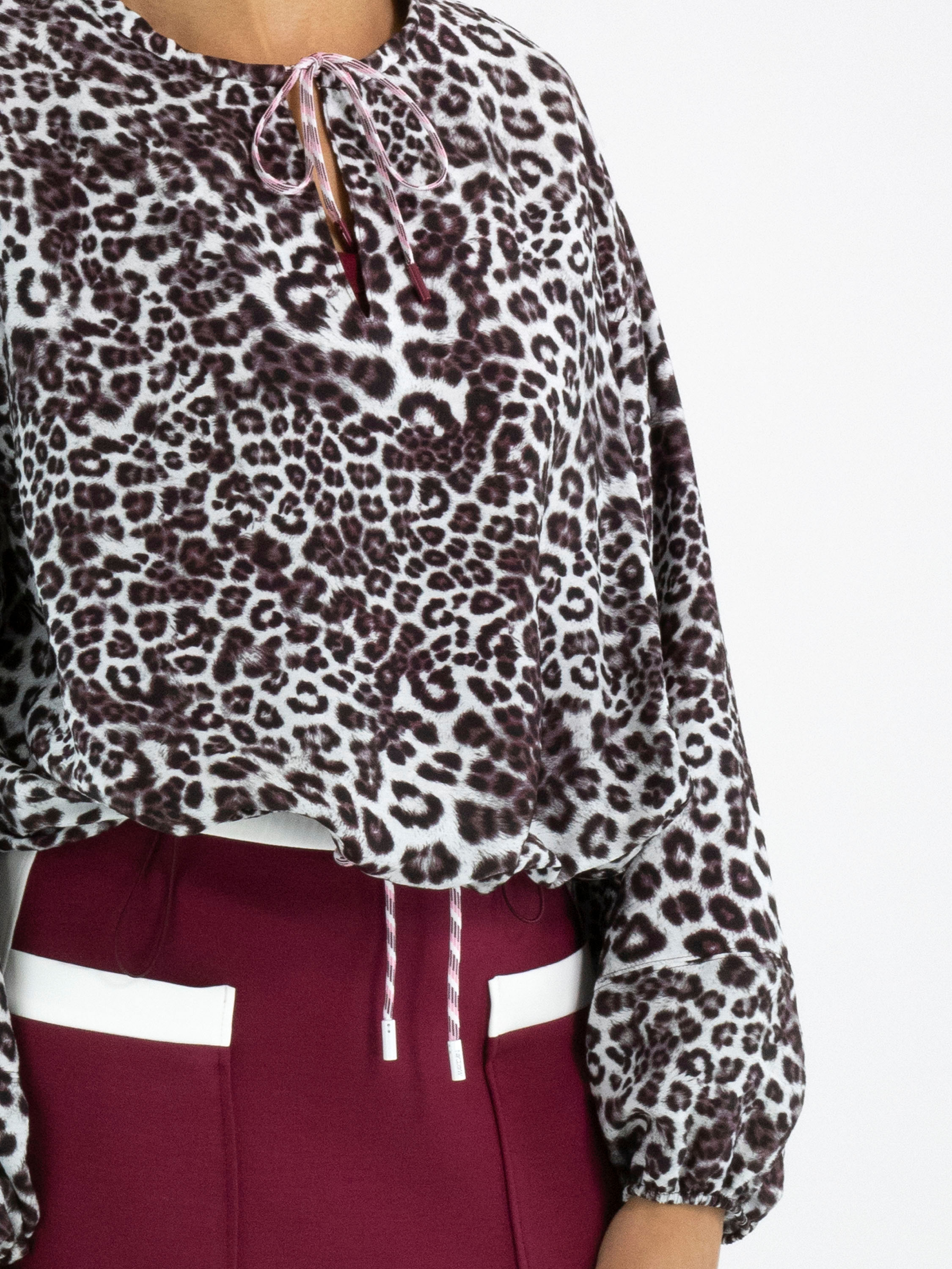 Eine kurze Bluse von Marc Cain im Leopardenprint in mehreren Grau-, Bordeaux- und Cremeweißtönen. Die Bluse hat einen V-Ausschnitt. Am Kragenrand verläuft ein Kordelzug in Tunnelverarbeitung. Am unteren Abschluss befindet sich eine fein gelegte Blende mit einem verstellbaren Kordelzug, mit dem ein zusätzlicher Falteneffekt erzeugt werden kann. Am Saum der langen Ärmel ist ein elastisches Band mit fein gelegtem Stoff eingearbeitet. Diese Bluse kann bei 30 Grad gewaschen werden.