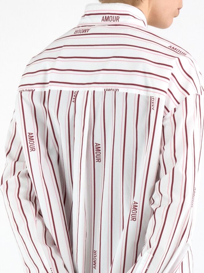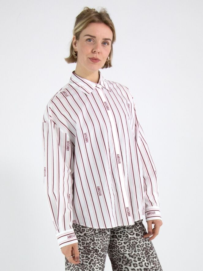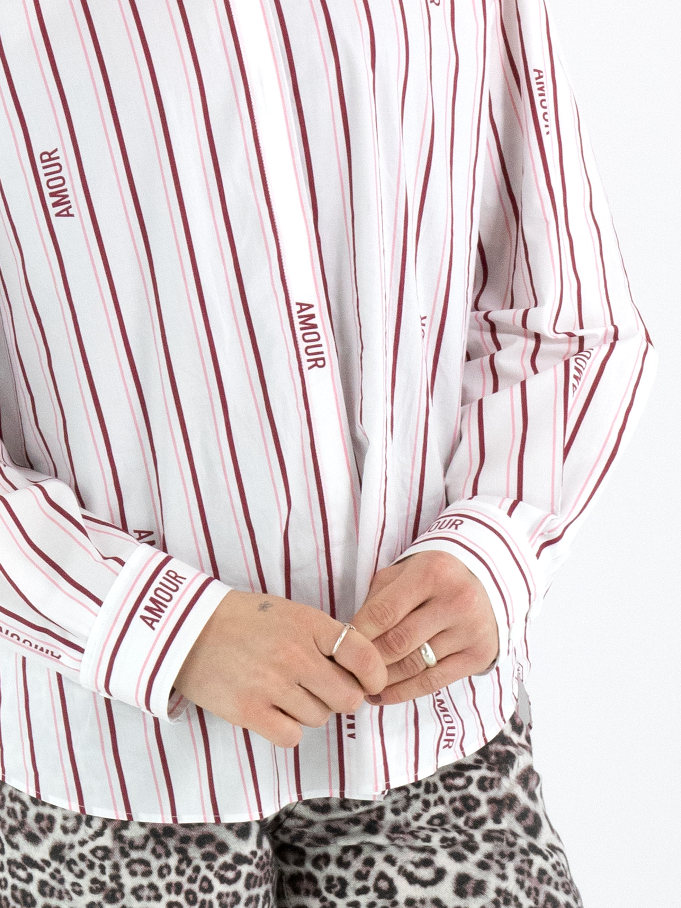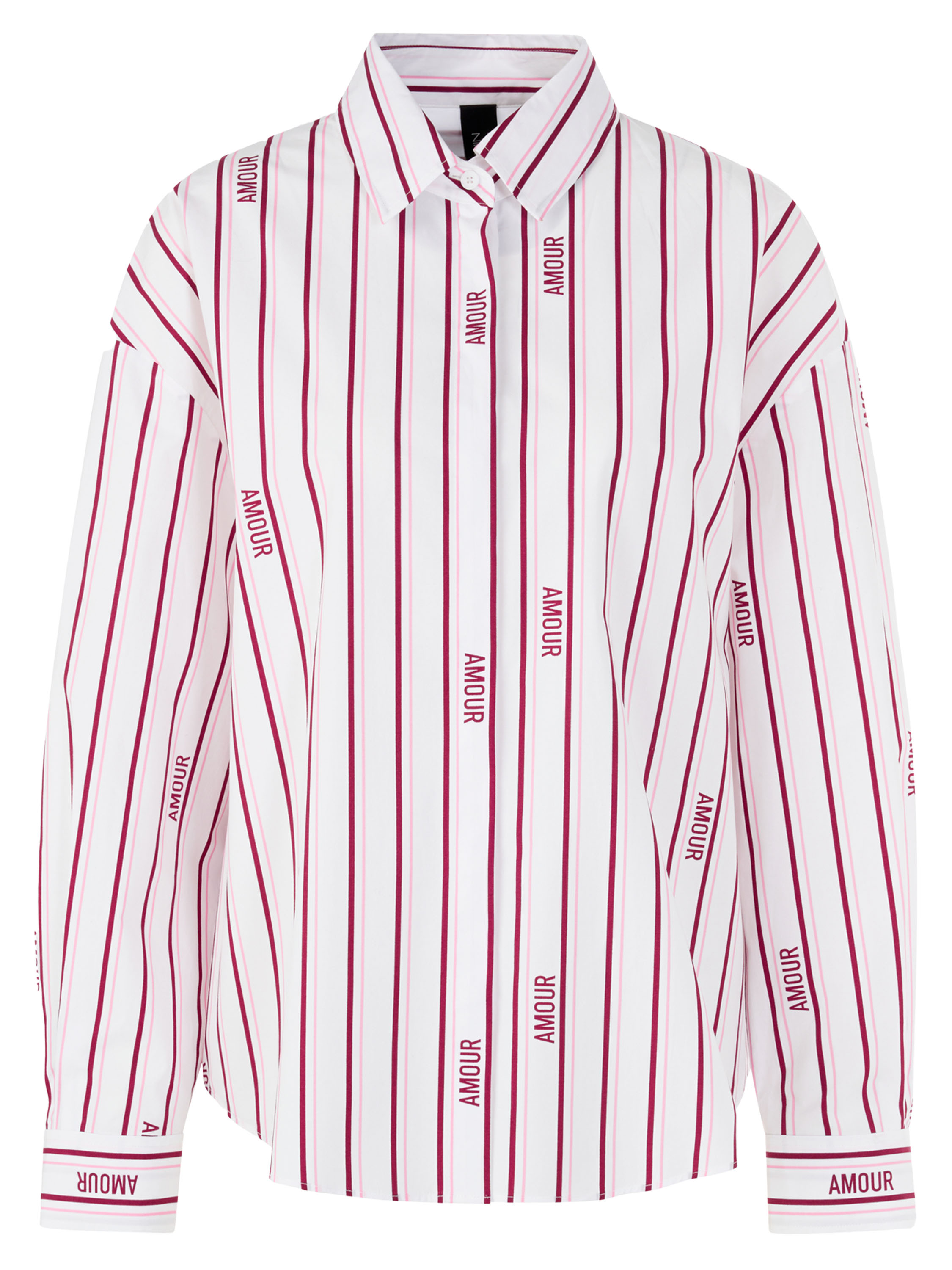 Eine Bluse von Marc Cain mit einem Streifenmuster in Bordeauxrot und Pastellrosa auf weißem Grund. Zwischen den Linien steht an mehreren Stellen das Wort amour. Die Bluse hat eine verdeckte Knopfleiste und lange Ärmel. Diese Bluse kann bei 30 Grad gewaschen werden.