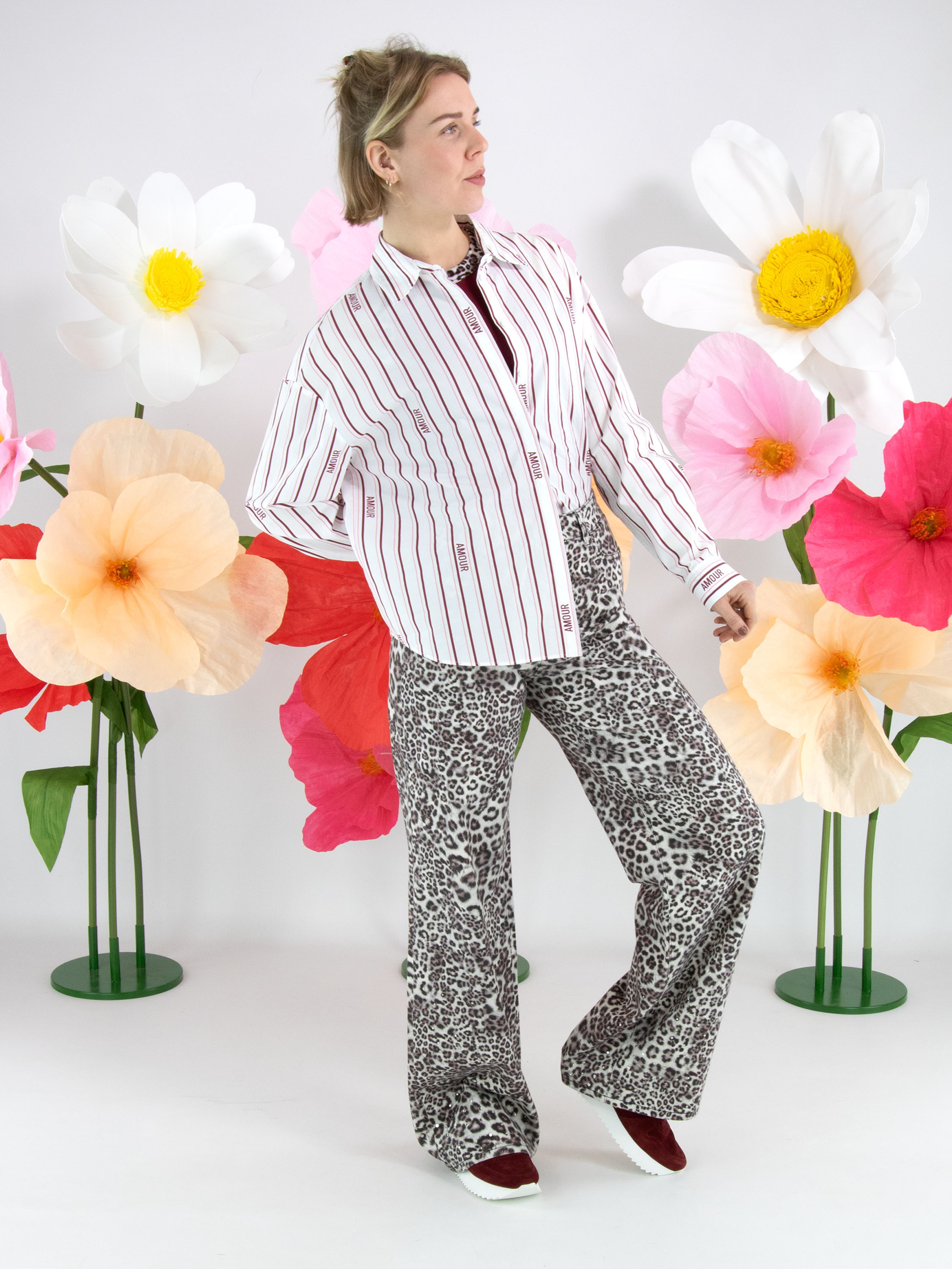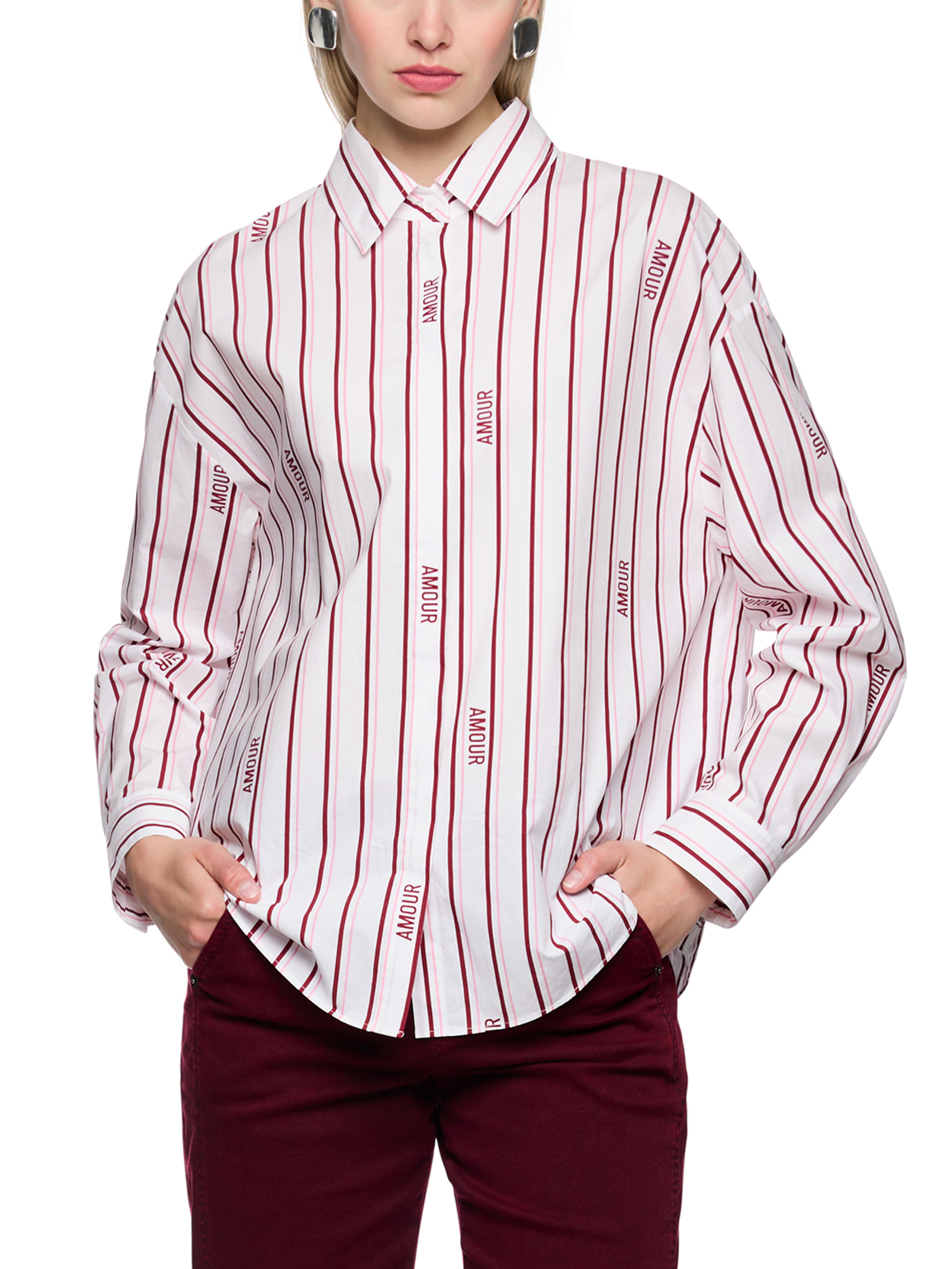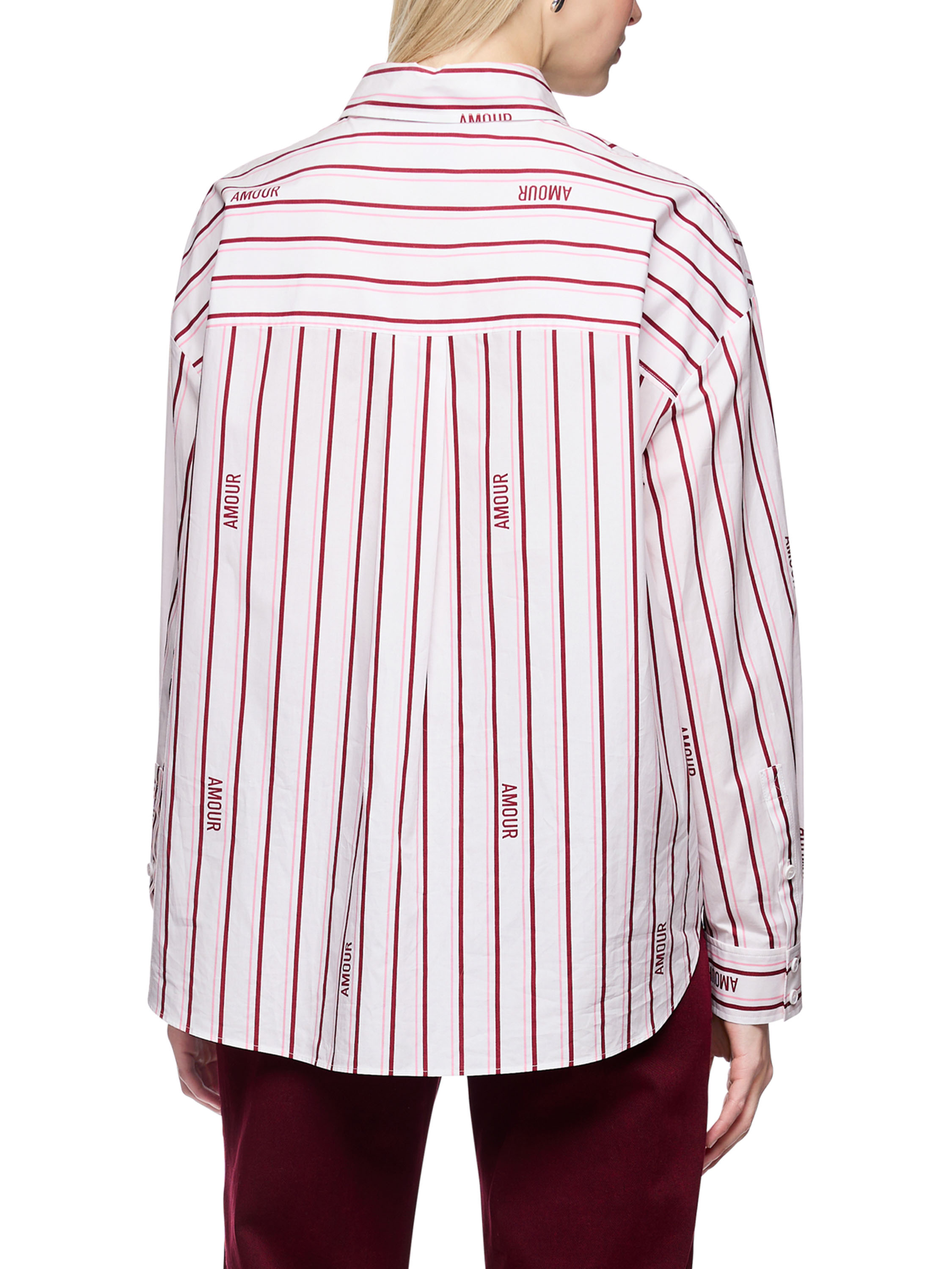 Eine Bluse von Marc Cain mit einem Streifenmuster in Bordeauxrot und Pastellrosa auf weißem Grund. Zwischen den Linien steht an mehreren Stellen das Wort amour. Die Bluse hat eine verdeckte Knopfleiste und lange Ärmel. Diese Bluse kann bei 30 Grad gewaschen werden.