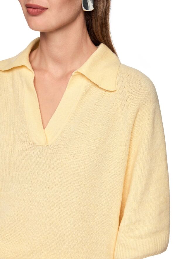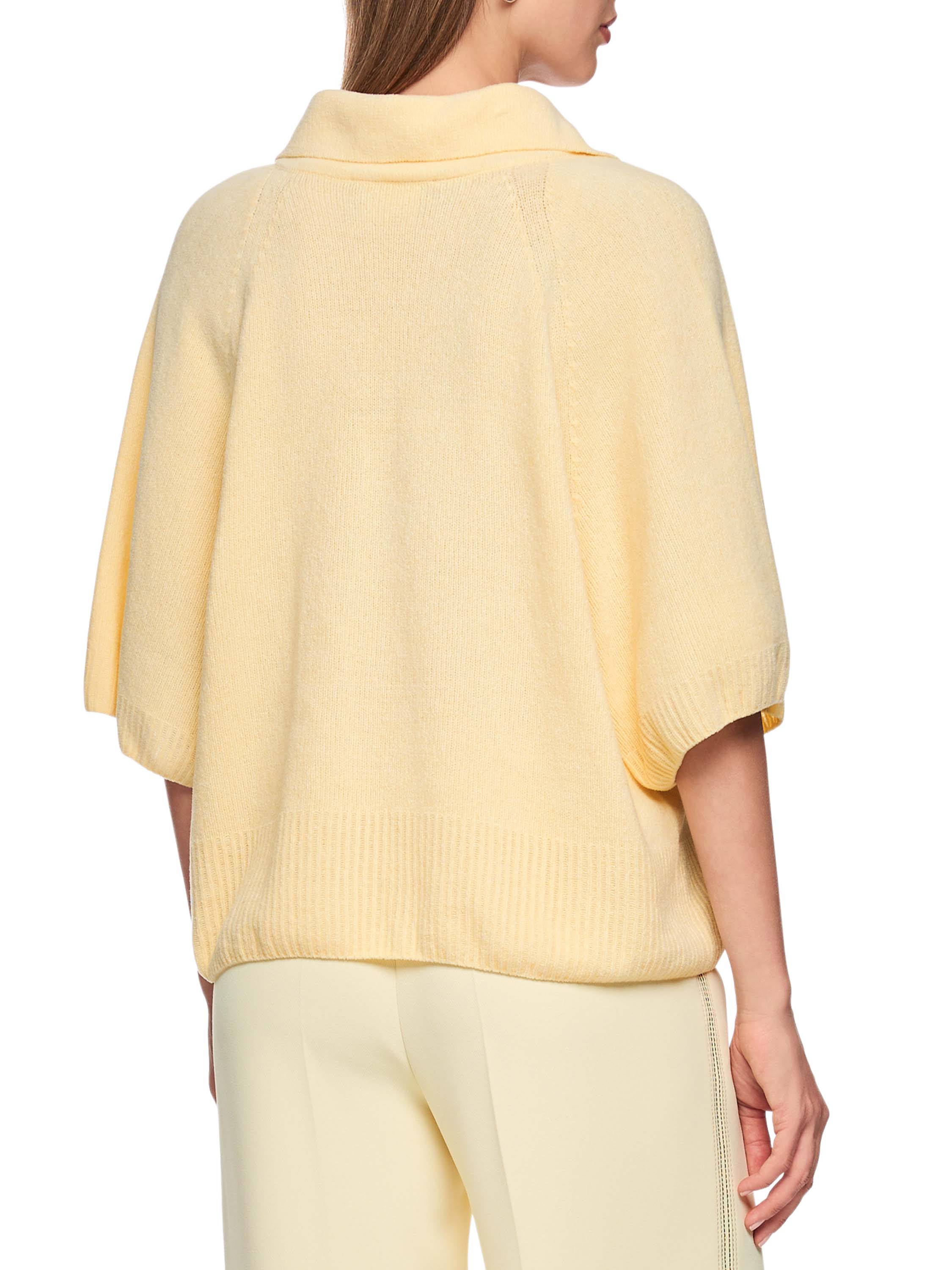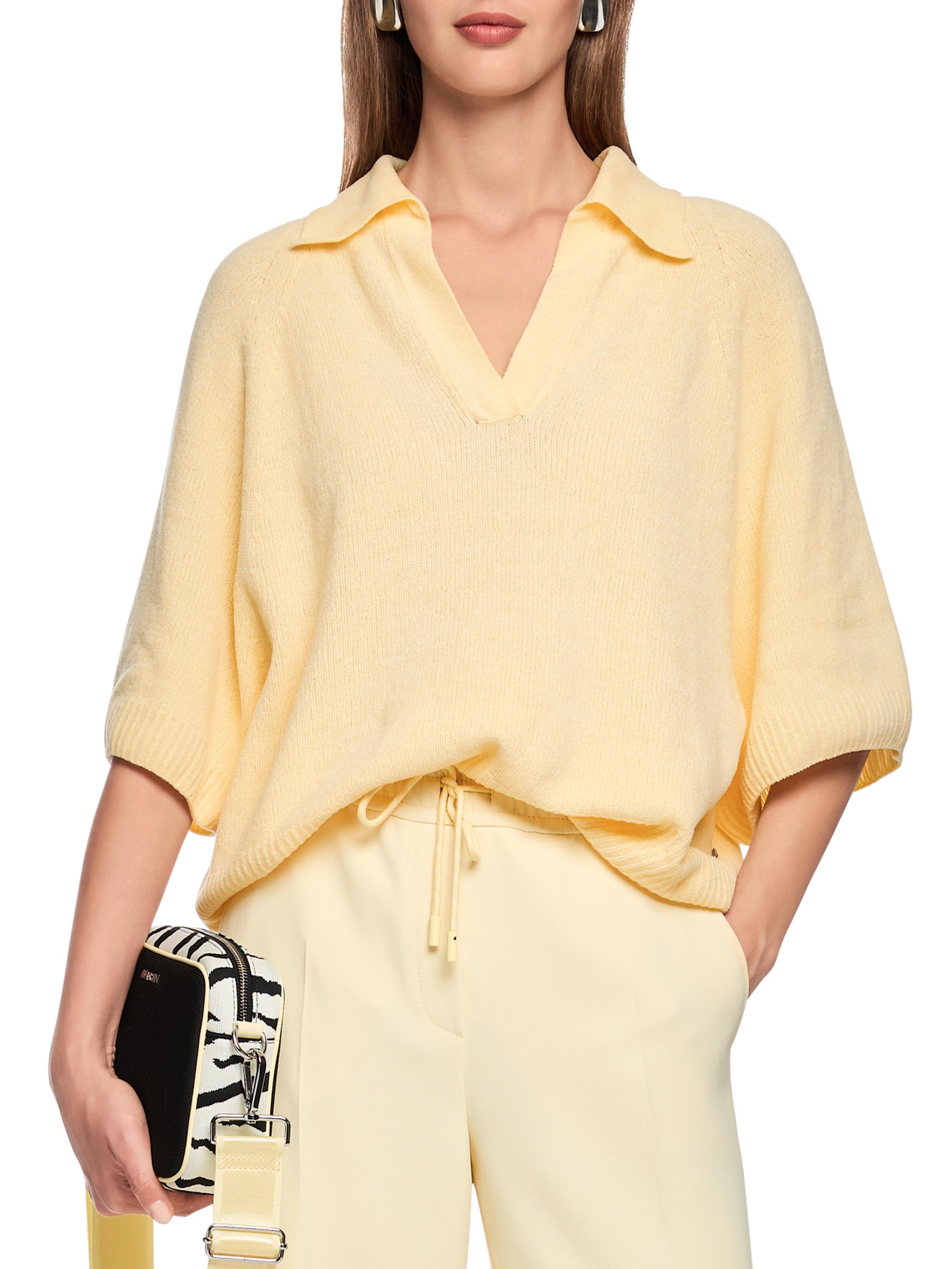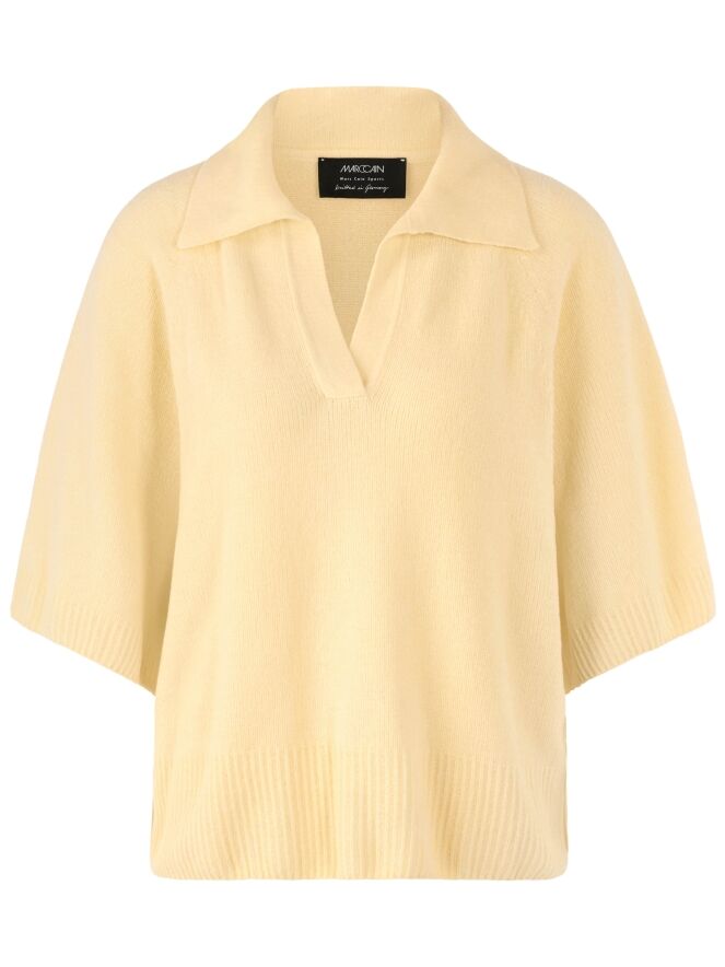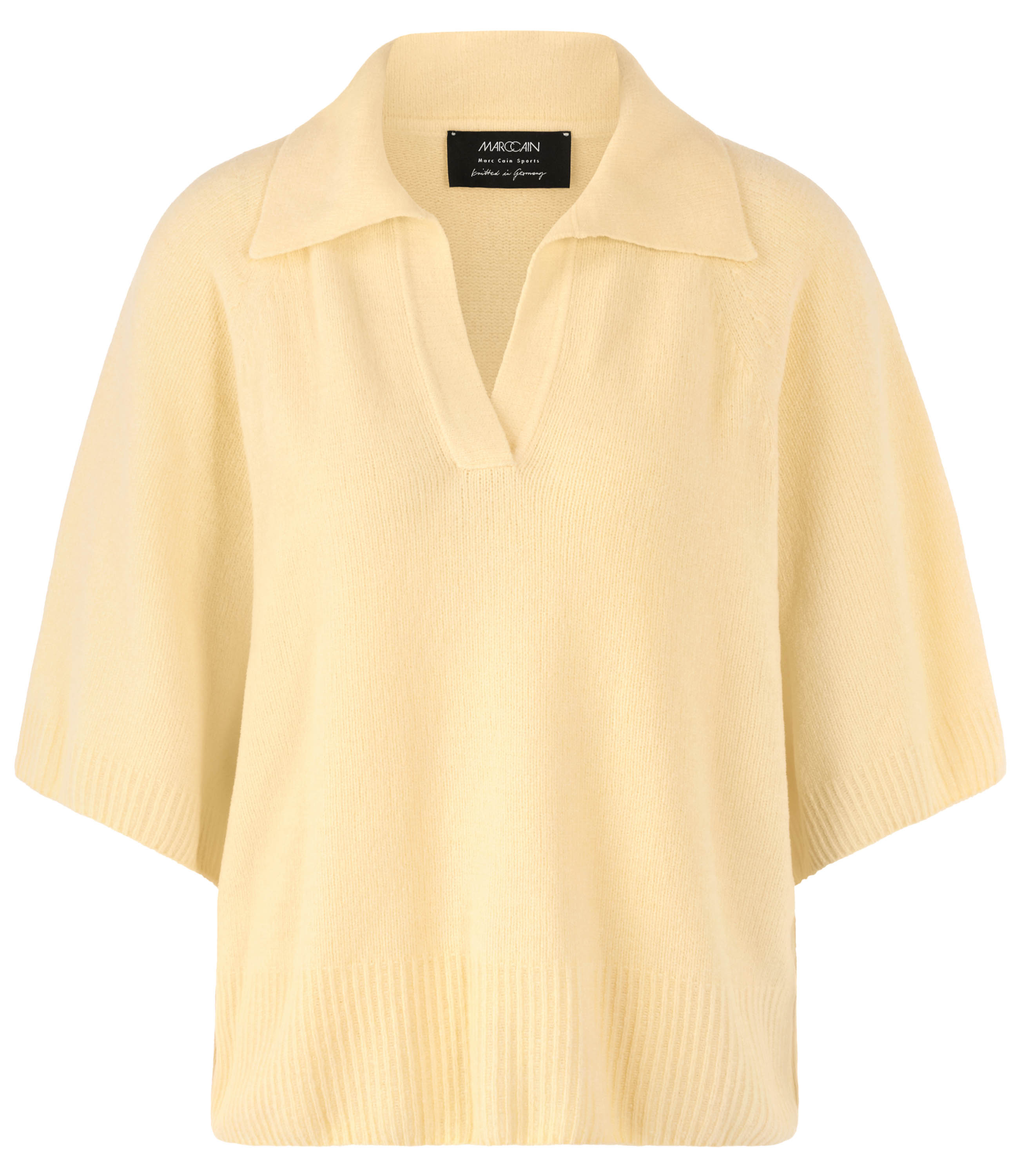 Ein Pullover von Marc Cain in Gelb. Der Pullover hat kurze Ärmel und einen V-Ausschnitt mit Kragen. Die Enden der kurzen Ärmel und der Saum haben einen fein gerippten Bund. Dieser Pullover kann bei 30 Grad gewaschen werden.