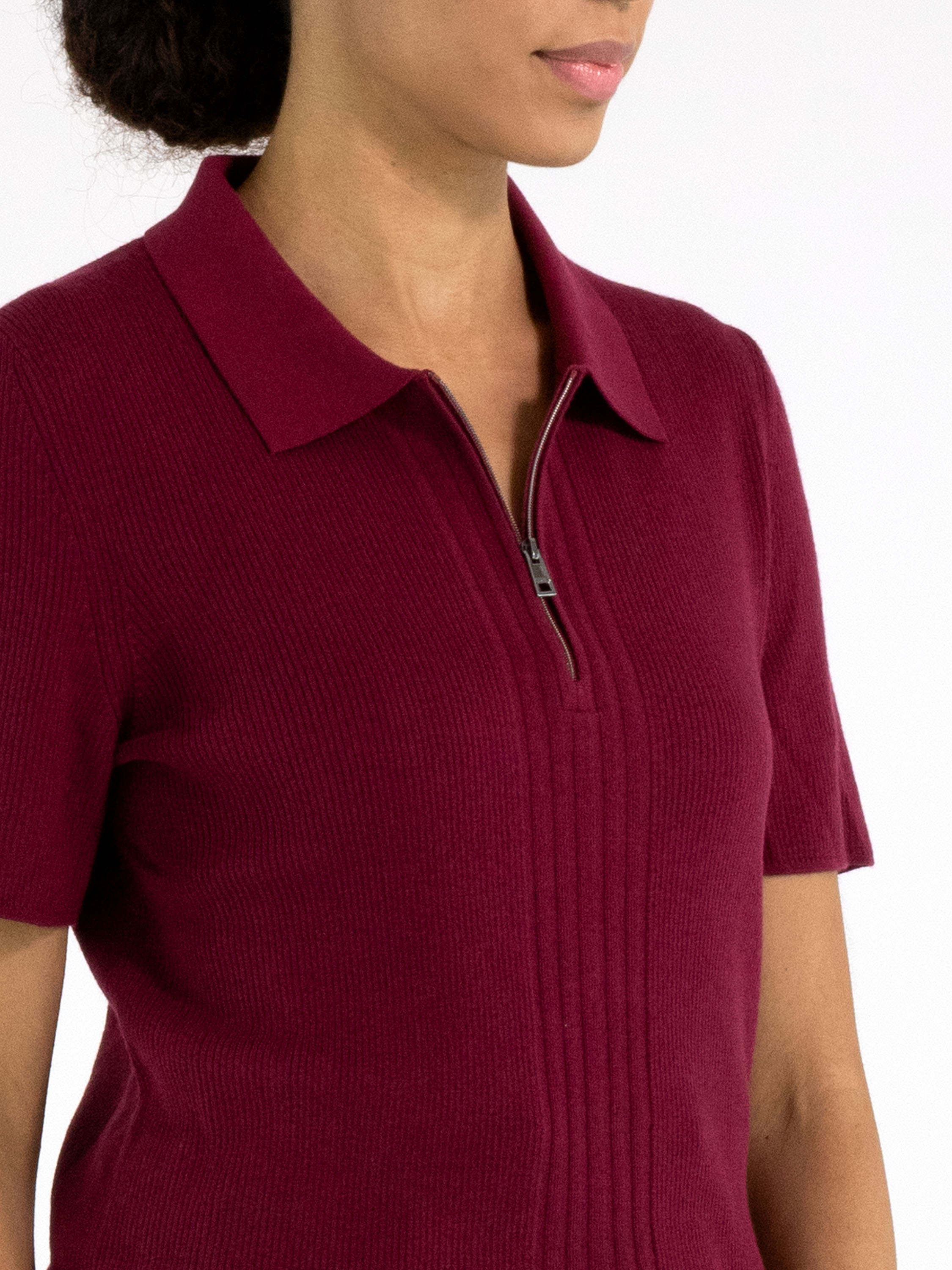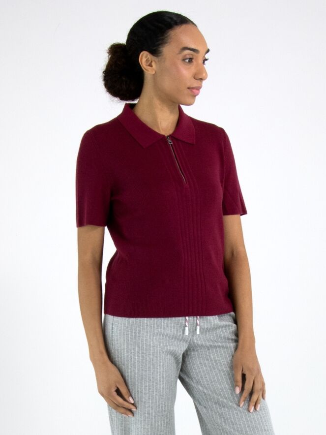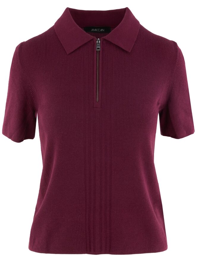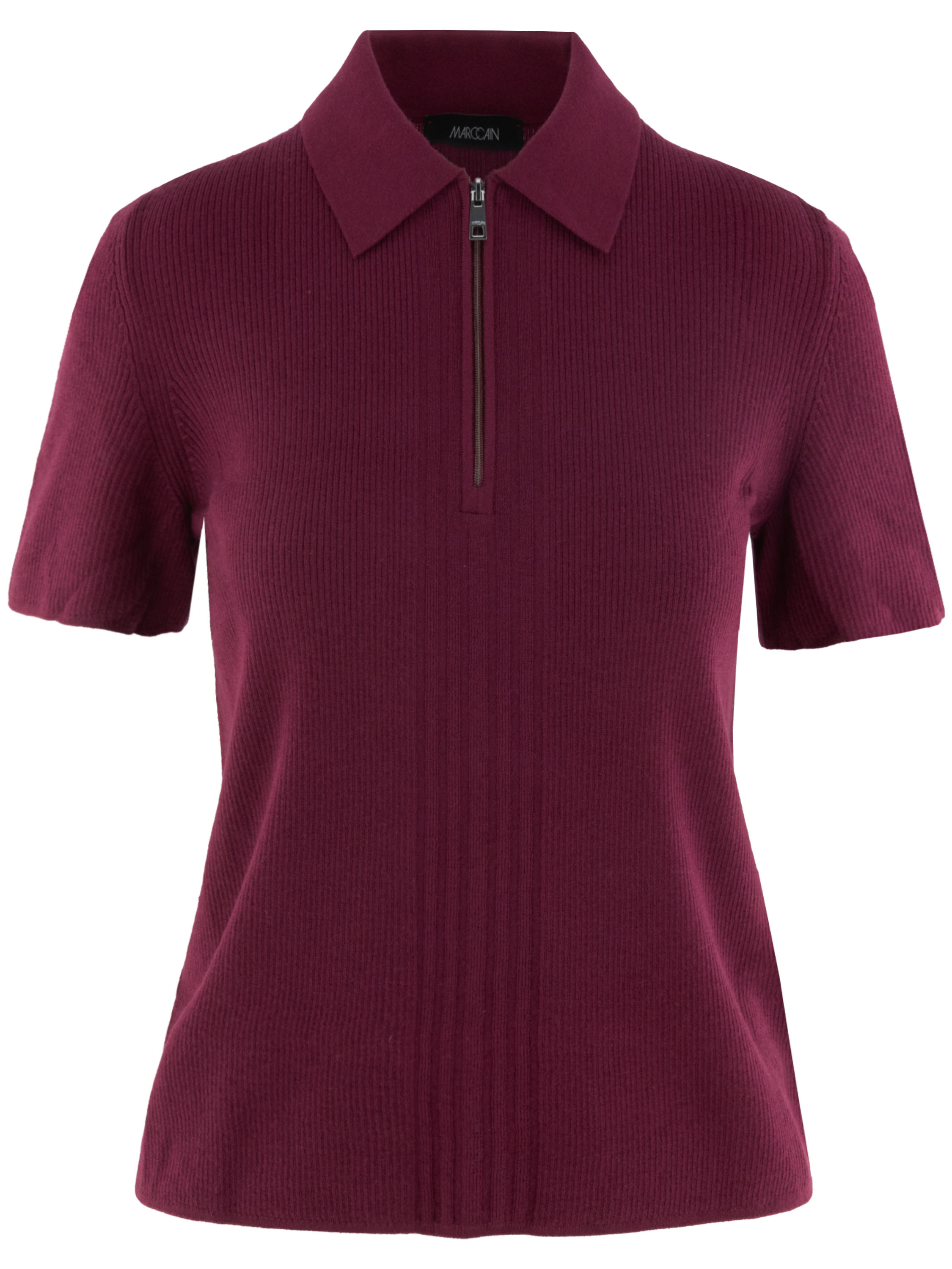 Ein Poloshirt von Marc Cain in Bordeauxrot. Der Stoff ist fein gerippt, mit einem breiten Einsatz auf der Vorderseite, wo die Rippen breiter gearbeitet sind. Der Kragen ist aus einem unifarbenen Stoff, und der Reißverschluss vom Hals verläuft bis oberhalb der Brust. Dieses Poloshirt kann per Hand gewaschen werden.
