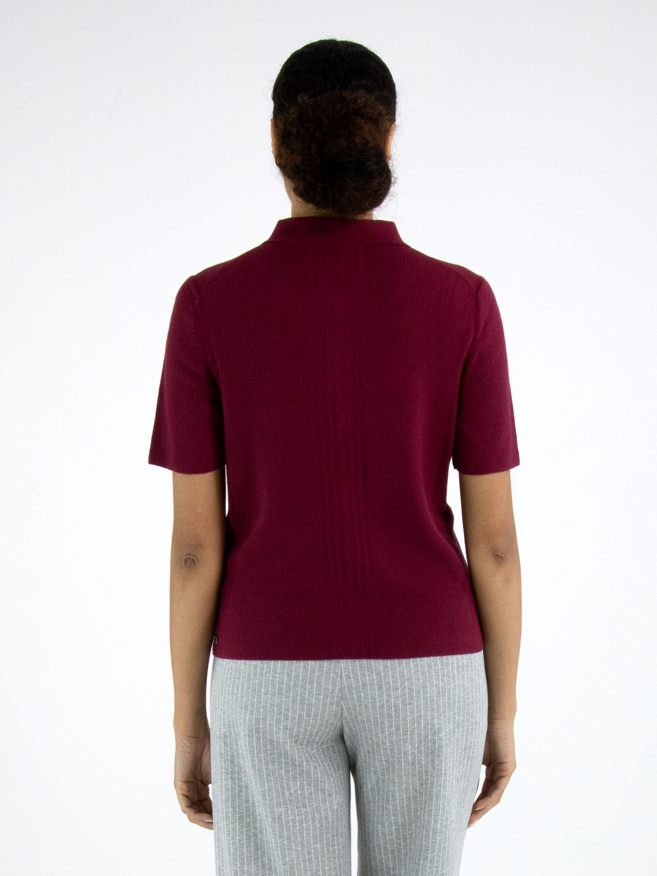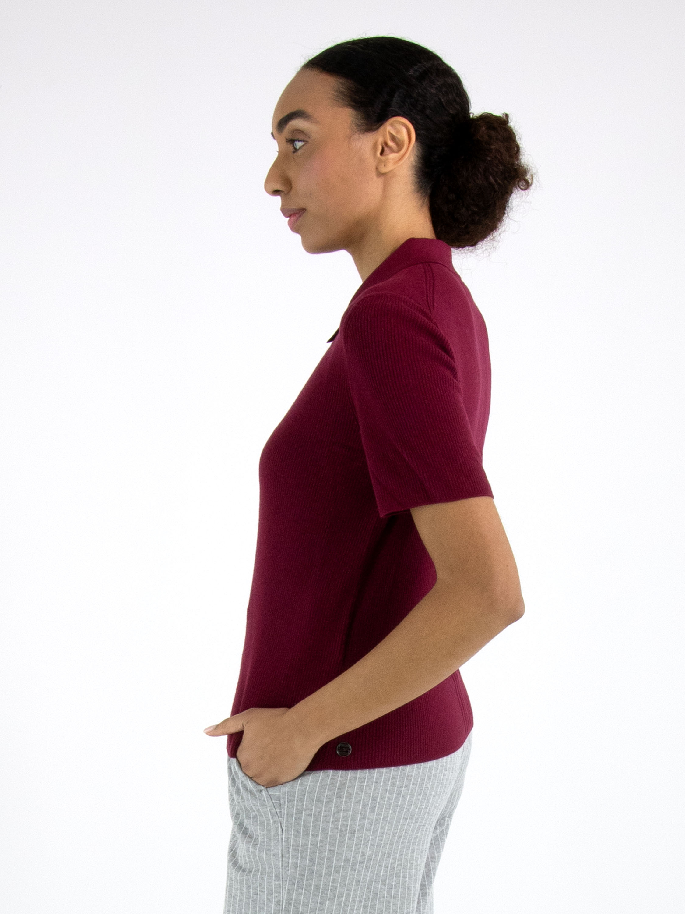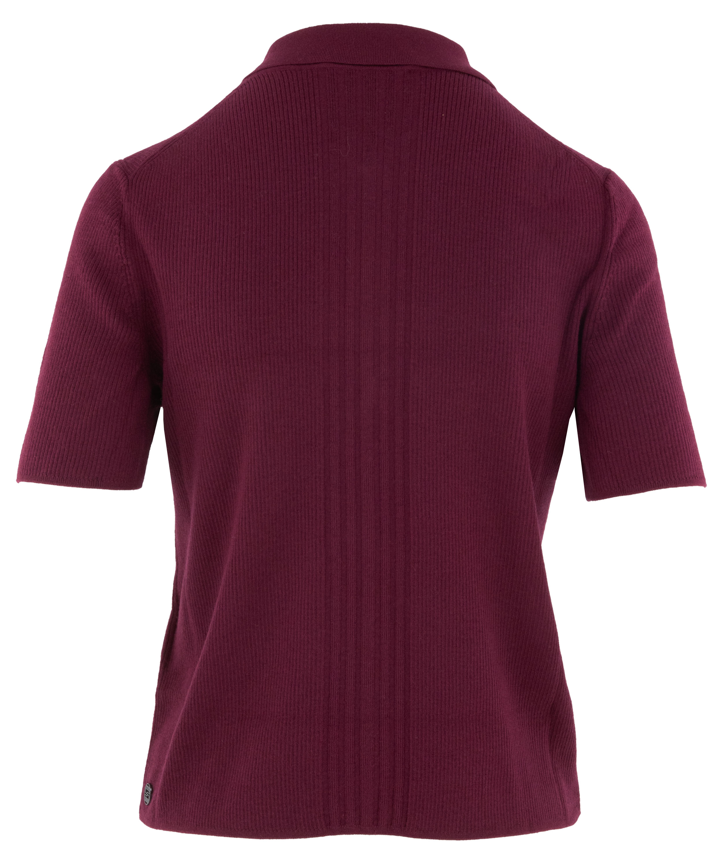 Ein Poloshirt von Marc Cain in Bordeauxrot. Der Stoff ist fein gerippt, mit einem breiten Einsatz auf der Vorderseite, wo die Rippen breiter gearbeitet sind. Der Kragen ist aus einem unifarbenen Stoff, und der Reißverschluss vom Hals verläuft bis oberhalb der Brust. Dieses Poloshirt kann per Hand gewaschen werden.