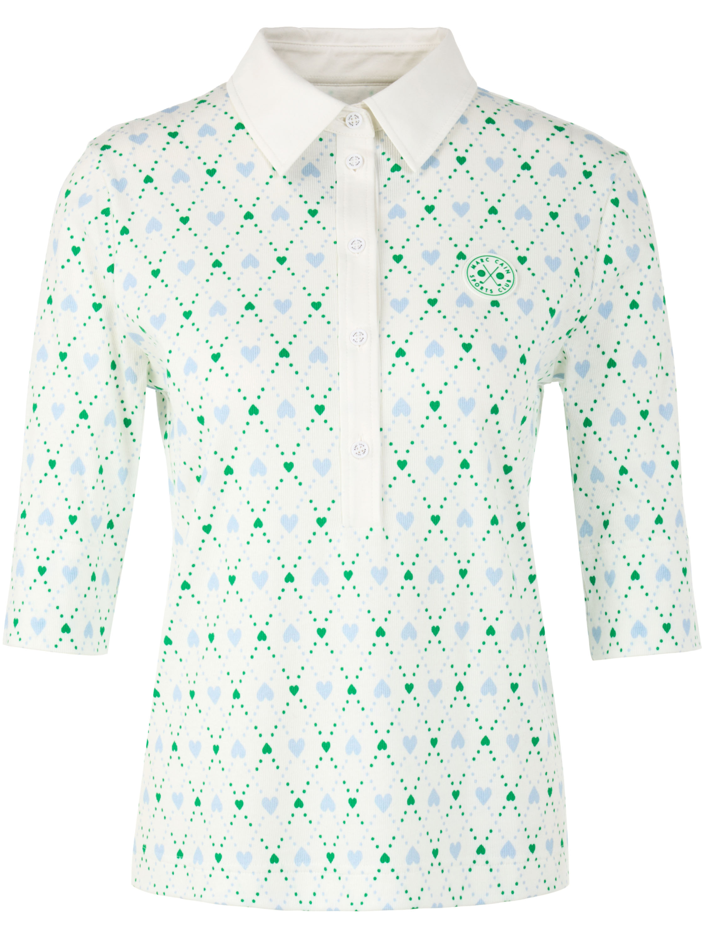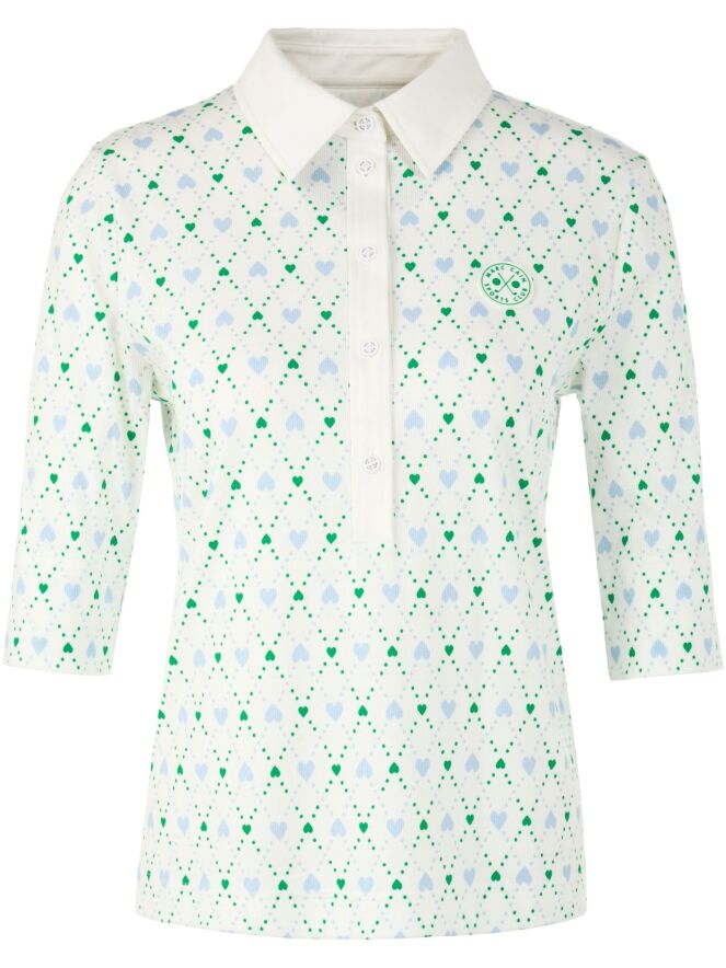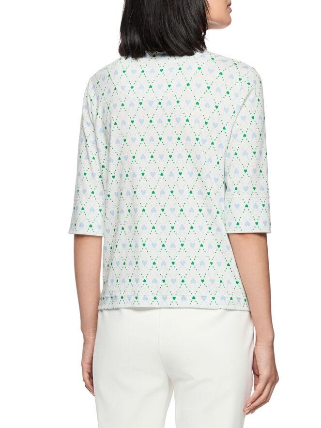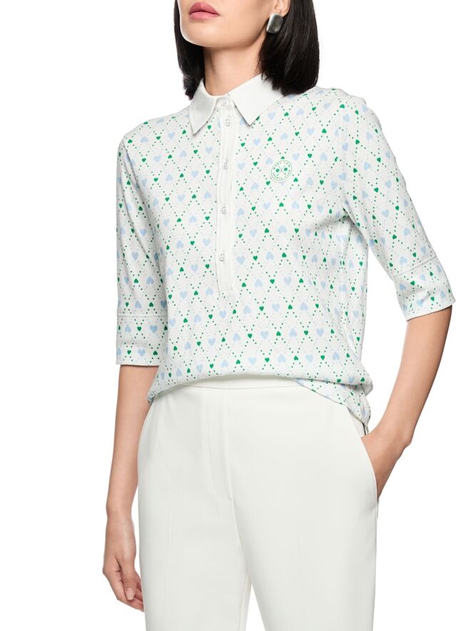 Ein Poloshirt von Marc Cain mit einem Karomuster und Herzdetails in Blau- und Grüntönen auf cremeweißem Hintergrund. Der Kragen ist aus unifarbenem cremeweißem Stoff gefertigt. Dieses Poloshirt kann bei 30 Grad gewaschen werden.