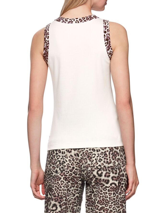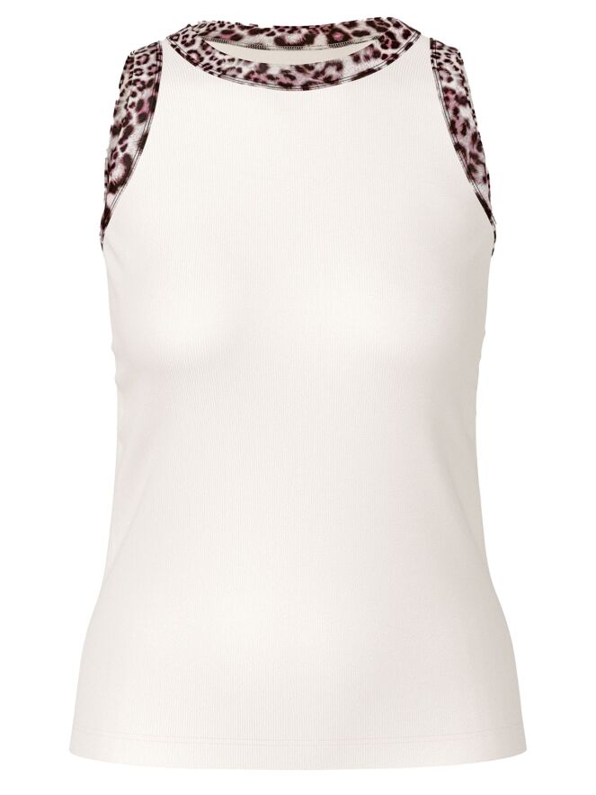 Ein Top von Marc Cain in einer fein gerippten Struktur in Cremeweiß. Am Rand des Rundhalsausschnitts und an den Armausschnitten befindet sich eine fein gerippte Strickbiese im Leopardenprint mit mehreren Grau-, Bordeaux- und Cremeweißnuancen. Dieses Top kann bei 30 Grad gewaschen werden.