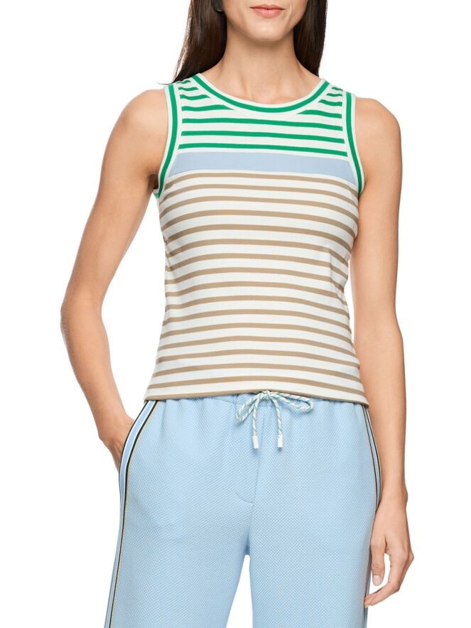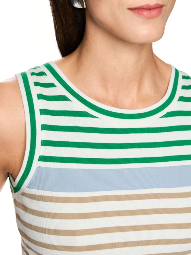 Ein Top von Marc Cain aus fein geripptem Stoff mit einem Streifenmuster in Sand, Blau und Grün auf cremeweißem Hintergrund. Entlang des Rundhalsausschnitts und der Armausschnitte ist eine fein gerippte Strickborte verarbeitet. Dieser Top kann bei 30 Grad gewaschen werden.