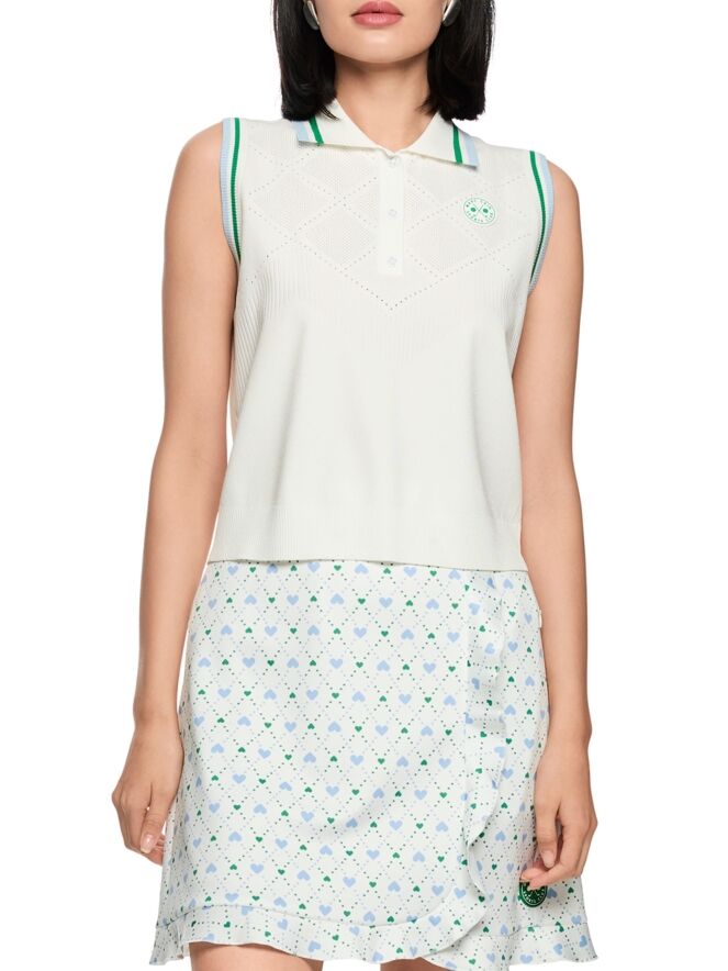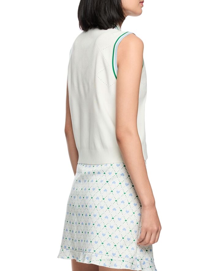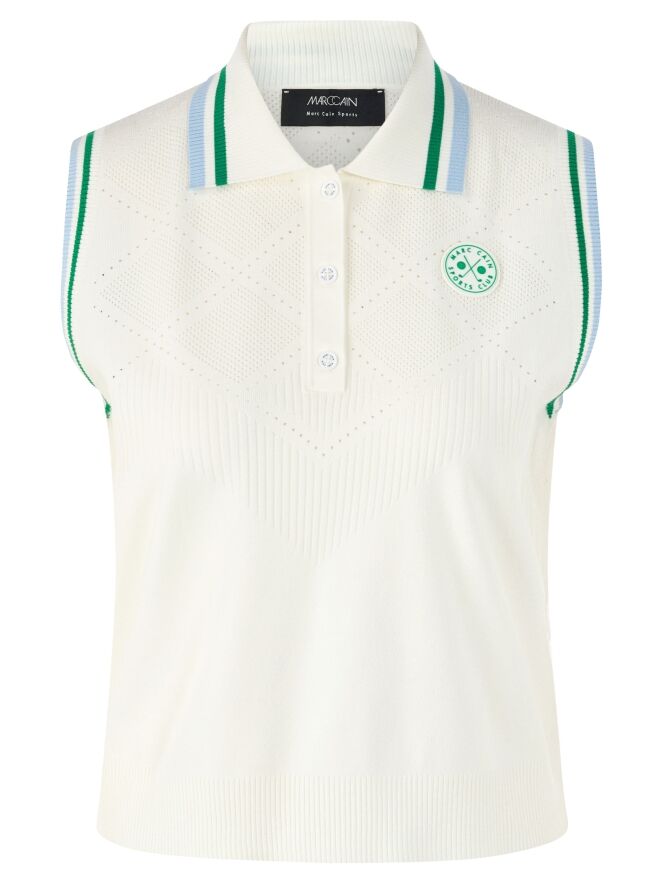 Ein Top von Marc Cain in Cremeweiß. Der Kragen und die Armausschnittkanten sind aus fein gerippter Strickware mit Streifenmuster in Blau und Grün gearbeitet. Von den Schultern bis unter die Brust zeigt der Stoff ein rautenförmiges Ajourmuster mit feiner Perforation. Dieser Top kann von Hand gewaschen werden.
