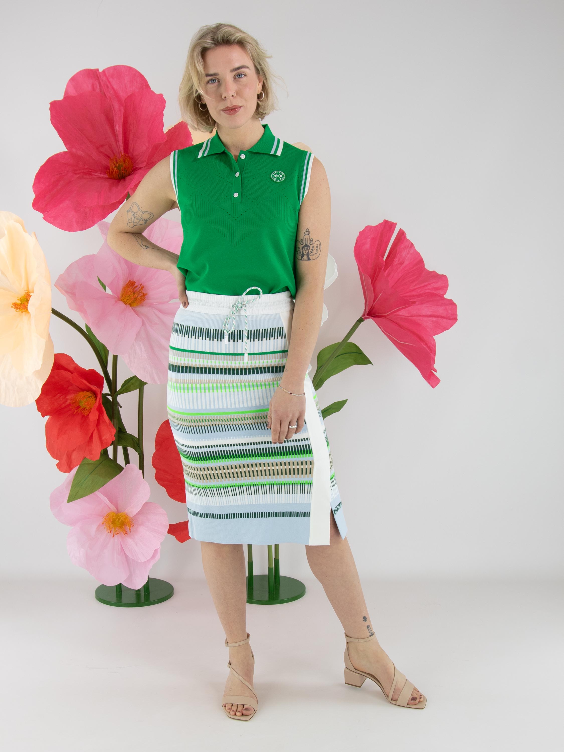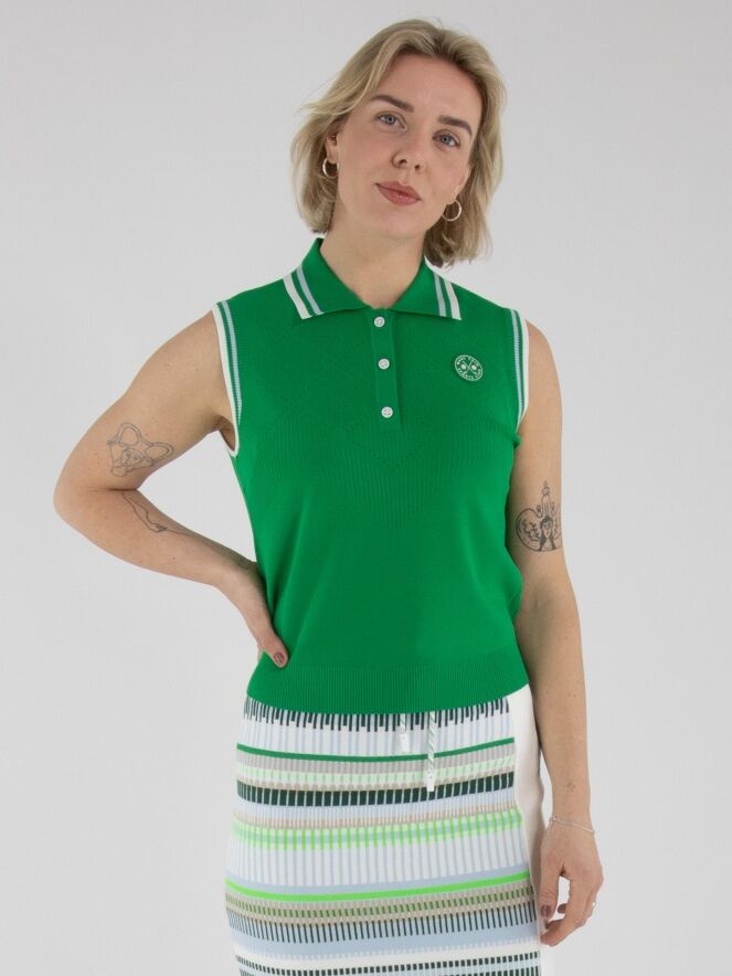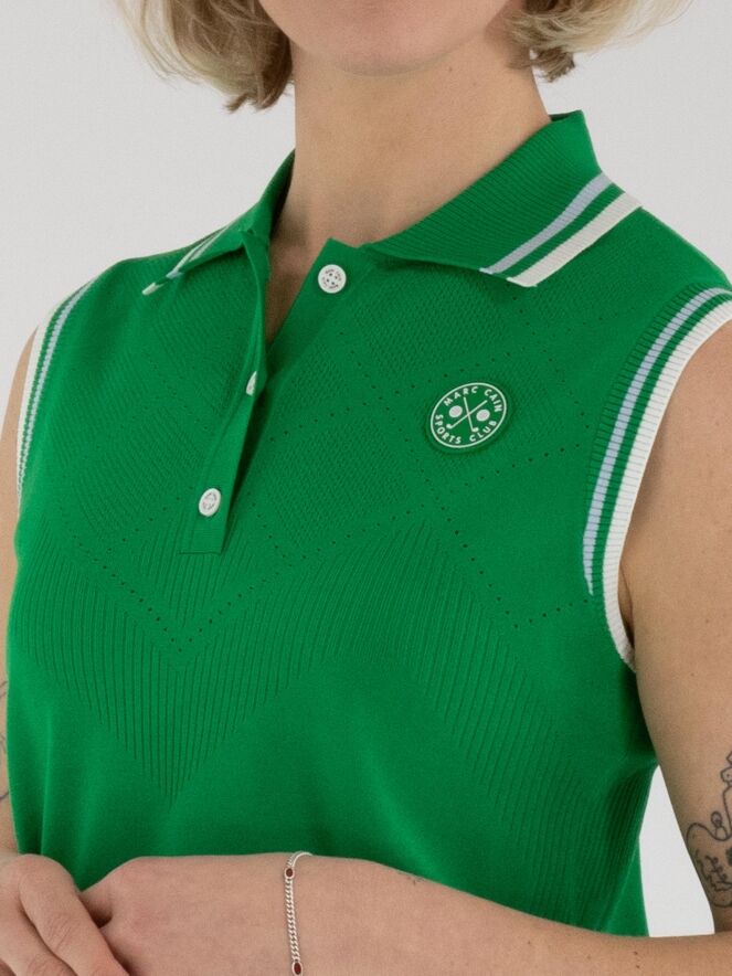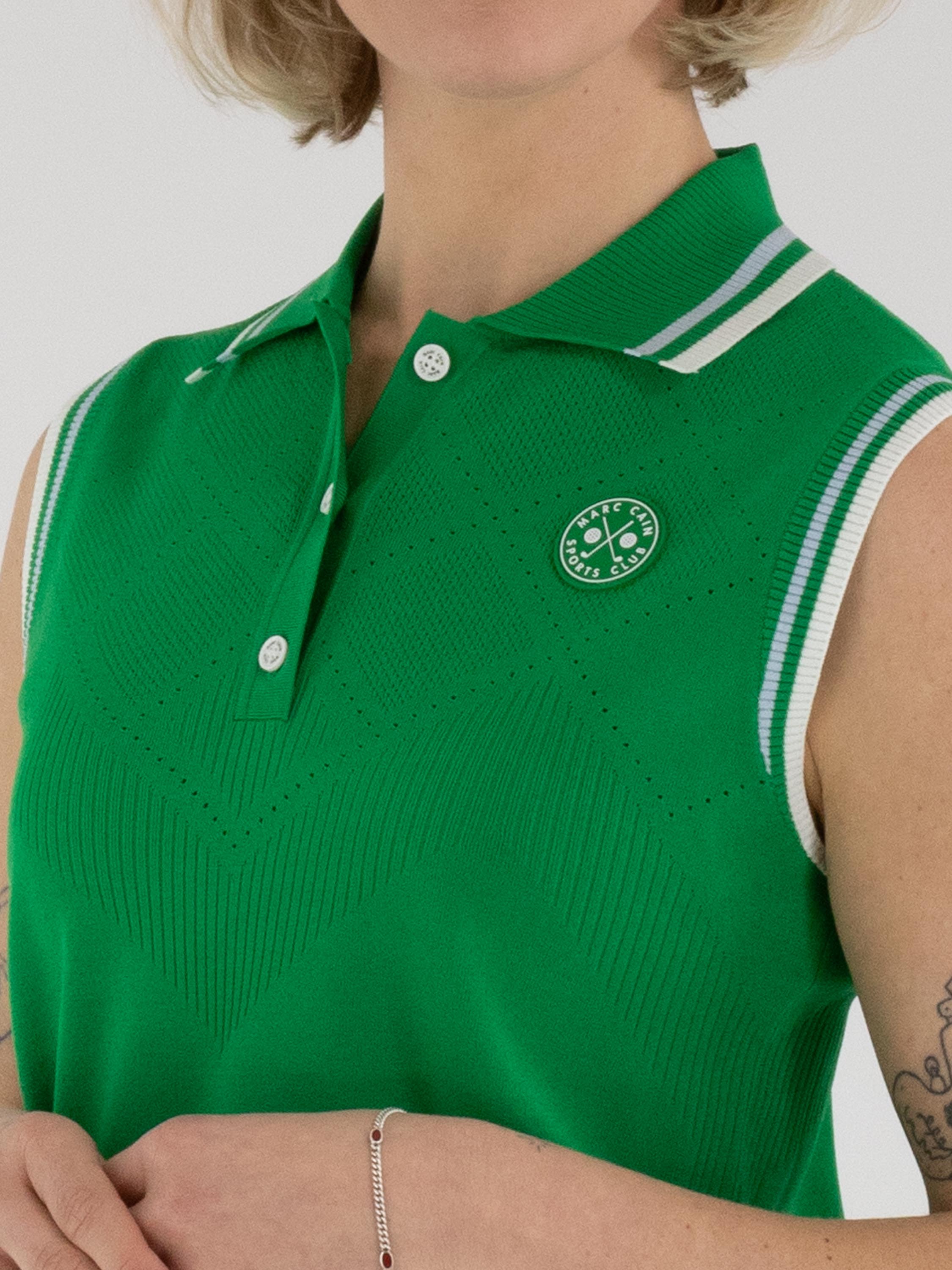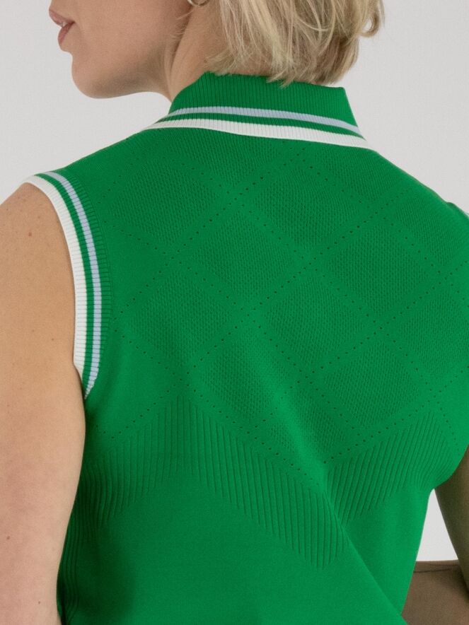 Ein Top von Marc Cain in Grün. Der Kragen und die Armausschnitte sind aus fein geripptem Strick mit Streifenmuster in Blau, Cremeweiß und Grün gearbeitet. Von den Schultern bis unter die Brust zeigt der Stoff ein rautenförmiges Ajourmuster mit feiner Perforation. Dieser Top kann von Hand gewaschen werden.