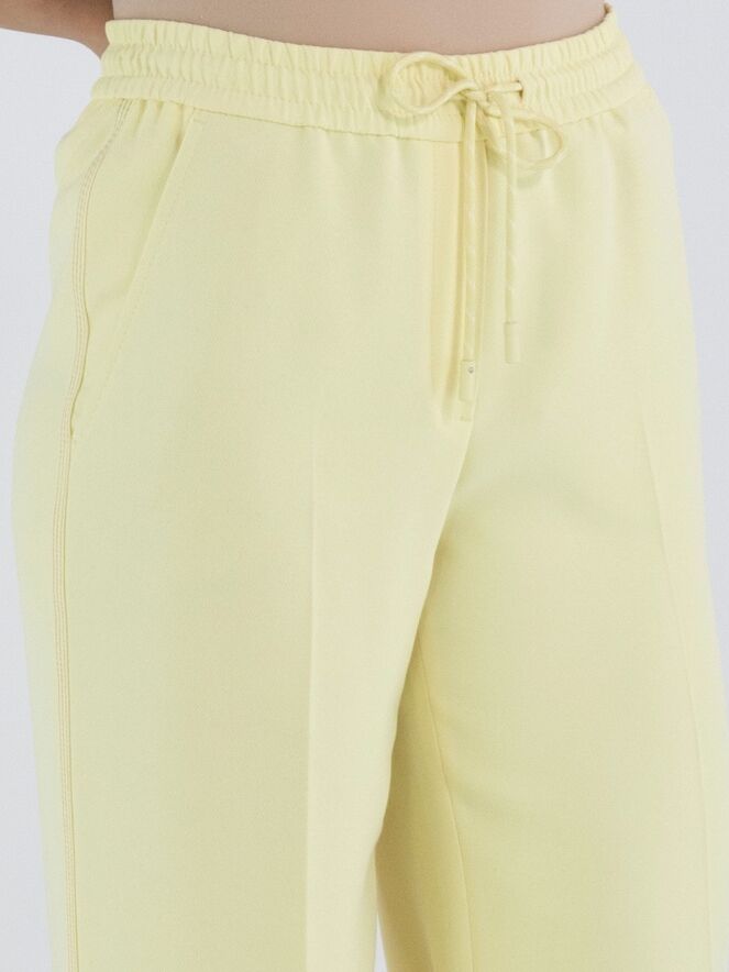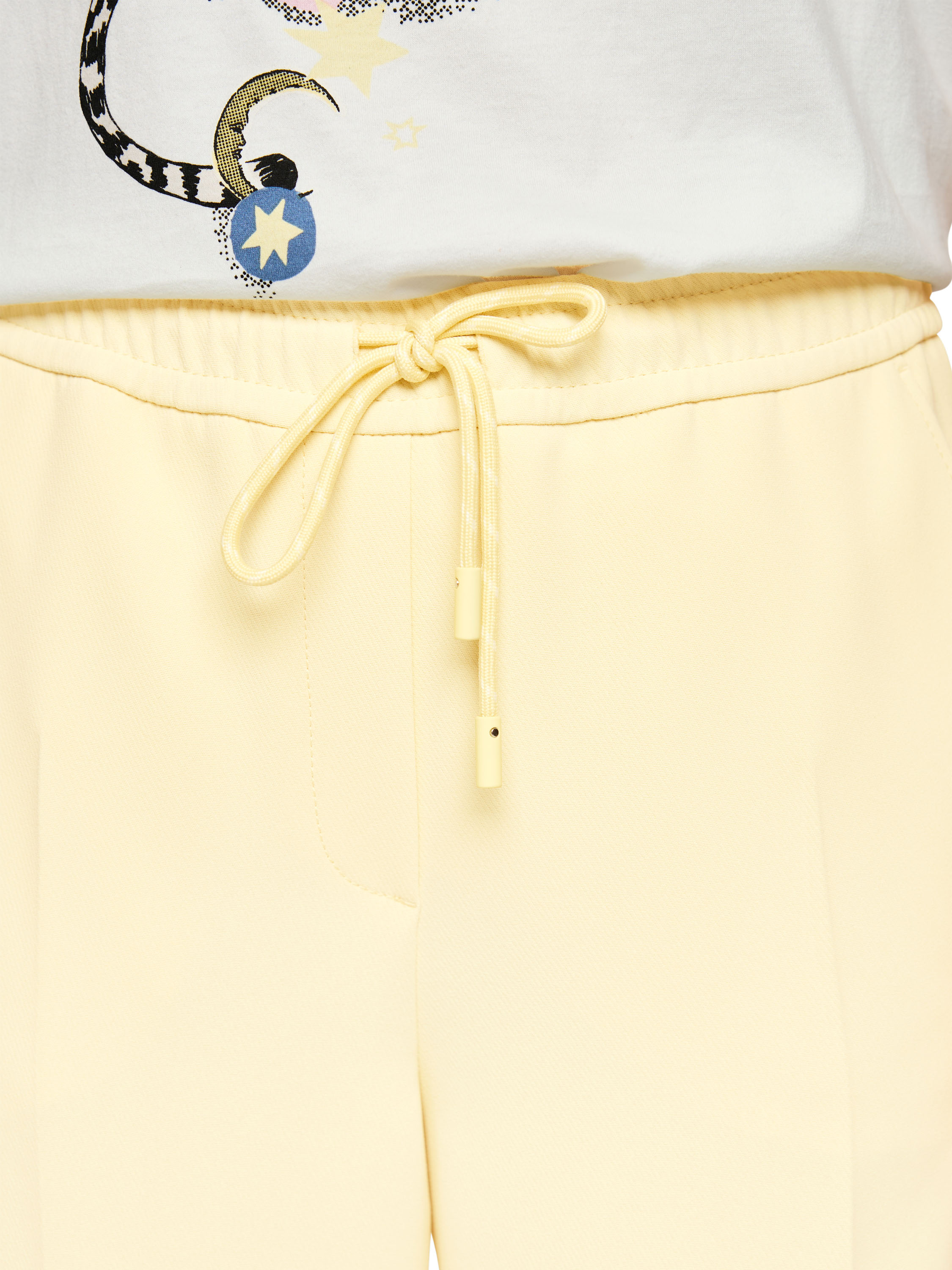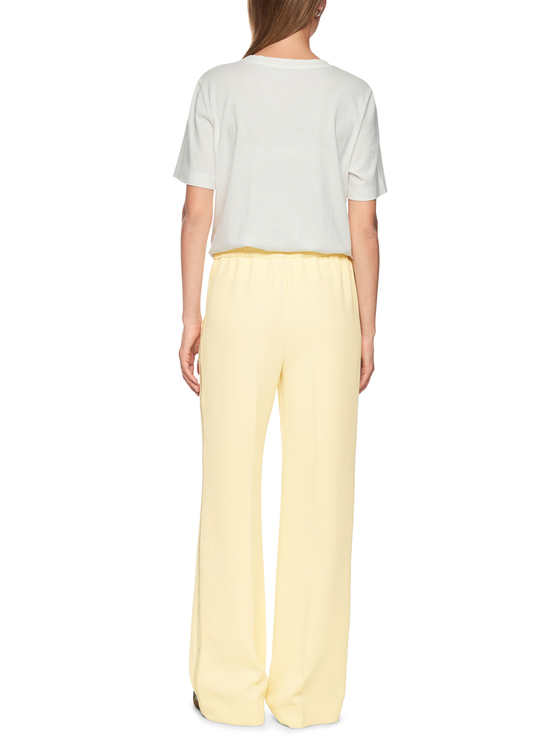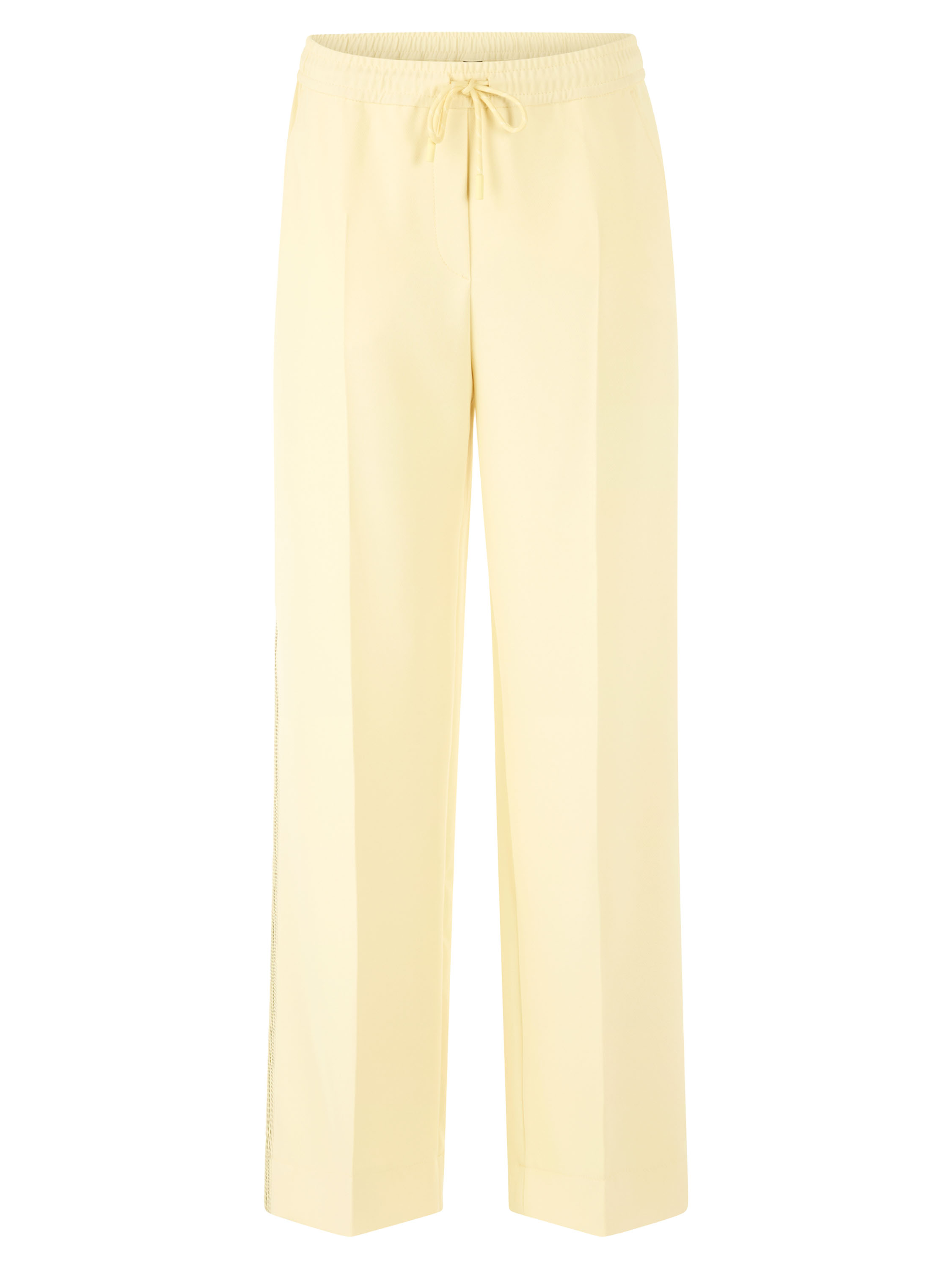 Eine Jogginghose von Marc Cain in Pastellgelb. In der Taille befindet sich ein fein gelegtes Elastikband mit einer Kordel in Tunnelverarbeitung. In der Mitte der gerade geschnittenen Hosenbeine verläuft eine eingepresste Falte. Die Hose hat Eingrifftaschen, und entlang der Seiten verläuft eine Biese mit drei sandfarbenen Steppnähten. Diese Hose kann bei 30 Grad gewaschen werden.
