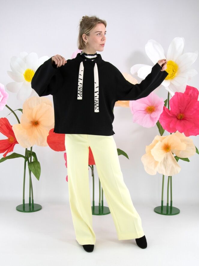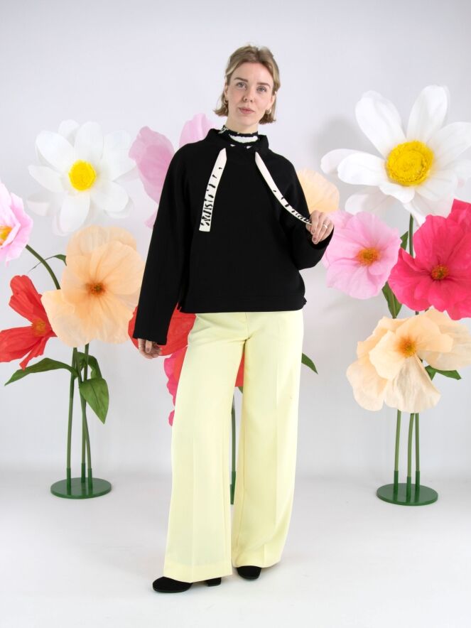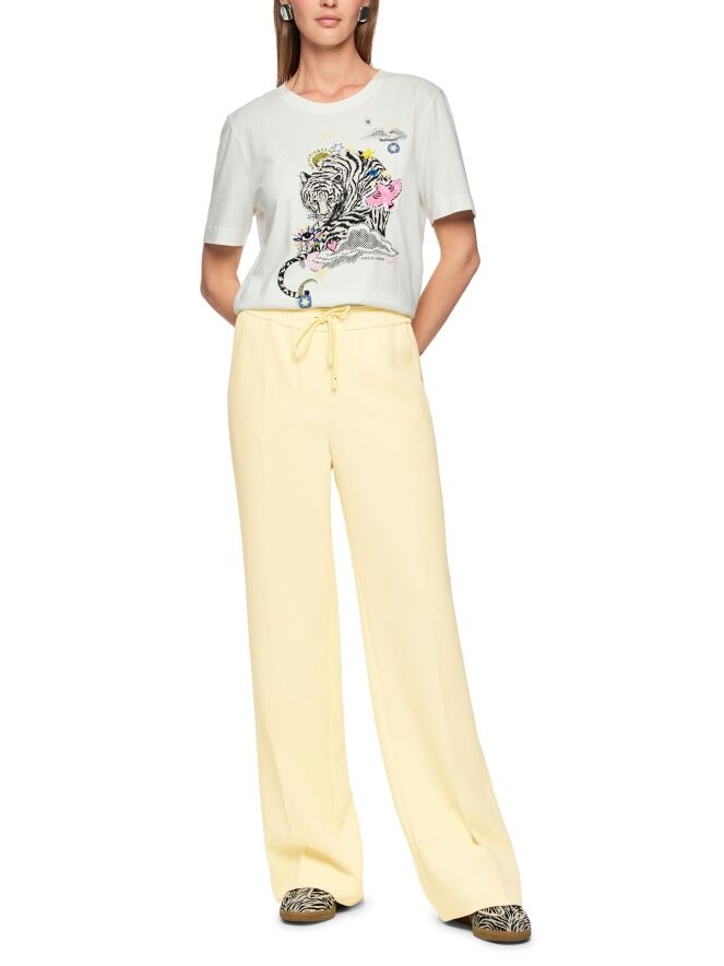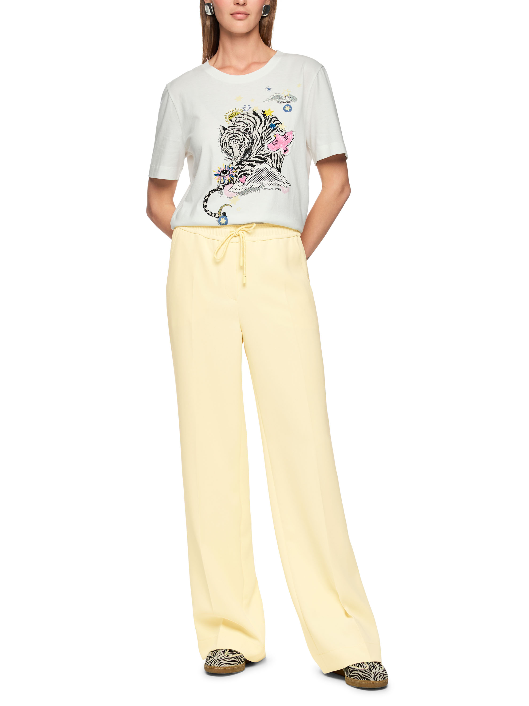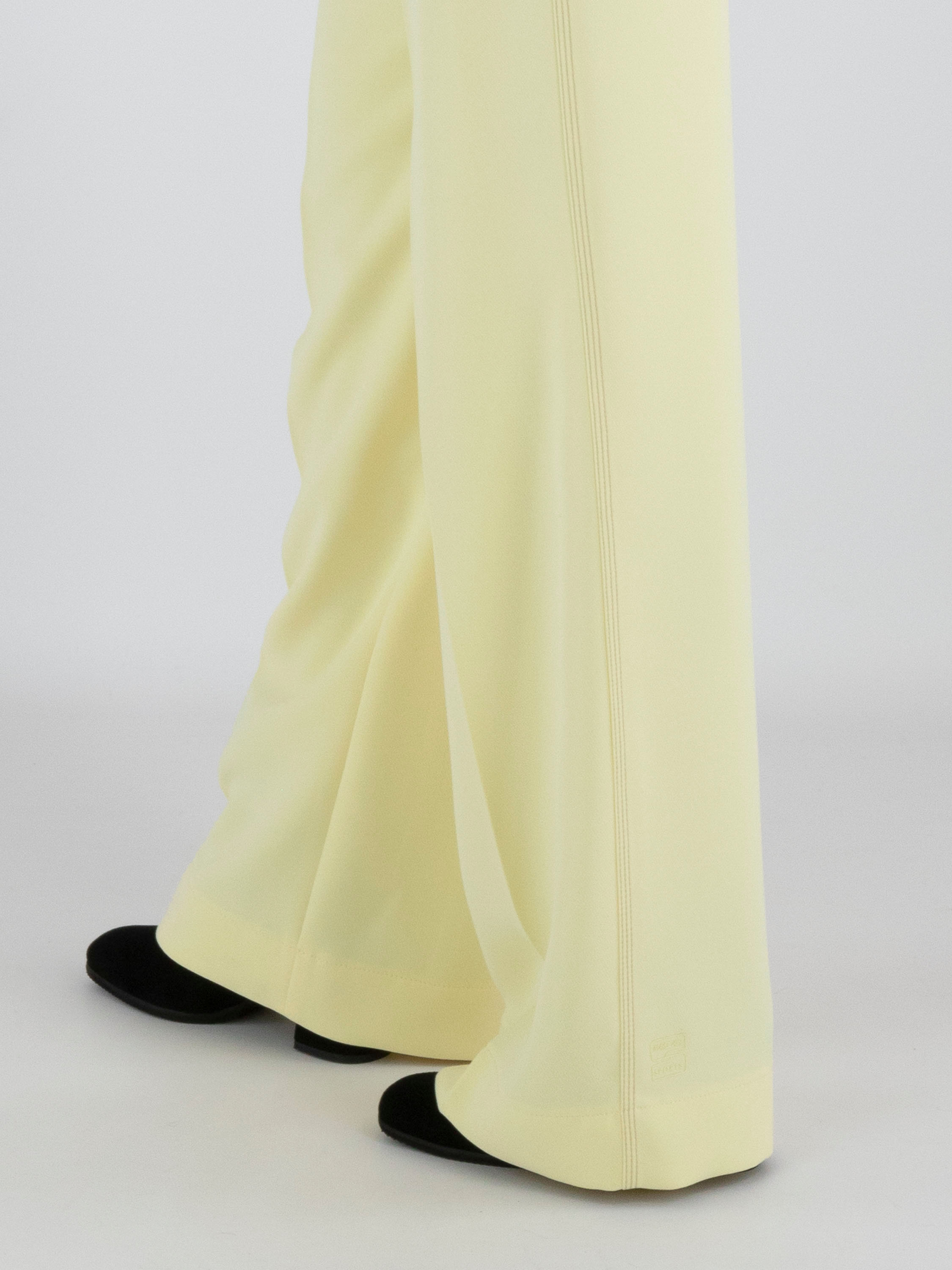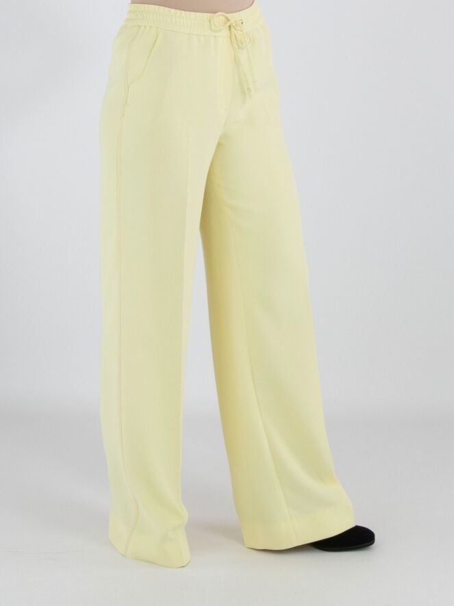 Eine Jogginghose von Marc Cain in Pastellgelb. In der Taille befindet sich ein fein gelegtes Elastikband mit einer Kordel in Tunnelverarbeitung. In der Mitte der gerade geschnittenen Hosenbeine verläuft eine eingepresste Falte. Die Hose hat Eingrifftaschen, und entlang der Seiten verläuft eine Biese mit drei sandfarbenen Steppnähten. Diese Hose kann bei 30 Grad gewaschen werden.