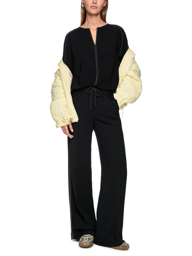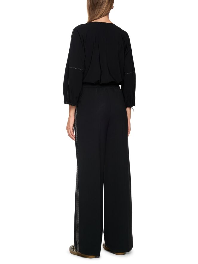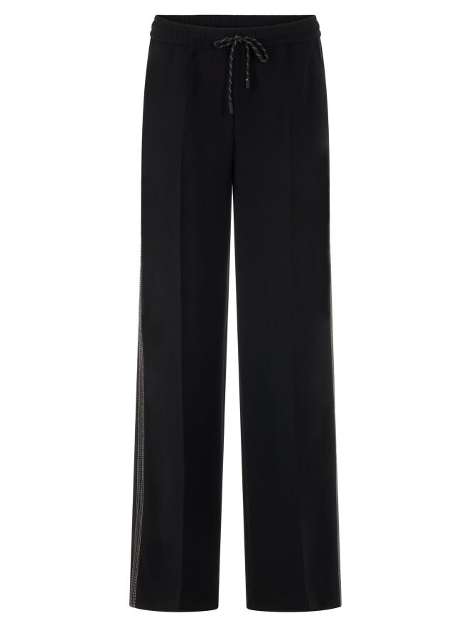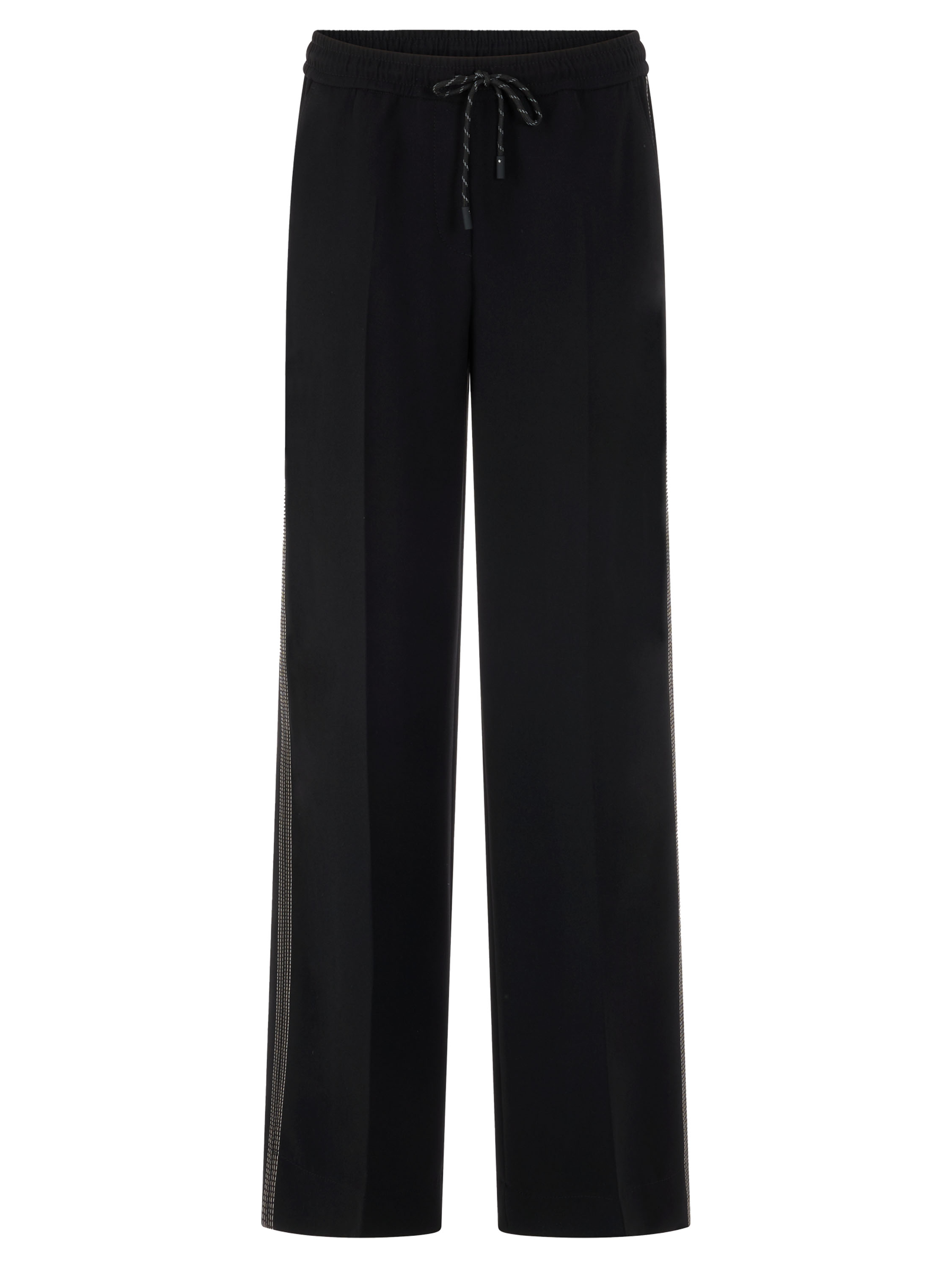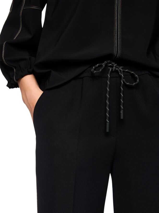 Eine Jogginghose von Marc Cain in Schwarz. In der Taille befindet sich ein fein gelegter elastischer Bund mit einer Kordel in Tunnelverarbeitung. Mittig auf den gerade geschnittenen Hosenbeinen verläuft eine eingepresste Falte. Die Hose hat Eingrifftaschen, und entlang der Seiten verläuft eine Biese mit drei sandfarbenen Ziernähten. Diese Hose kann bei 30 Grad gewaschen werden.