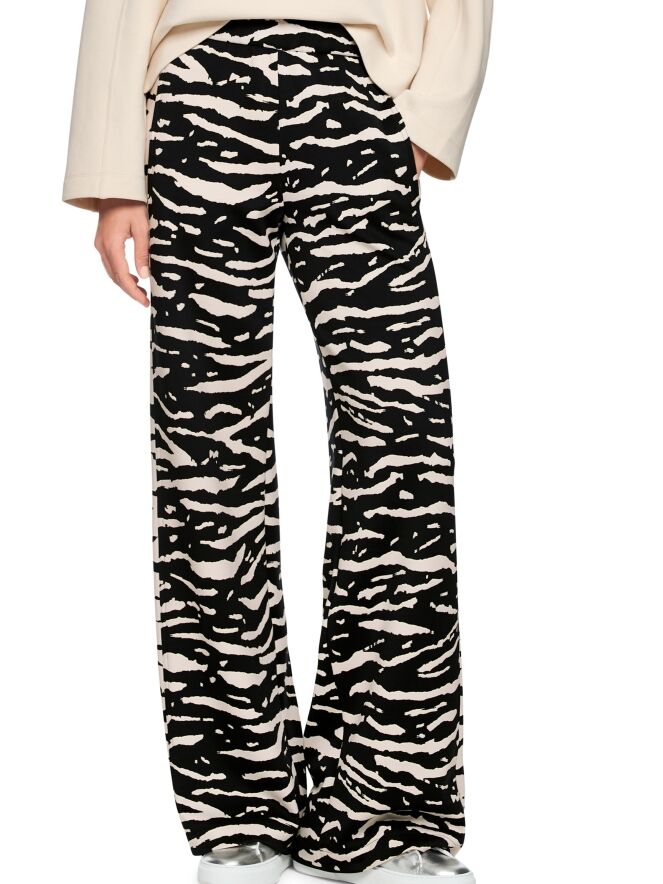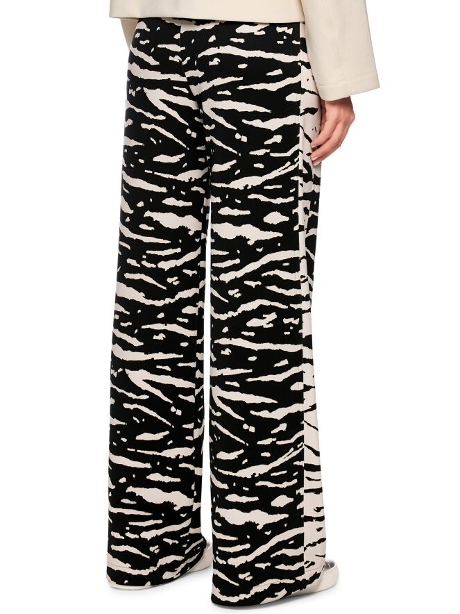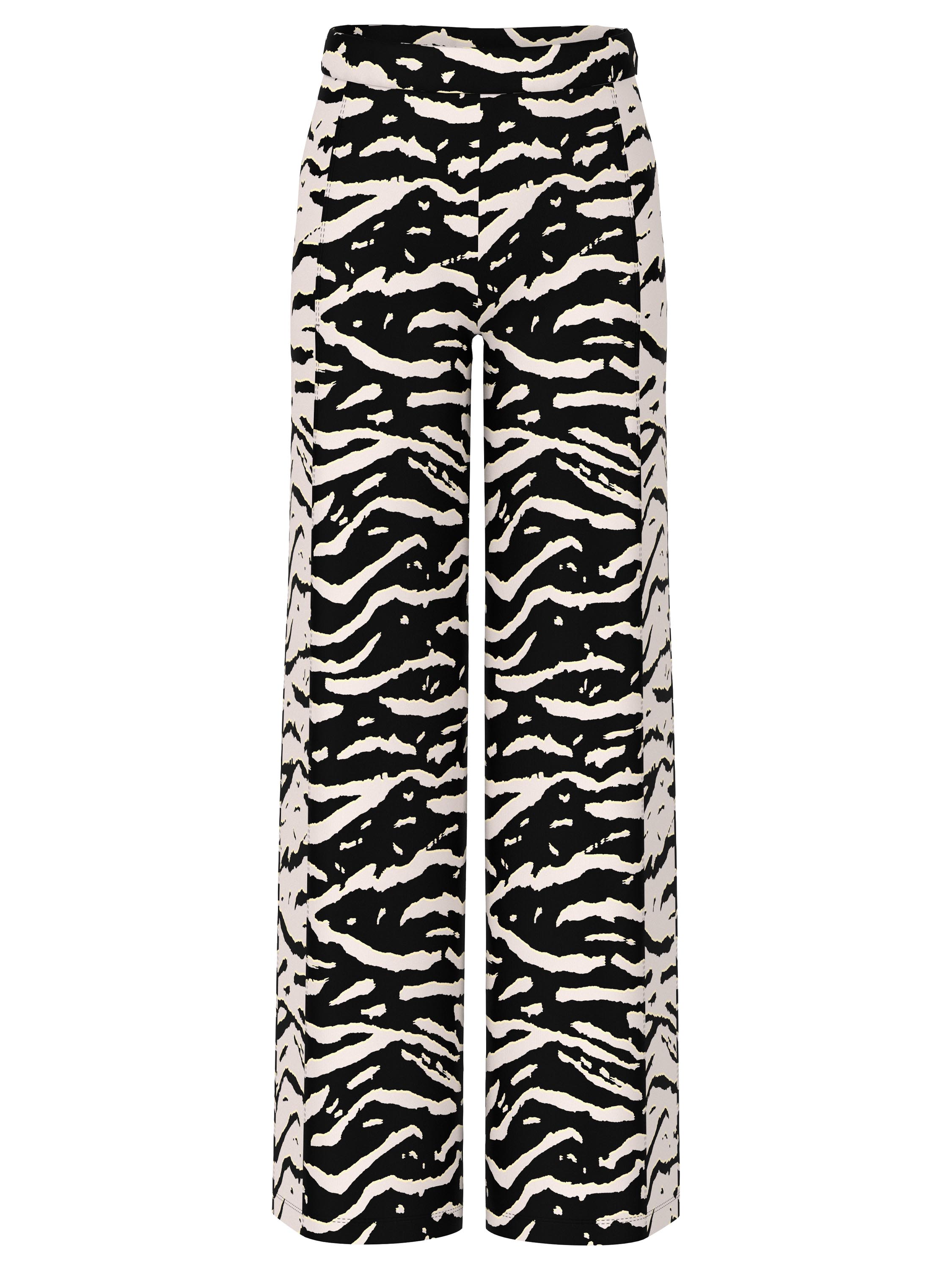 Eine Jogginghose aus Scuba-Material von Marc Cain im Zebramuster in Schwarz und Beige. Der Bund ist elastisch. Entlang der Seiten verläuft eine breite Biese, bei der das Zebramuster farblich recto verso gearbeitet ist. Die Hose hat Eingrifftaschen und kann bei 30 Grad gewaschen werden.