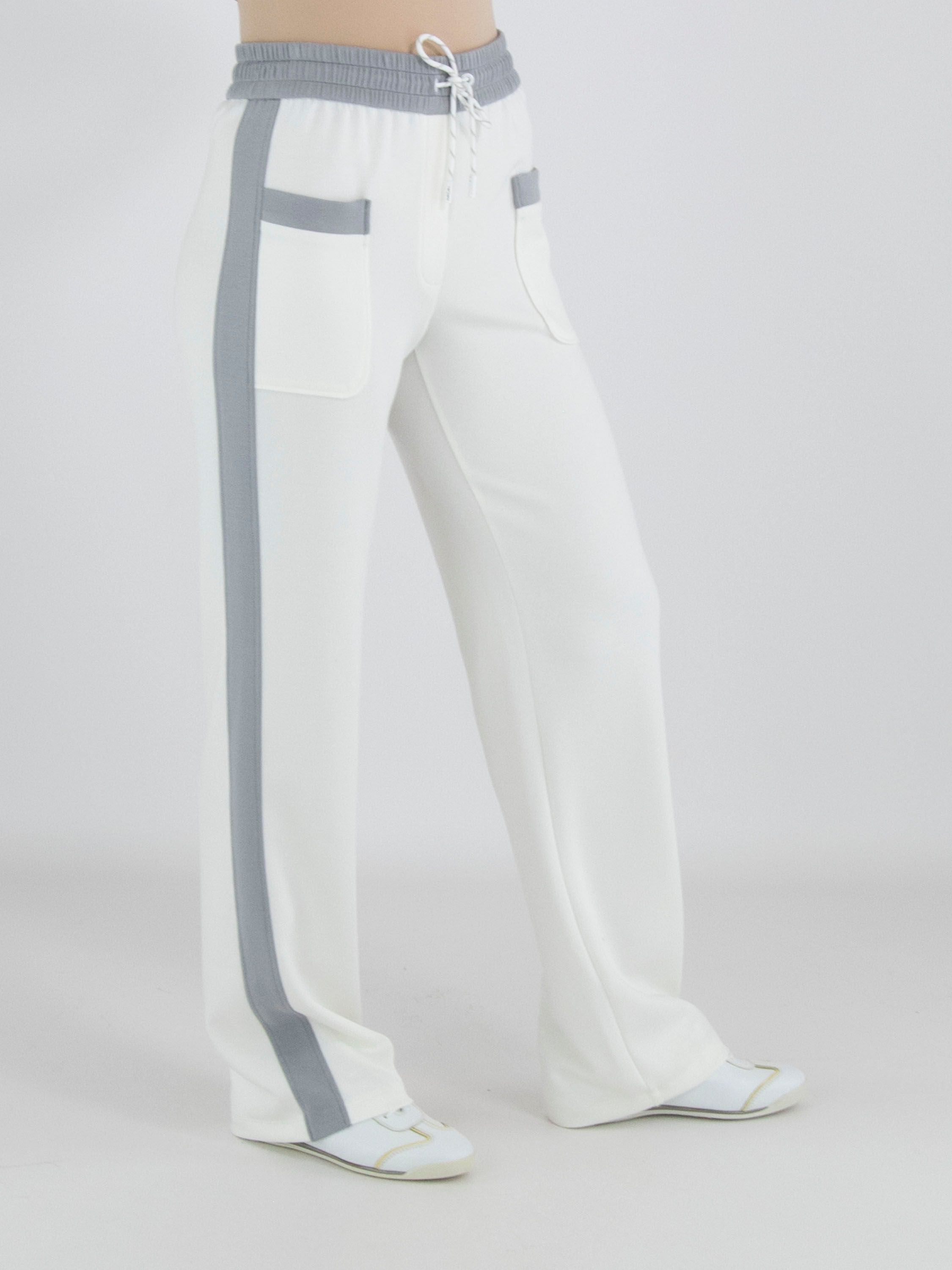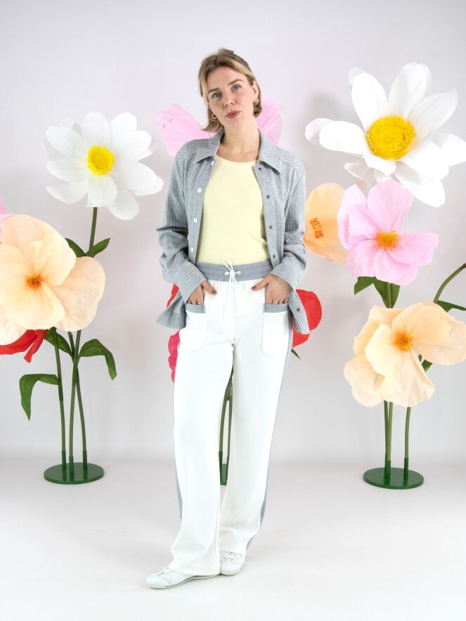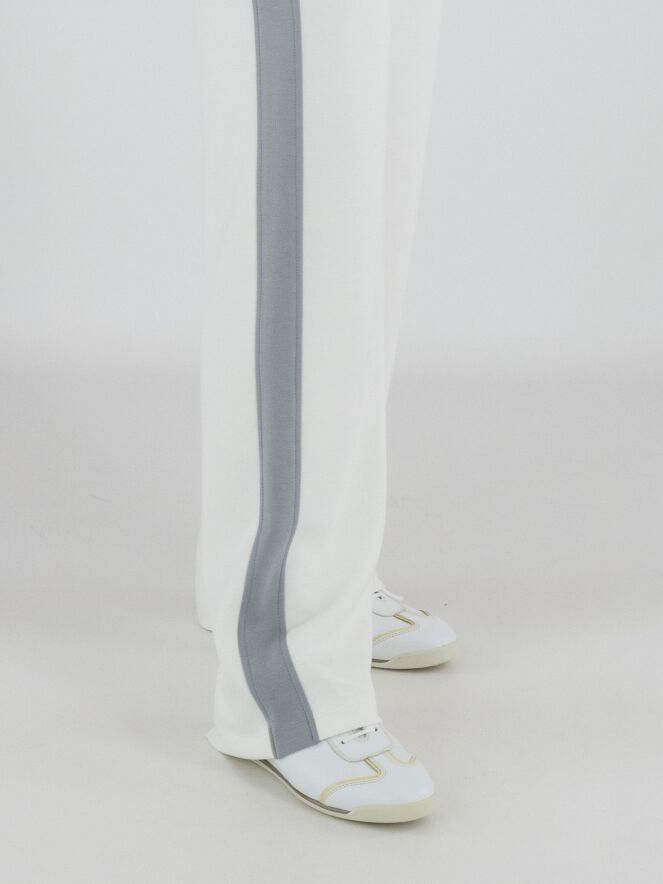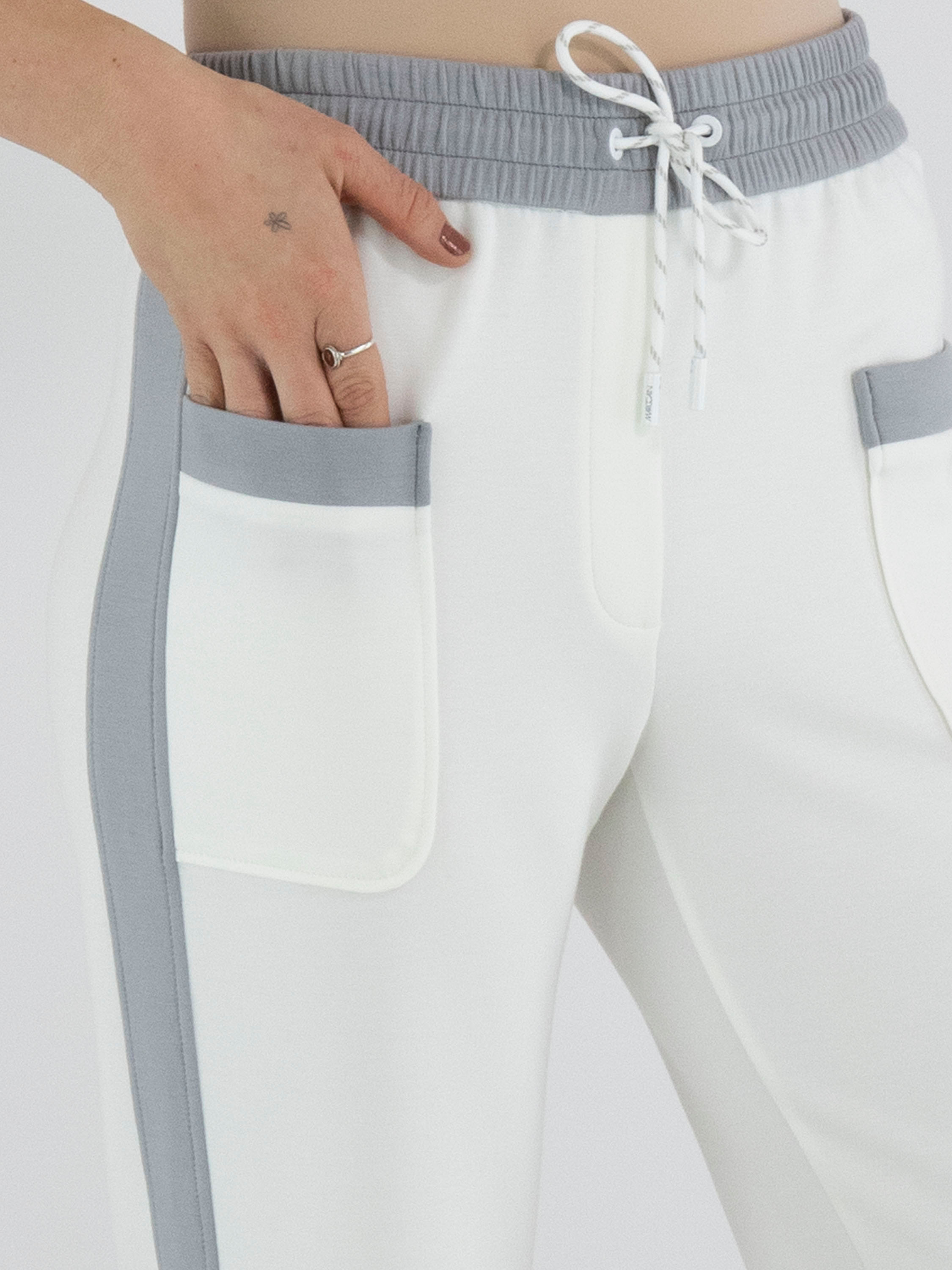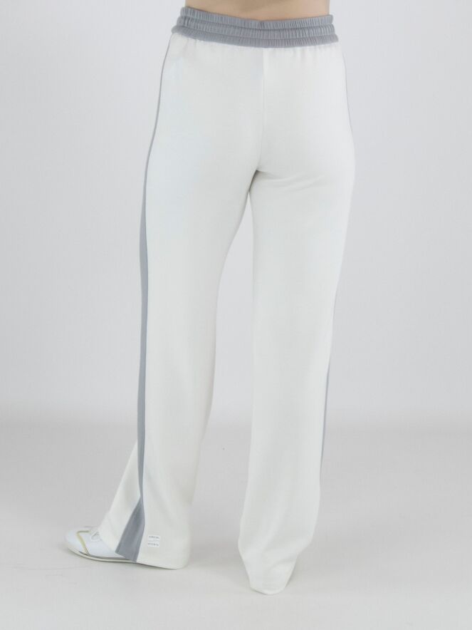 Eine Jogginghose von Marc Cain in Cremeweiß. In der Taille befindet sich ein breites, fein gelegtes elastisches Band in Hellgrau. In diesem Bund ist ein Kordelzug in Tunnelverarbeitung eingearbeitet. Entlang der gerade geschnittenen Hosenbeine verläuft seitlich eine breite hellgraue Biese. Diese Hose kann bei 30 Grad gewaschen werden.