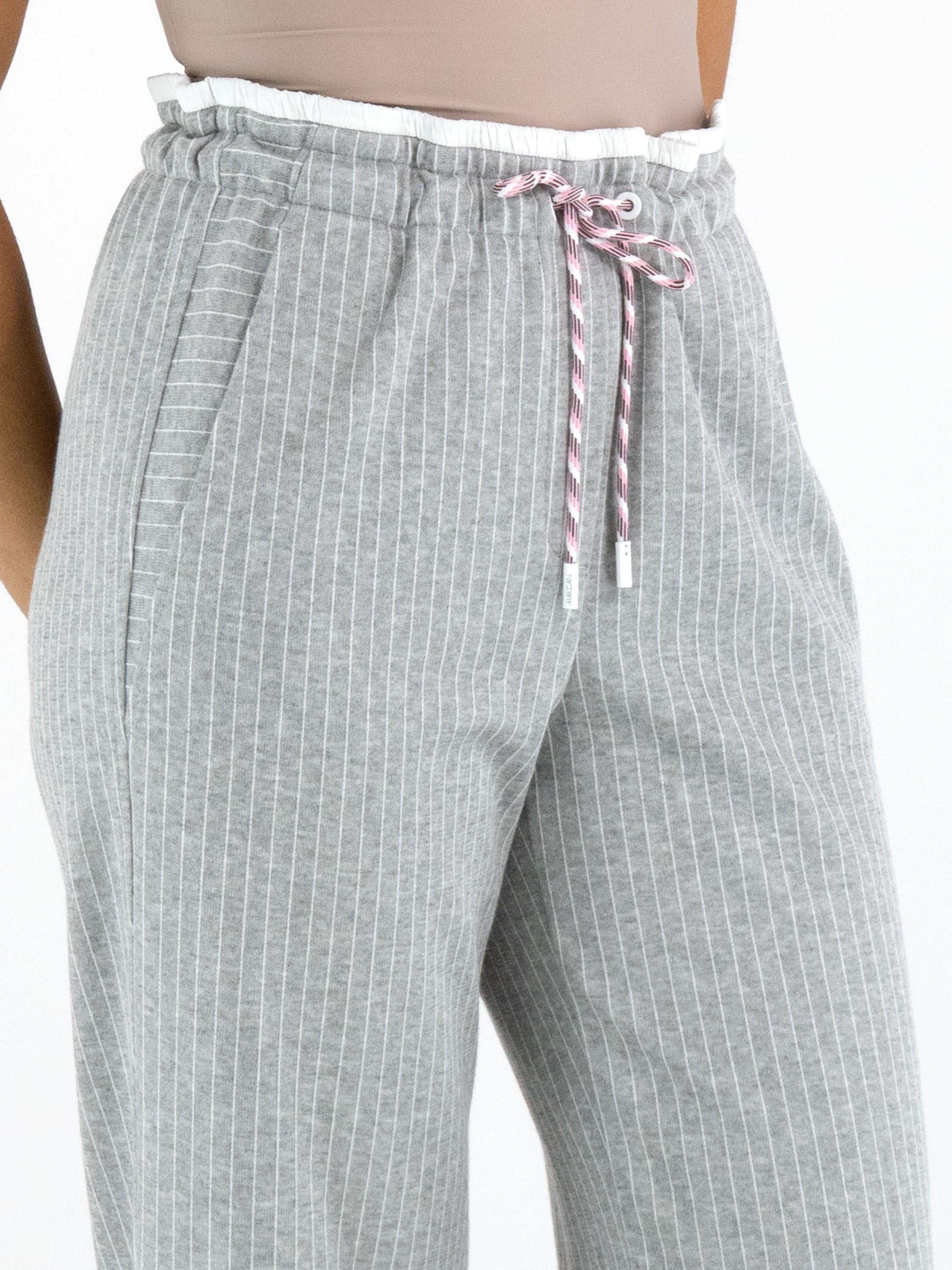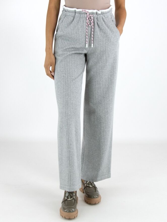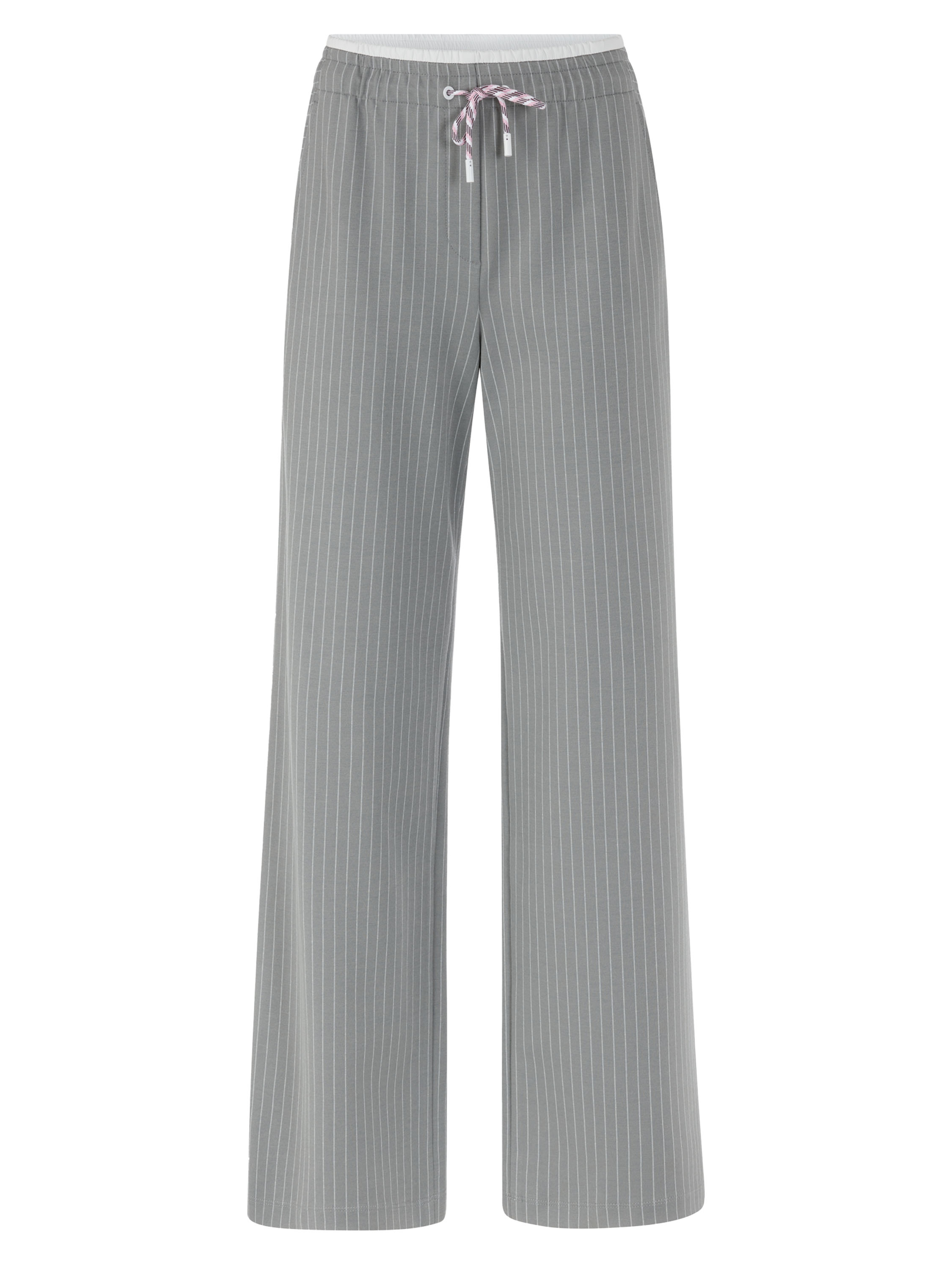 Eine Jogginghose von Marc Cain mit einem Kreidestreifenmuster in Hellgrau und Weiß. In der Taille befindet sich ein elastischer Bund mit einem Kordelzug in Tunnelverarbeitung. Die Hose hat Eingrifftaschen und kann bei 30 Grad gewaschen werden.