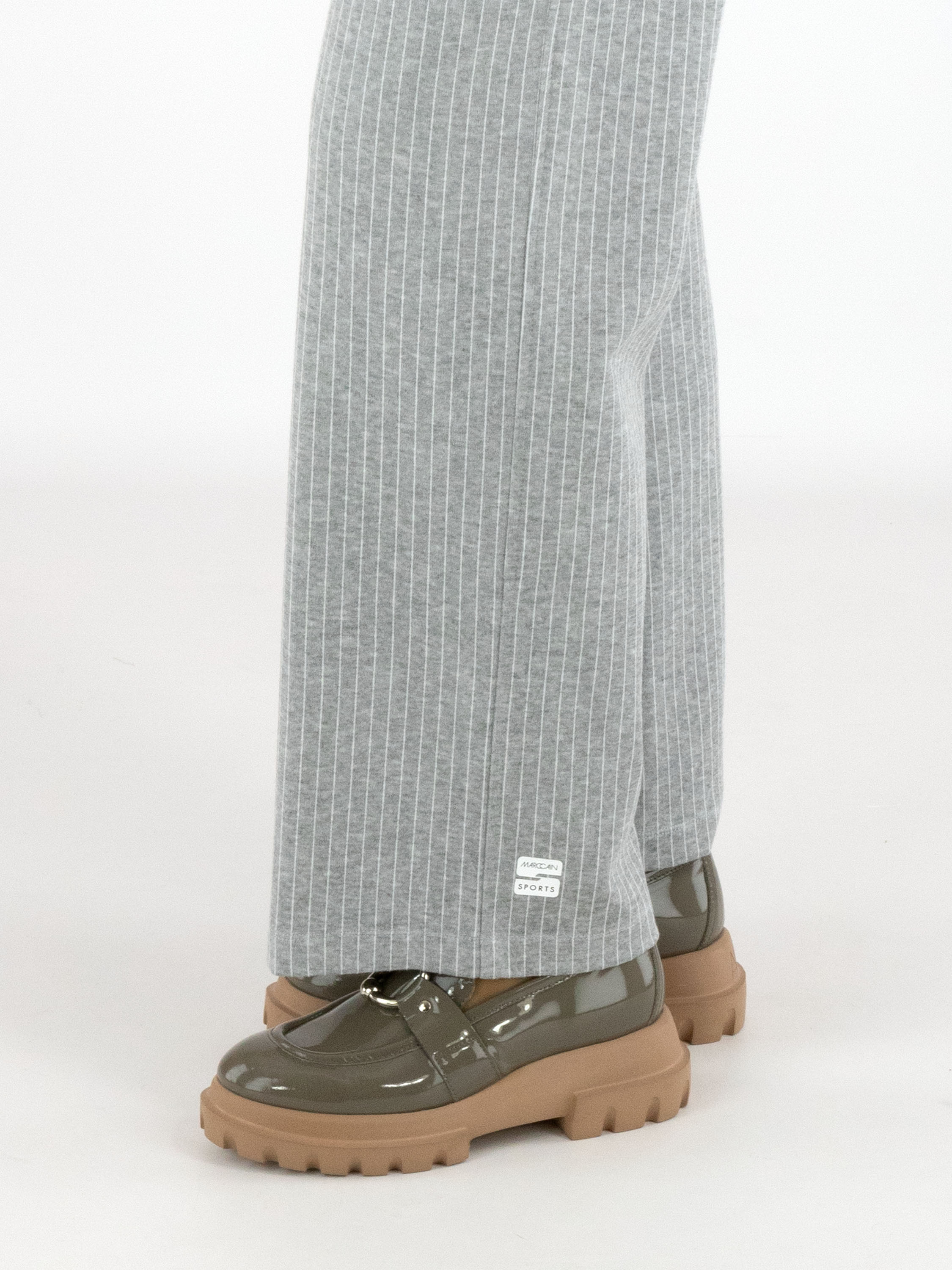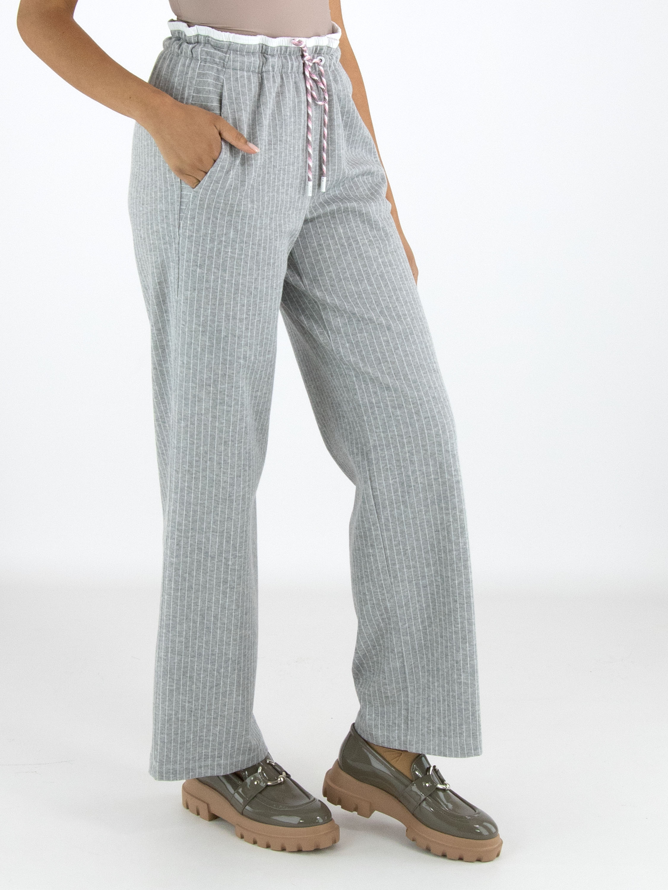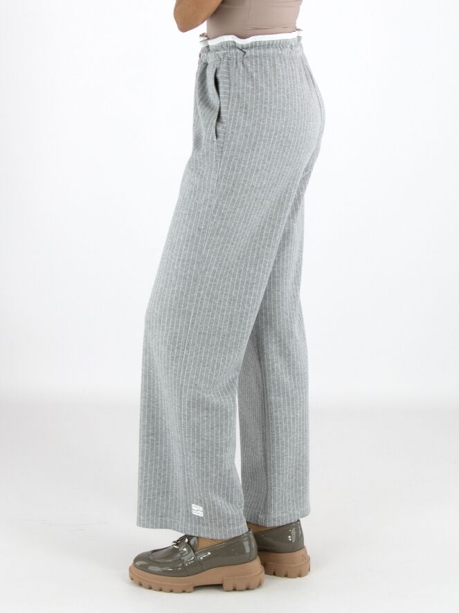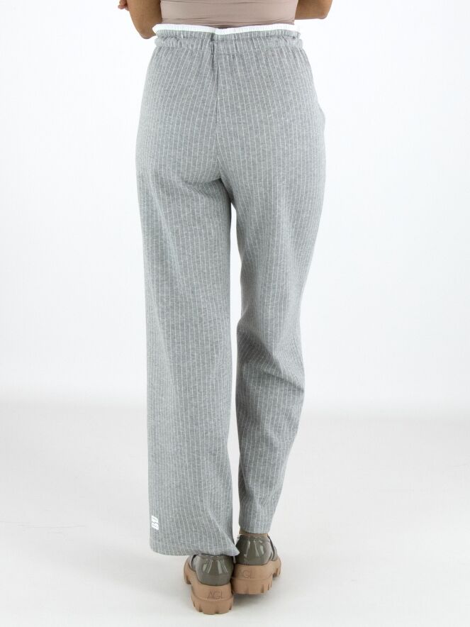 Eine Jogginghose von Marc Cain mit einem Kreidestreifenmuster in Hellgrau und Weiß. In der Taille befindet sich ein elastischer Bund mit einem Kordelzug in Tunnelverarbeitung. Die Hose hat Eingrifftaschen und kann bei 30 Grad gewaschen werden.