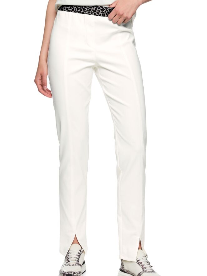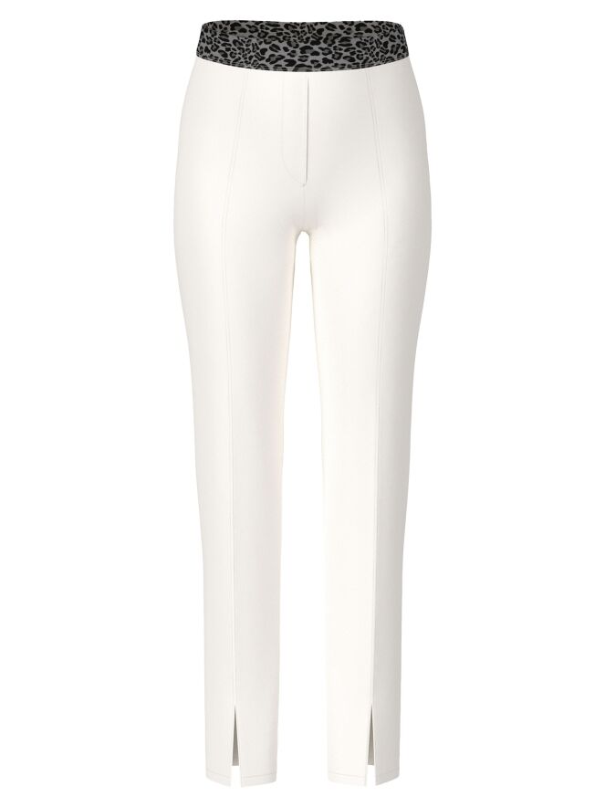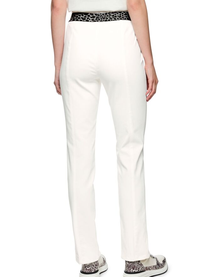 Eine Hose von Marc Cain in einem cremeweißen Uniton. In der Taille befindet sich ein elastisches Band im Leopardenprint in verschiedenen Grau- und Schwarztönen. Mittig auf den Hosenbeinen verläuft eine Naht. Am unteren Außenrand befindet sich ein kleiner Schlitz. Diese Hose kann bei 30 Grad gewaschen werden.