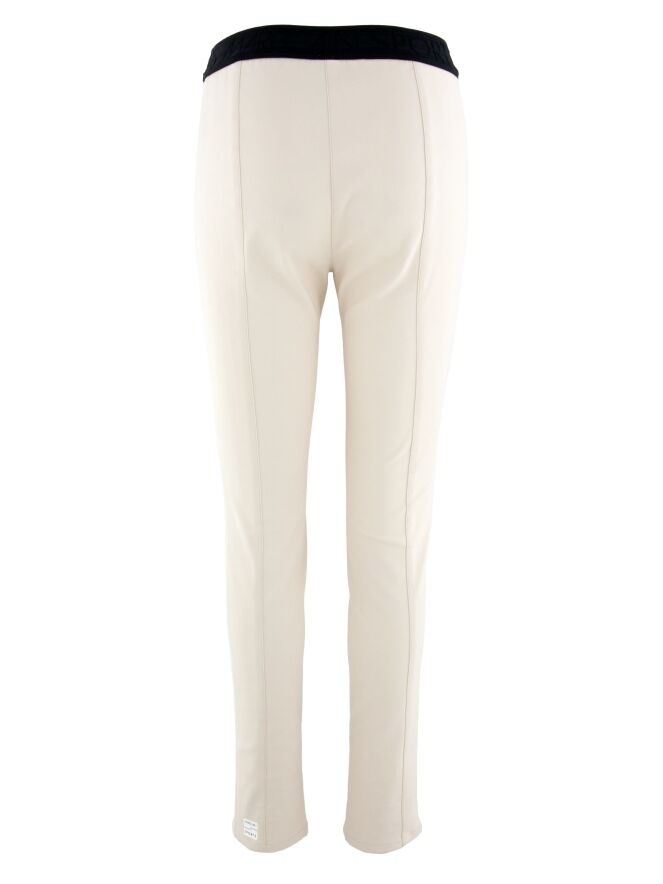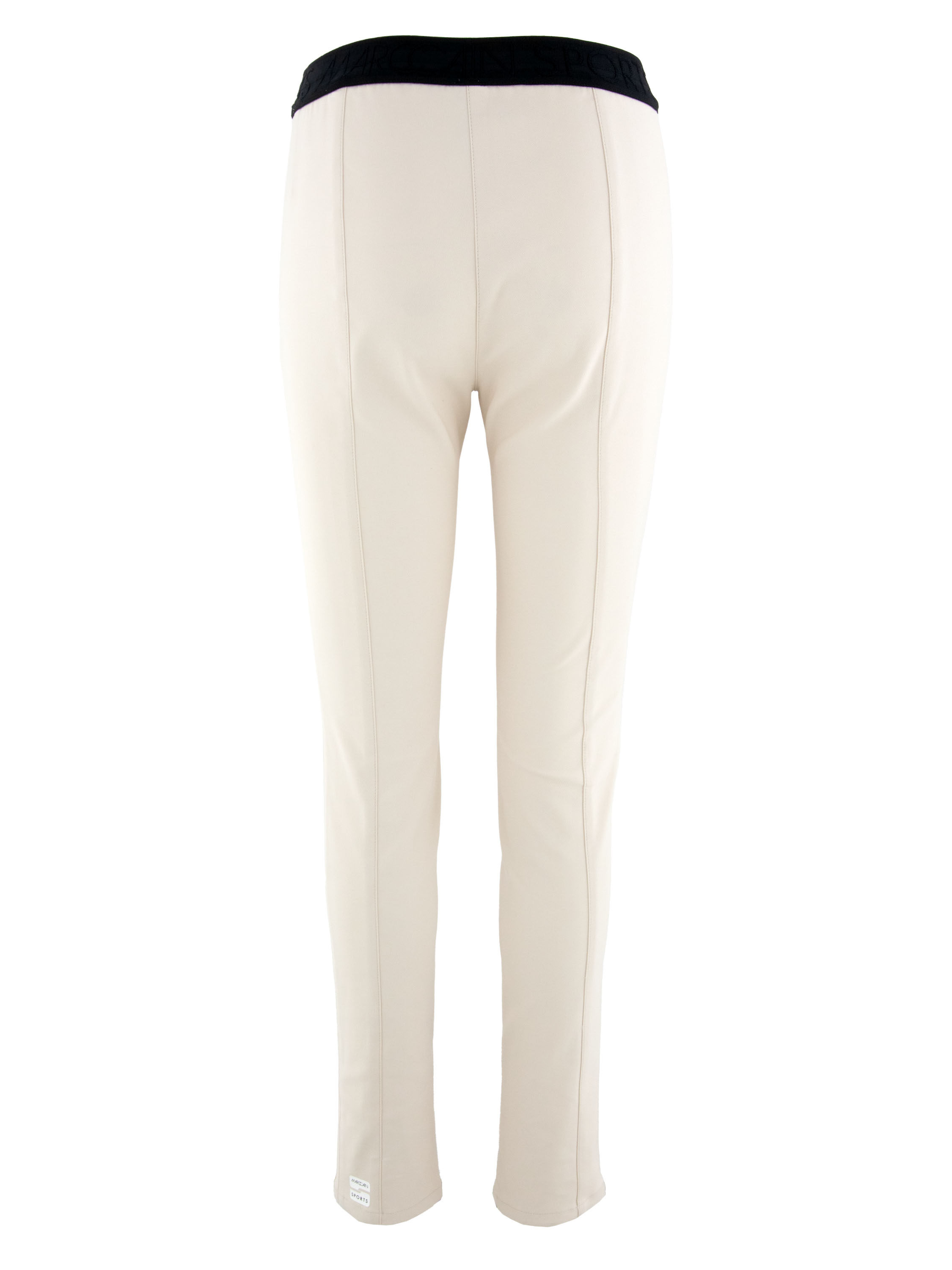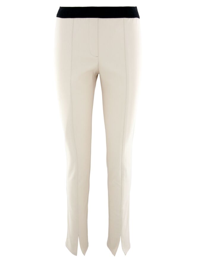 Eine Hose von Marc Cain in der Farbe Nude. In der Taille befindet sich ein breites schwarzes Elastikband. Mittig auf den Hosenbeinen verläuft eine Naht. Diese Hose kann bei 30 Grad gewaschen werden.