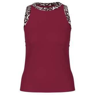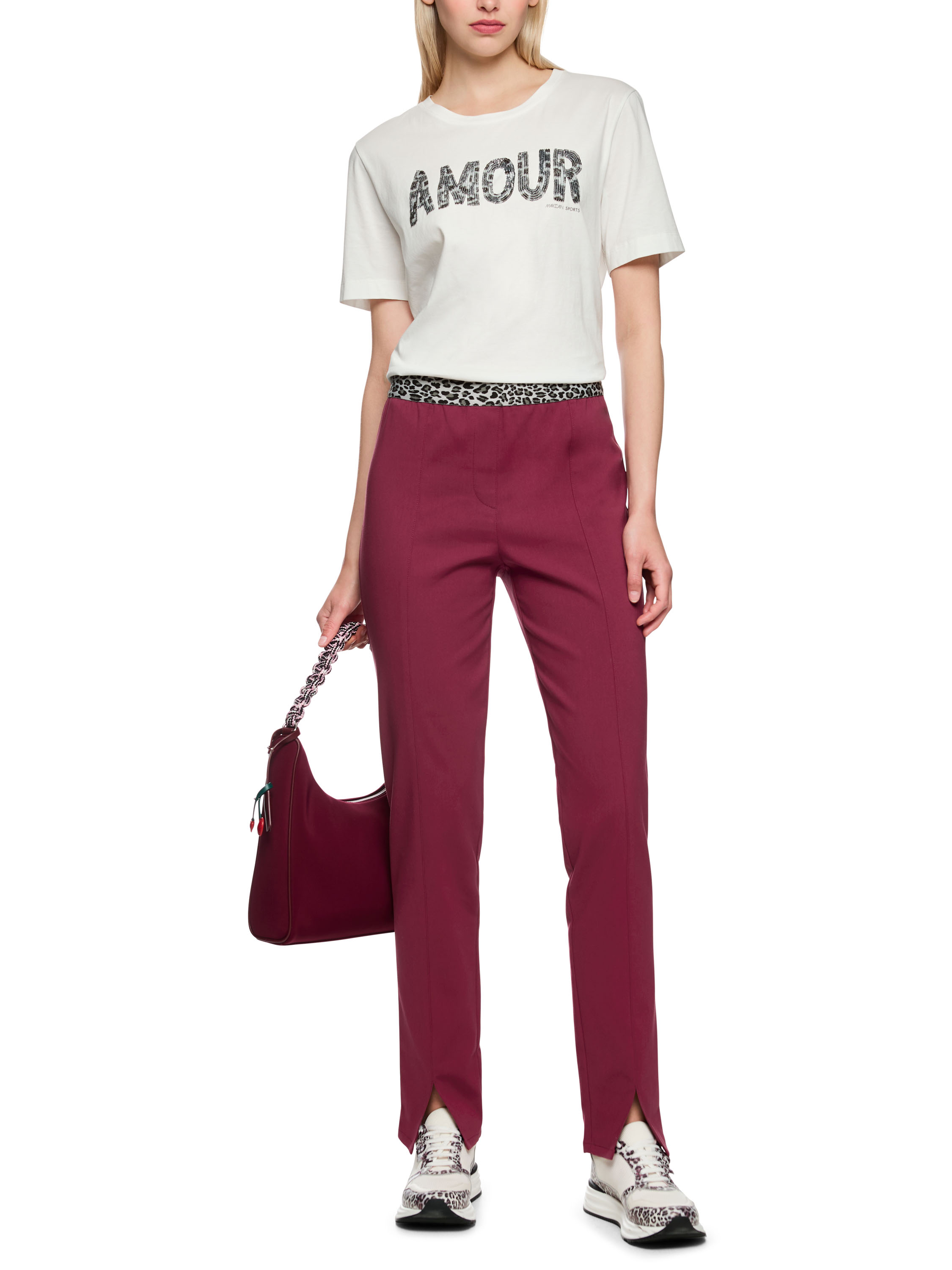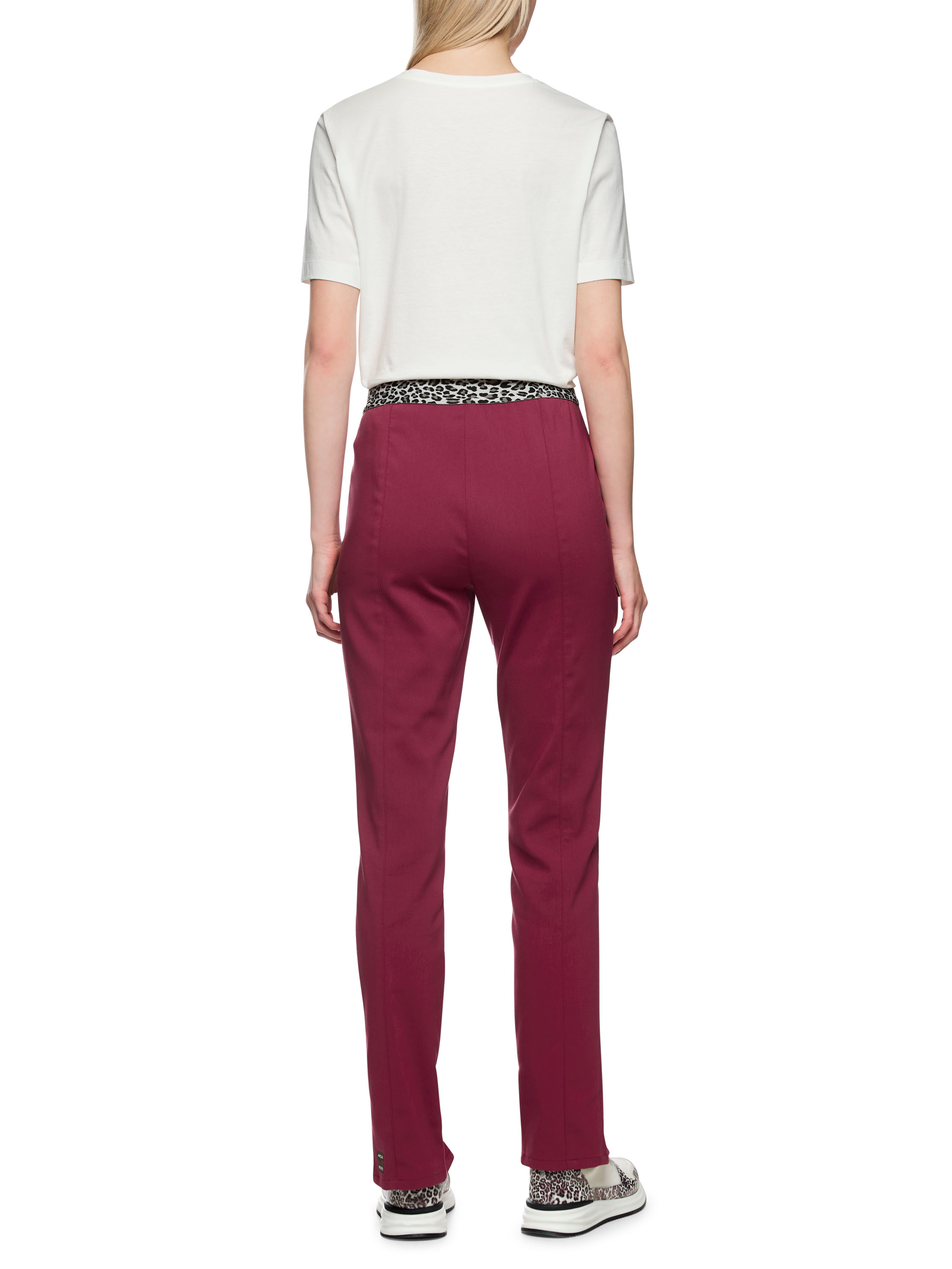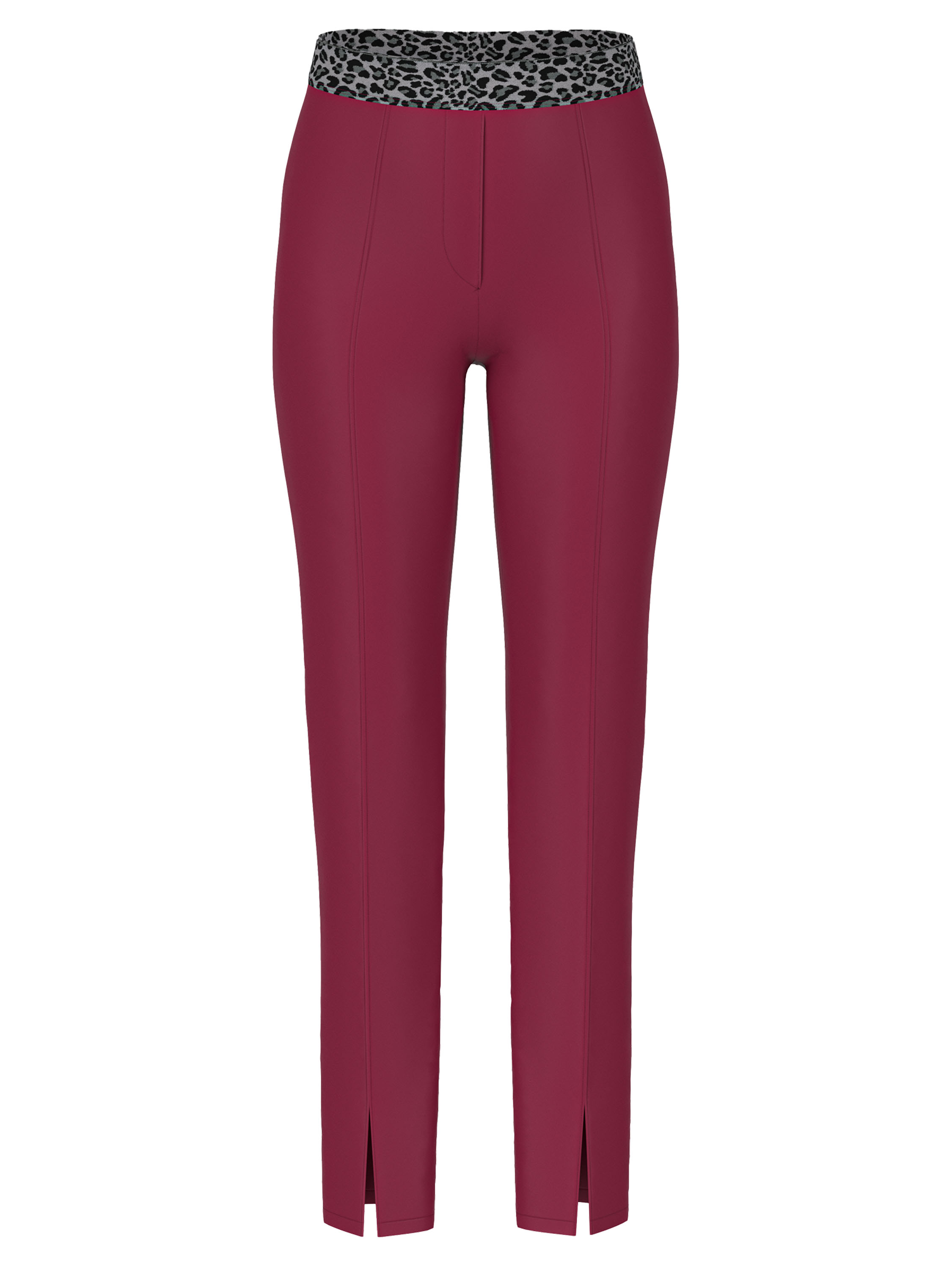 Eine Hose von Marc Cain in einem uni Bordeauxrot. In der Taille befindet sich ein elastisches Band im Leopardenprint in verschiedenen Grau- und Schwarztönen. Mittig auf den Hosenbeinen verläuft eine Naht. Am unteren äußeren Beinabschluss befindet sich ein kleines Schlitzdetail. Diese Hose kann bei 30 Grad gewaschen werden.