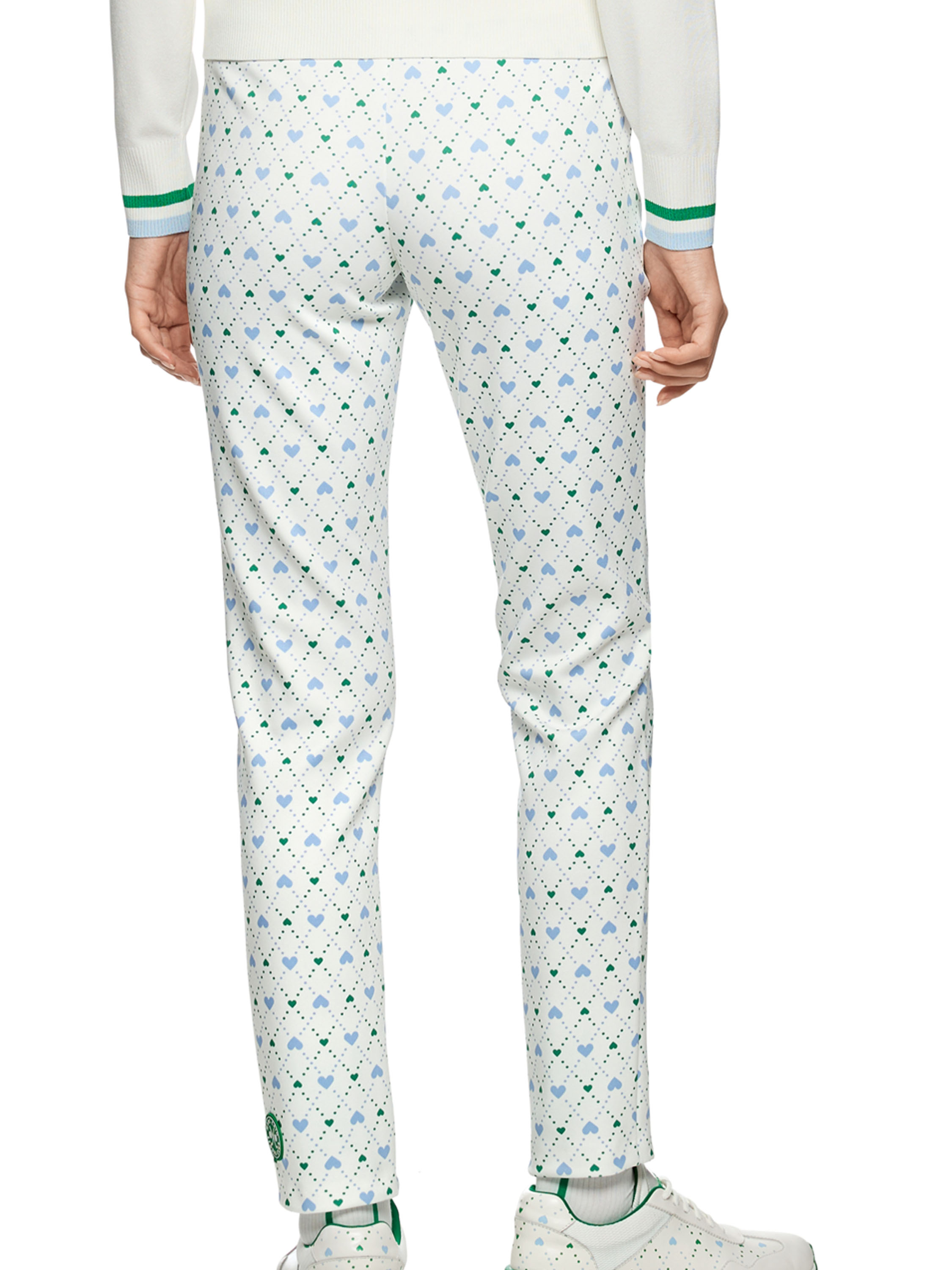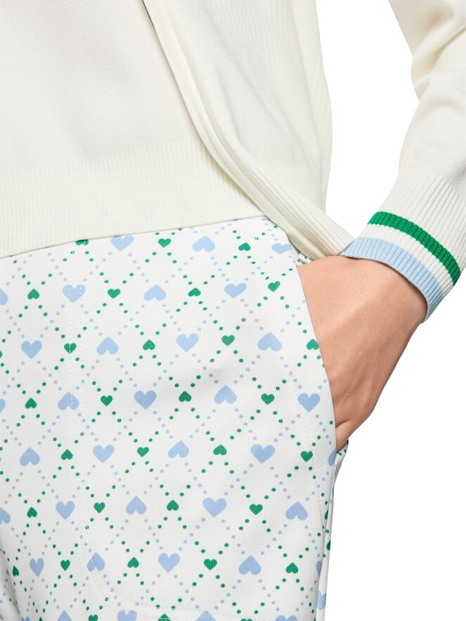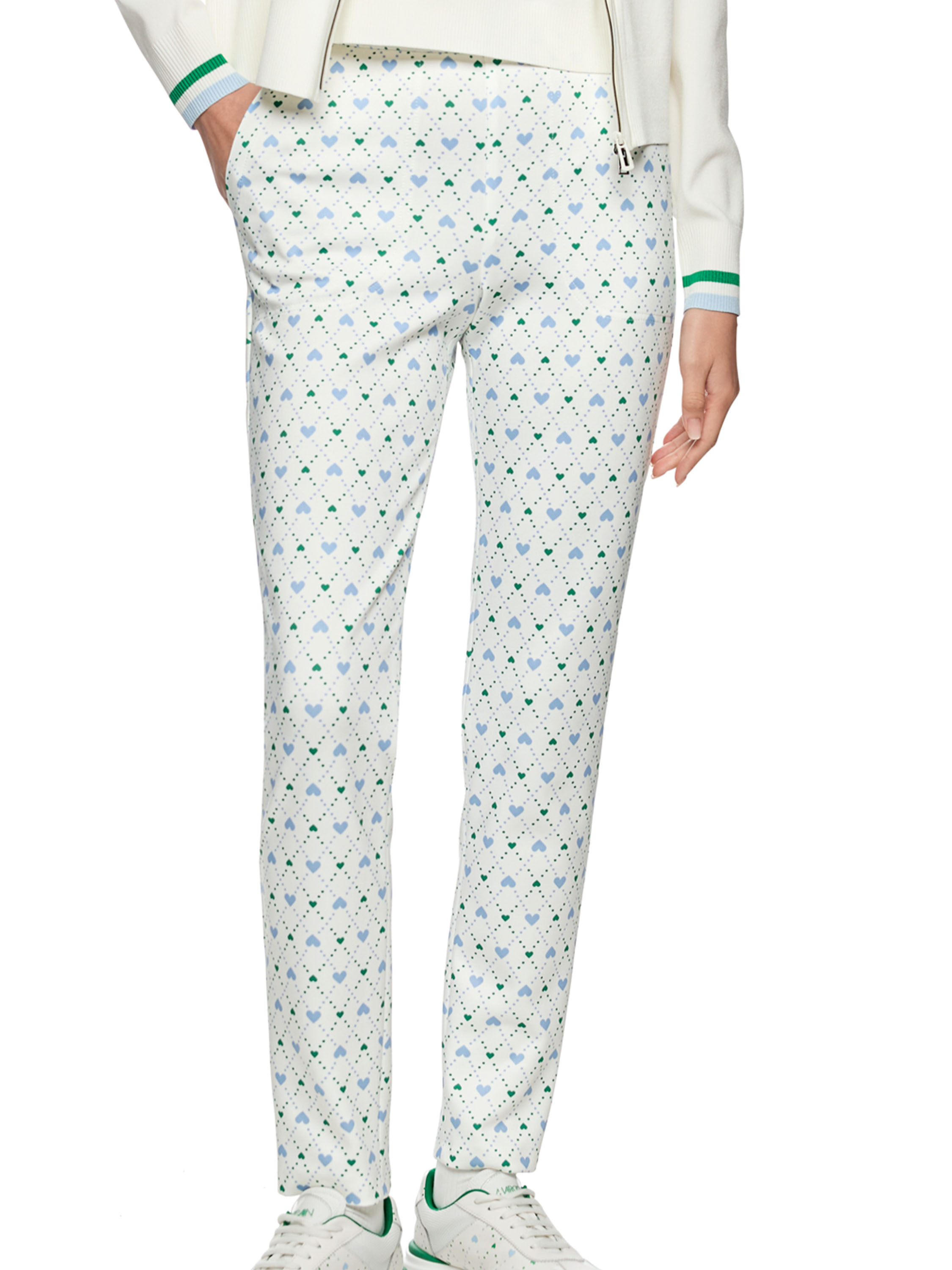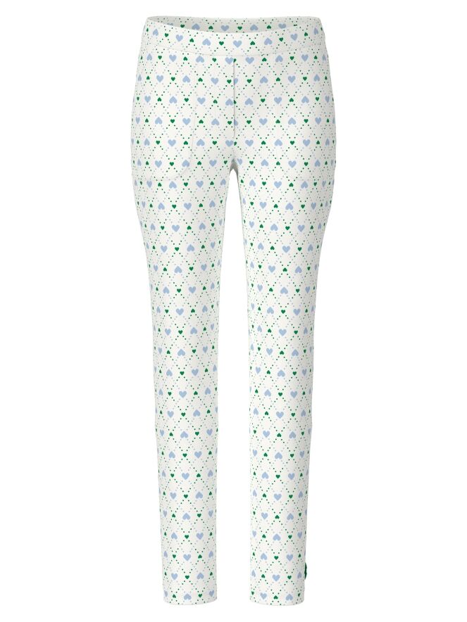 Eine Hose von Marc Cain in Scuba-Qualität mit einem Karomuster mit Tupfen und Herzmotiven in Blau und Dunkelgrün auf cremeweißem Hintergrund. Die Hose verfügt über Seitentaschen und einen elastischen Bund. Diese Hose kann bei 30 Grad gewaschen werden.