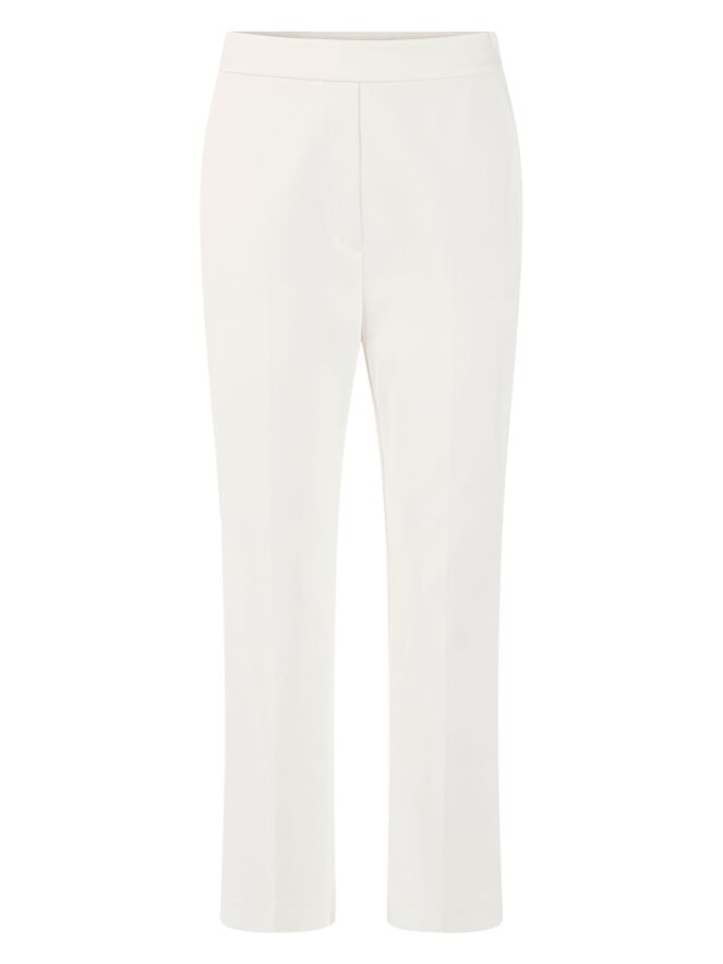Eine Hose von Marc Cain in Cremeweiß. An der linken Seite ist vom Bund aus ein Reißverschluss bis zur Hüfte eingearbeitet. In der Mitte der Hosenbeine verläuft eine eingepresste Falte. Die Hose verfügt über Seitentaschen und kann bei 30 Grad gewaschen werden.