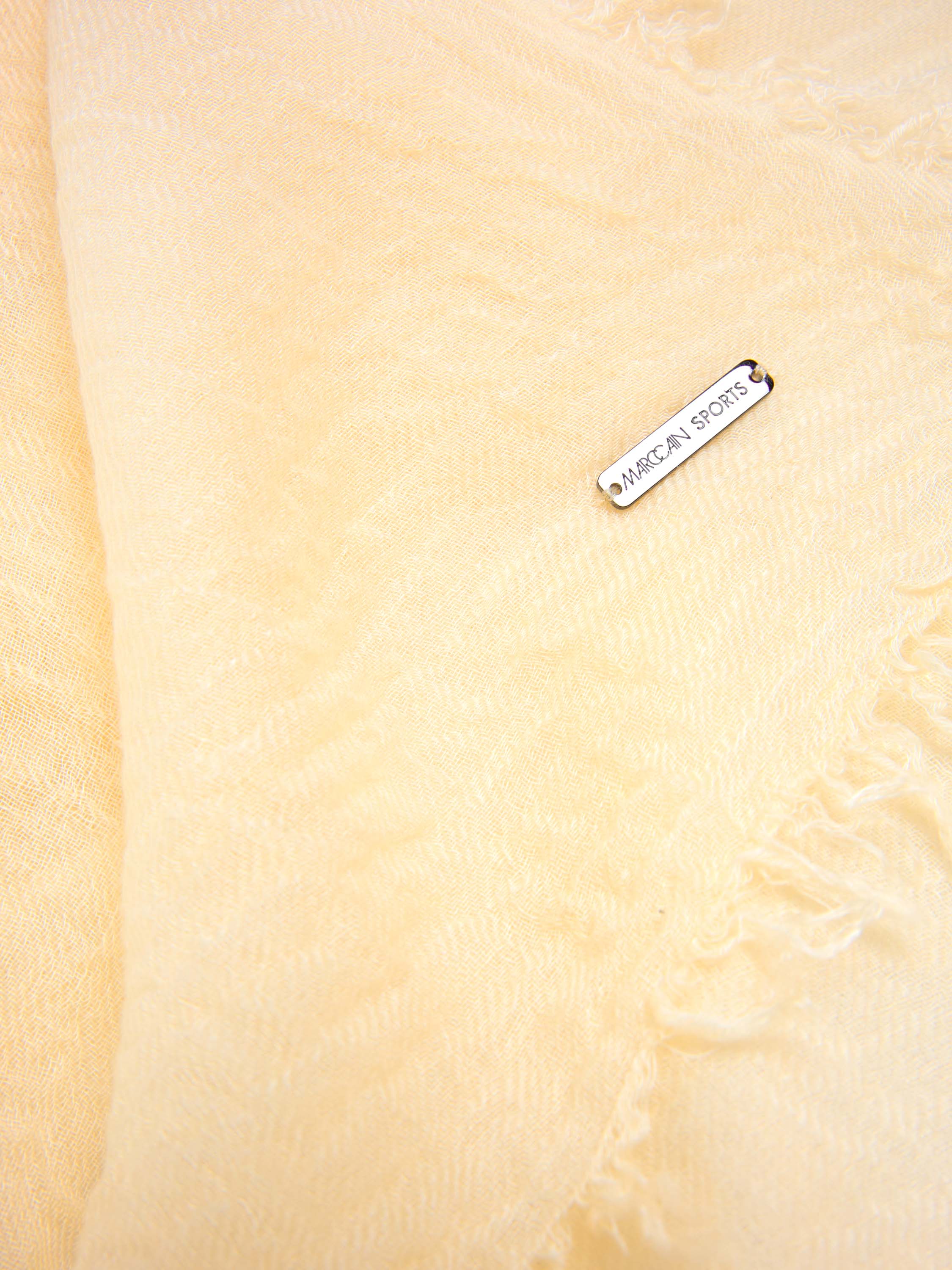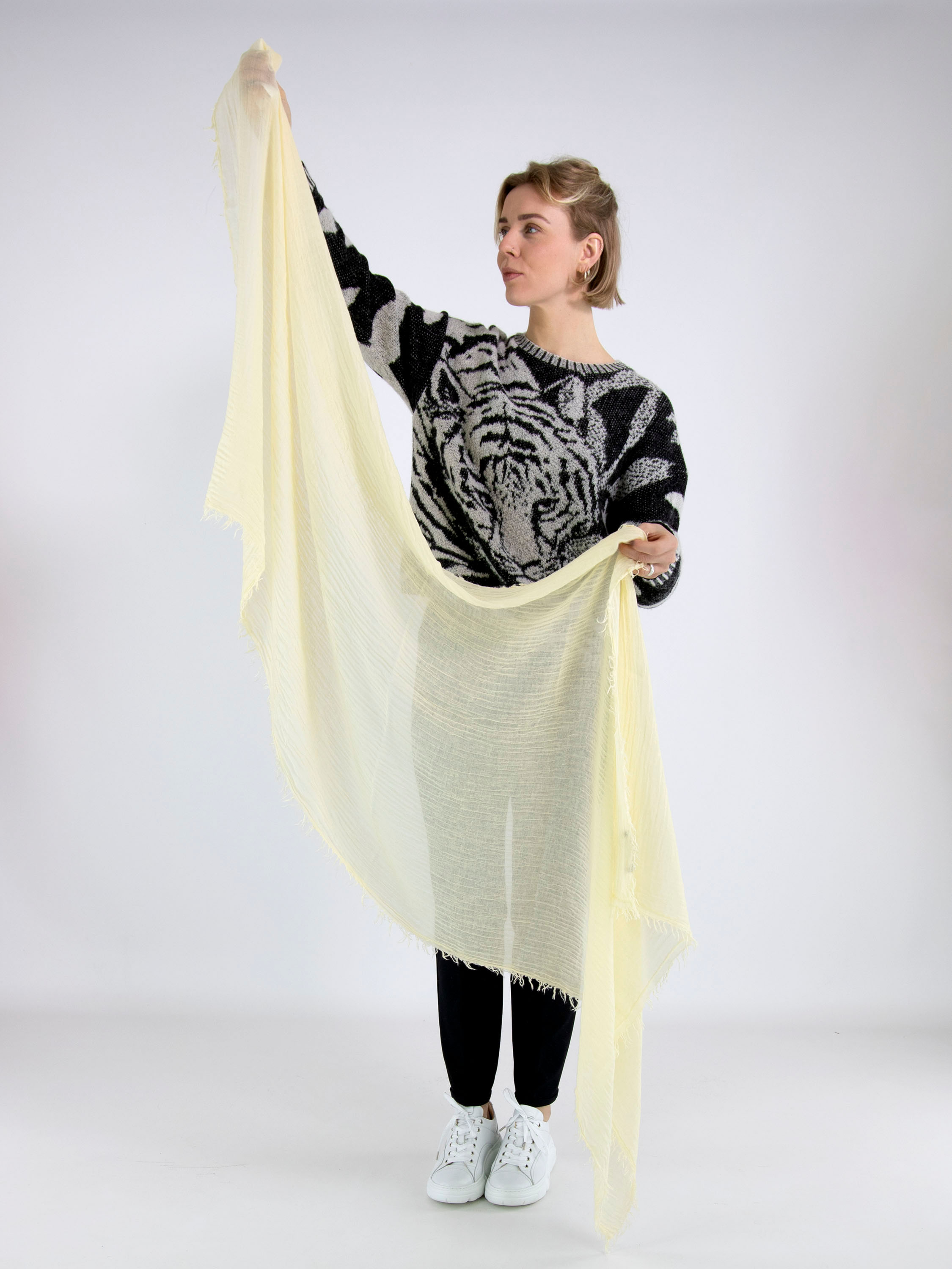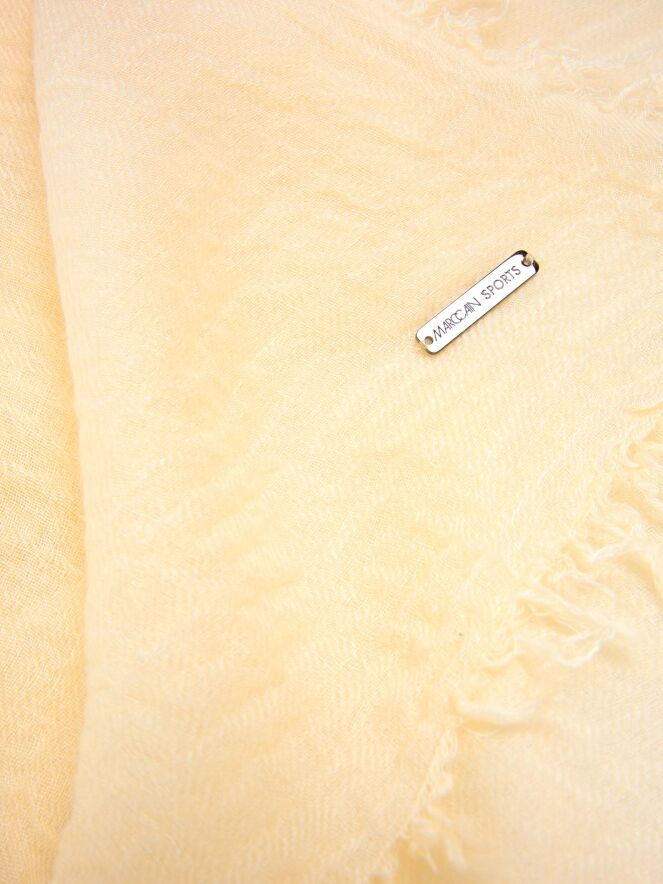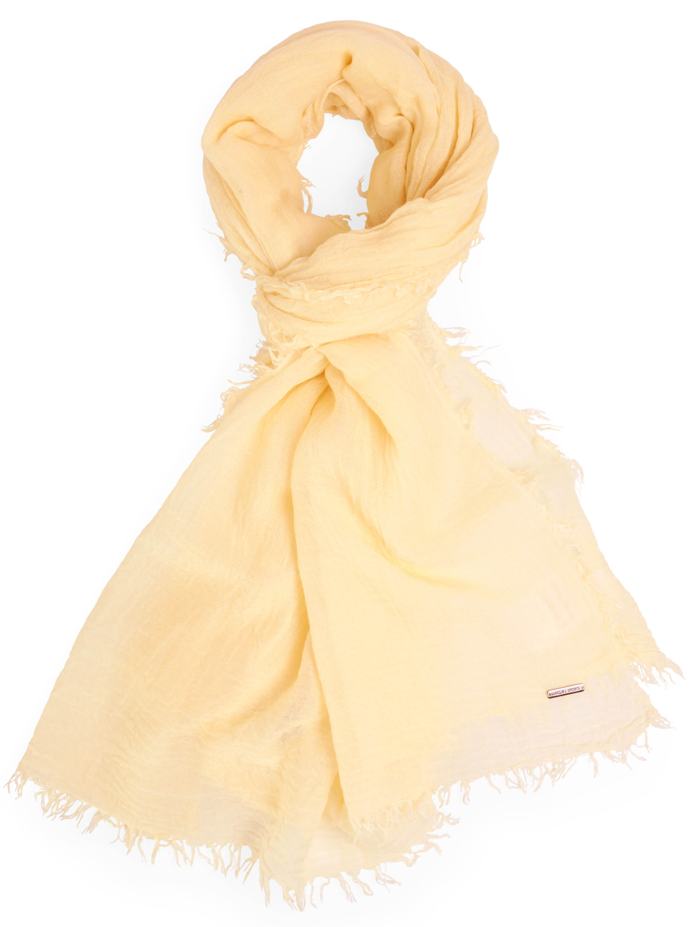 Ein fein gelegter Schal von Marc Cain in Pastellgelb. Die Enden des Schals sind fein ausgefranst. Dieser Schal kann per Hand gewaschen werden.