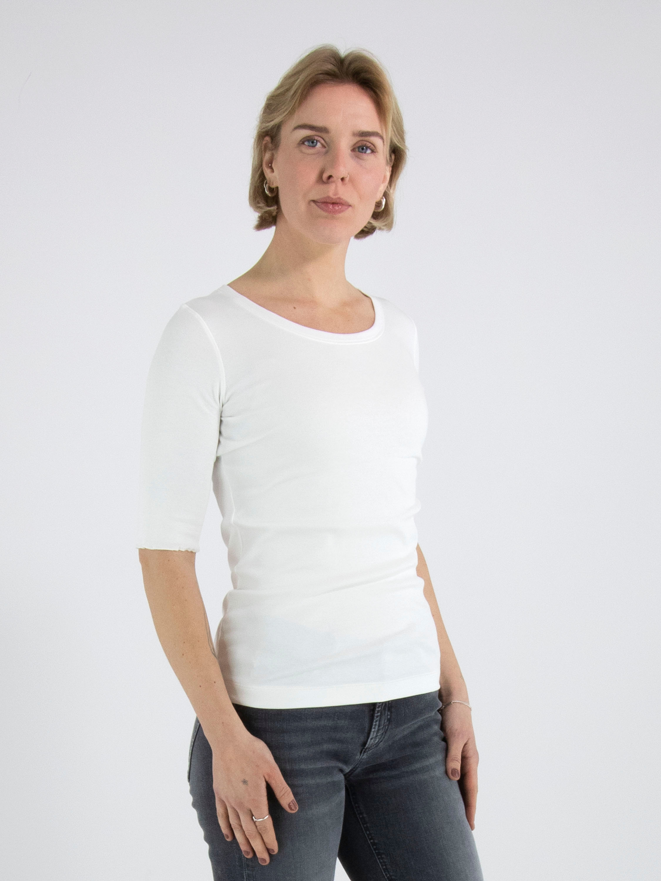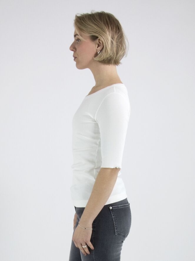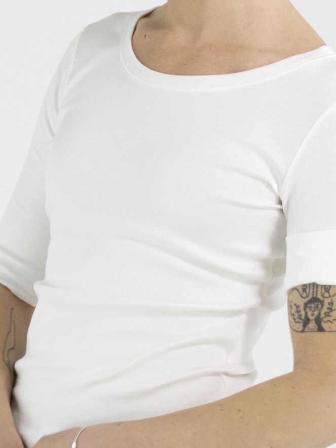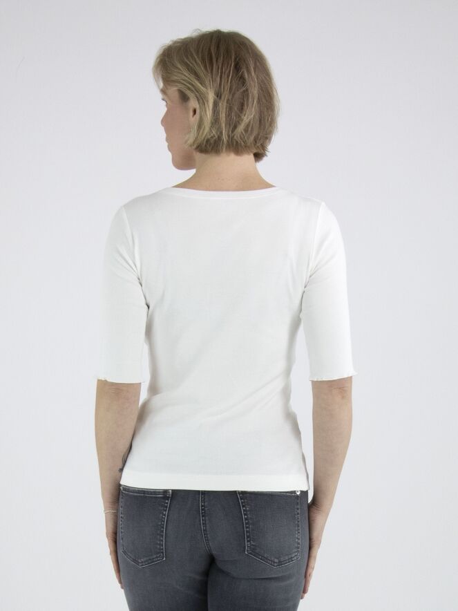 Ein Shirt von Marc Cain aus fein geripptem Stoff in Cremeweiß. Das Shirt hat einen Rundhalsausschnitt und kurze Ärmel mit Umschlag. Dieses Shirt kann bei 30 Grad gewaschen werden.