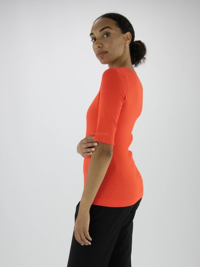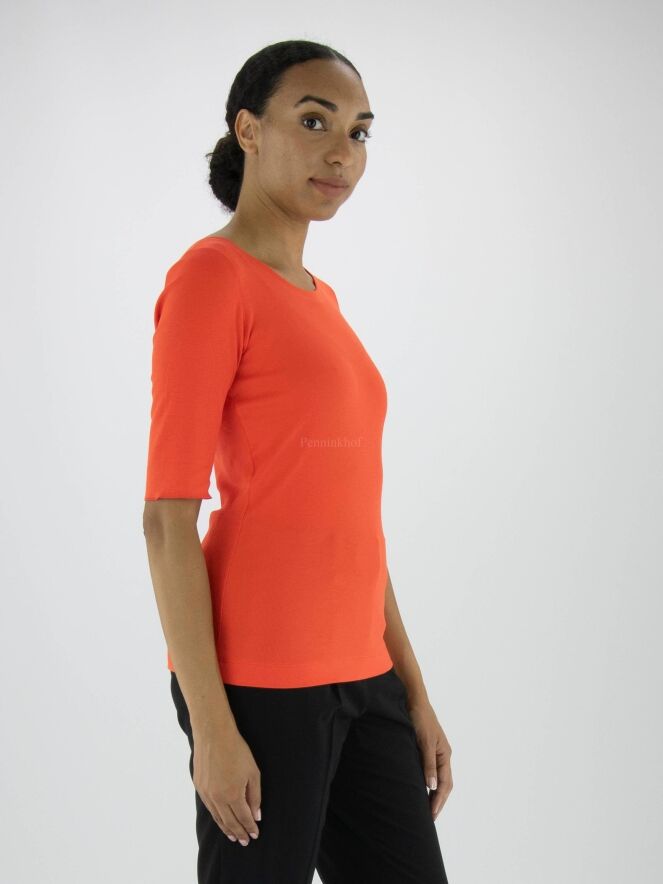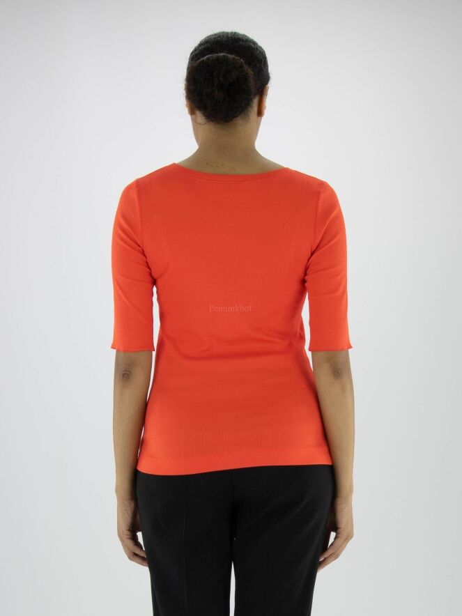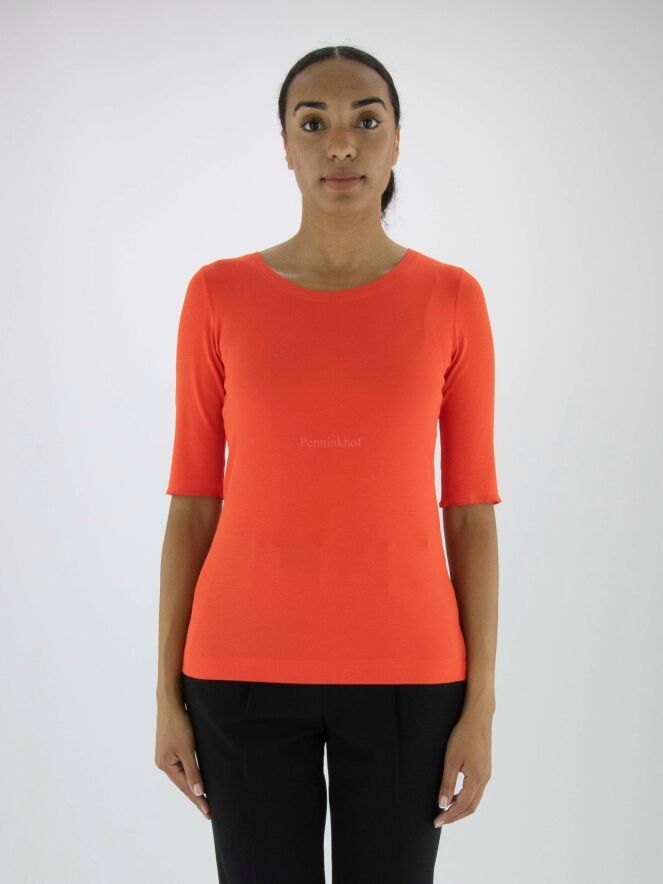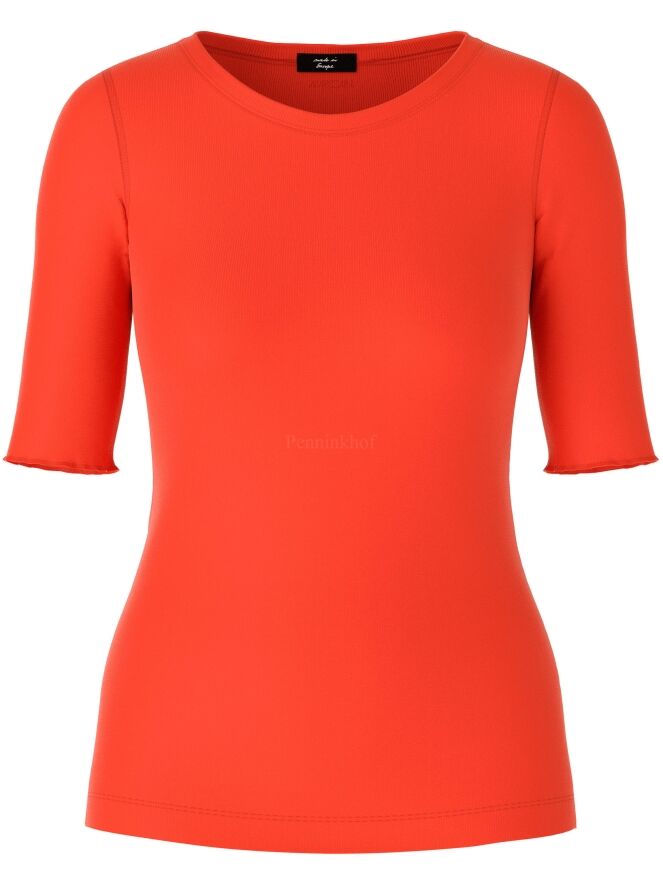 Ein Shirt der Marke Marc Cain in der Farbe Orange. Das Shirt hat kurze Ärmel mit Umschlag und einen Rundhalsausschnitt. Dieses Shirt kann bei 30 Grad gewaschen werden.