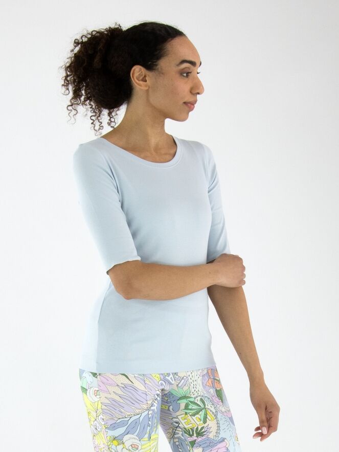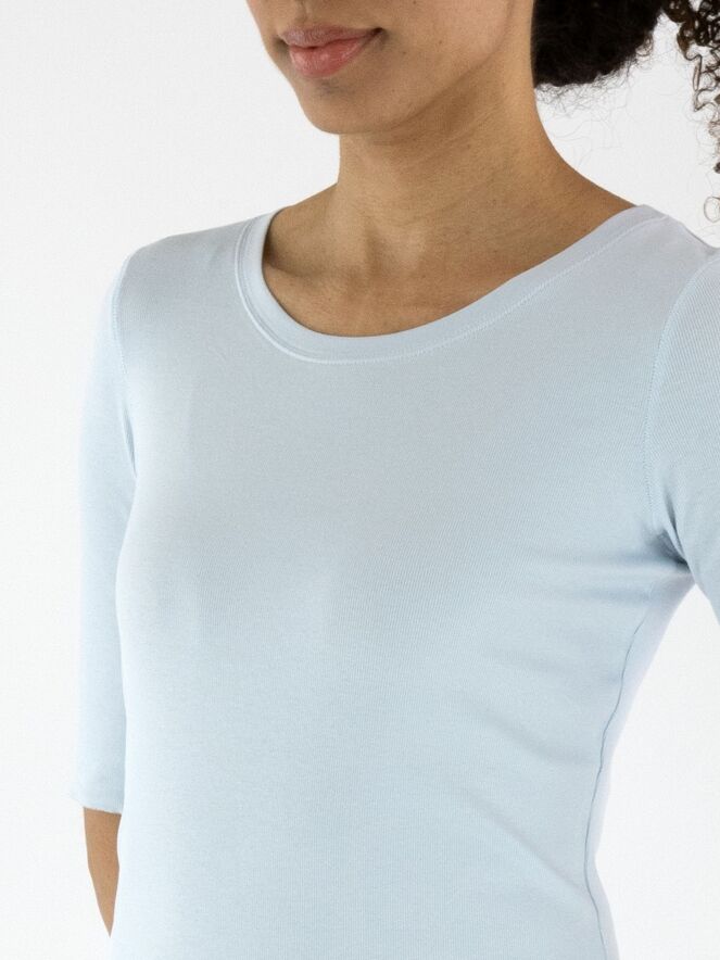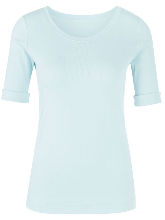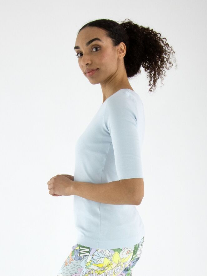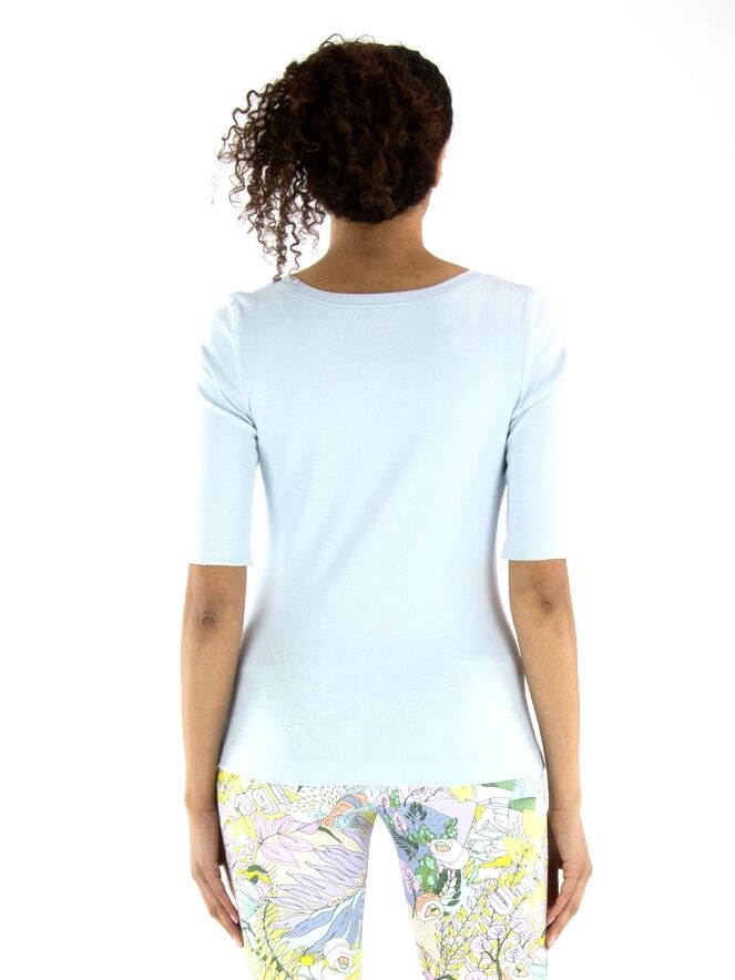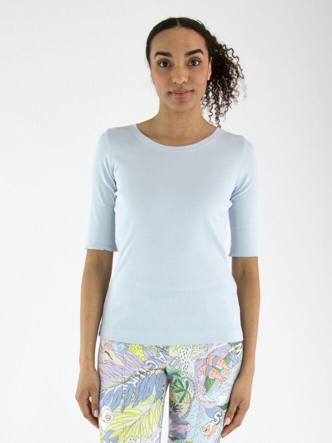 Ein Shirt von Marc Cain in Pastellblau. Die kurzen Ärmel haben einen Umschlag. Das Shirt hat einen runden Ausschnitt und kann bei 30 Grad gewaschen werden.