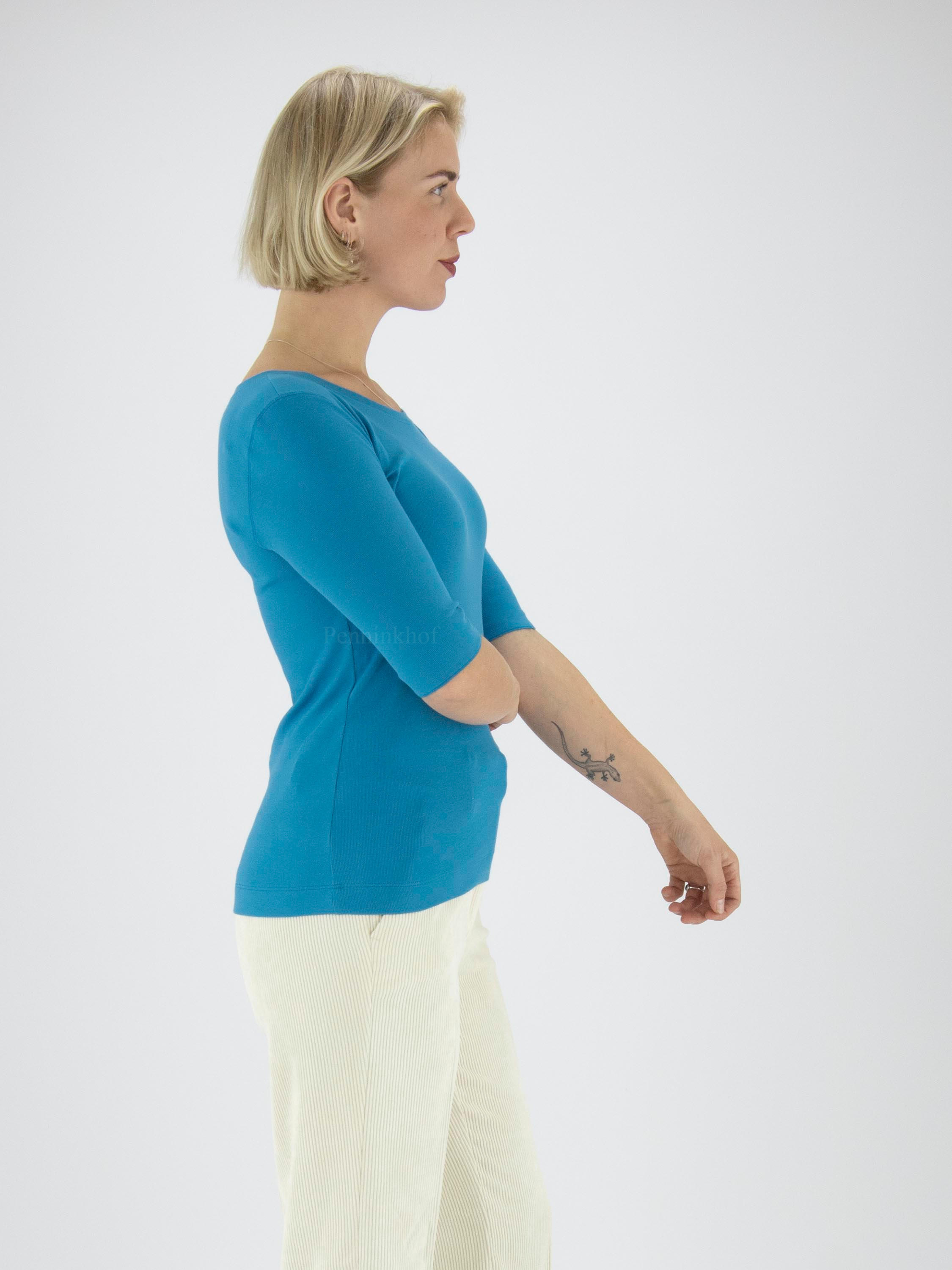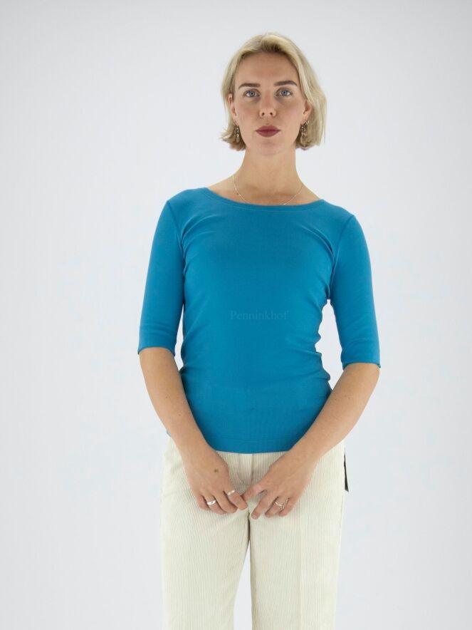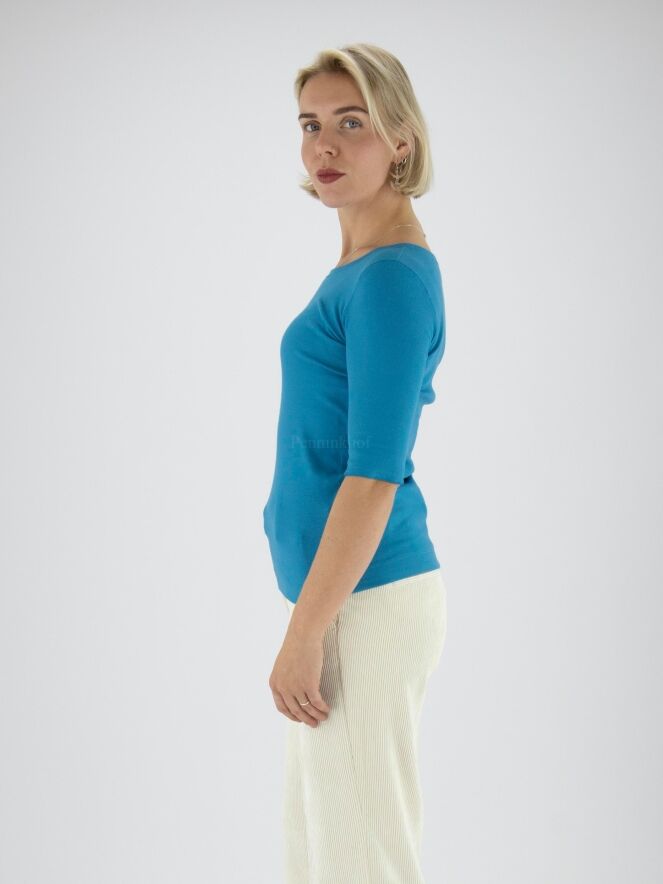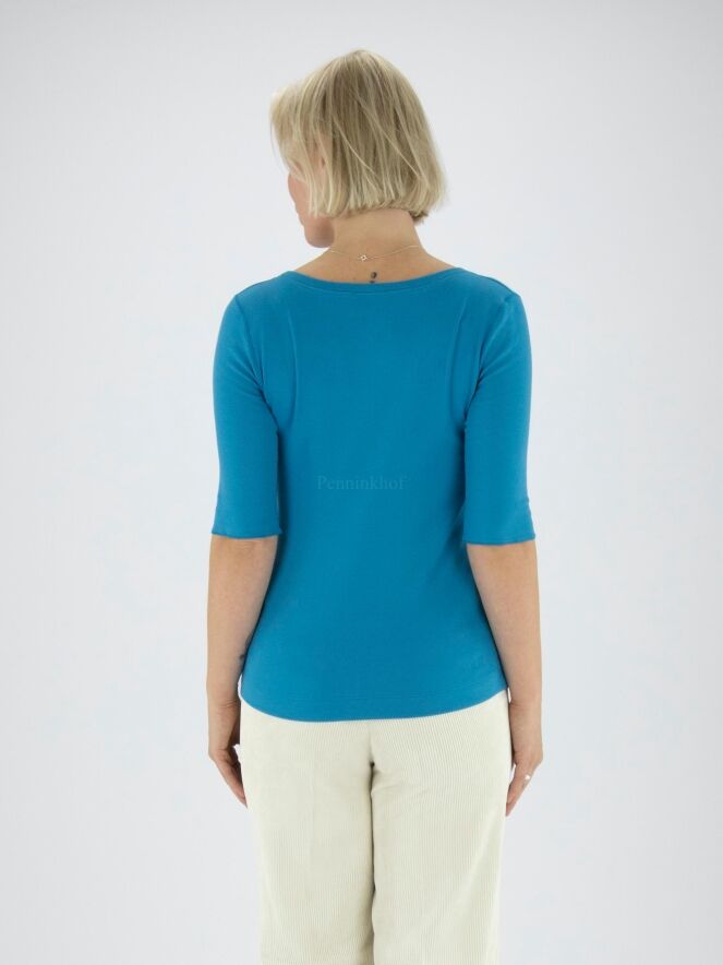 Ein Shirt von Marc Cain in der Farbe Blau. Die kurzen Ärmel haben einen Aufschlag. Das Shirt hat einen Rundhalsausschnitt und kann bei 30 Grad gewaschen werden.