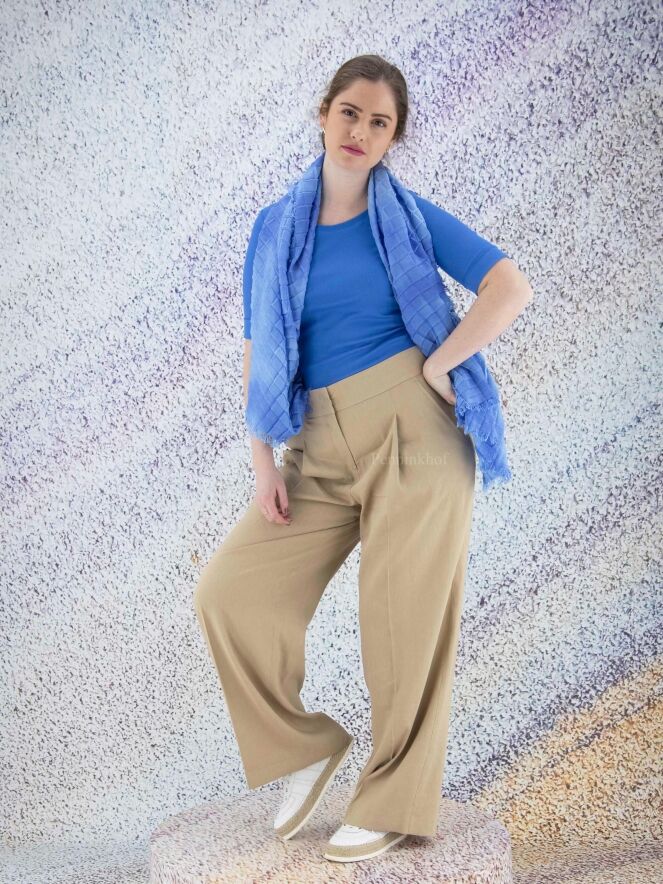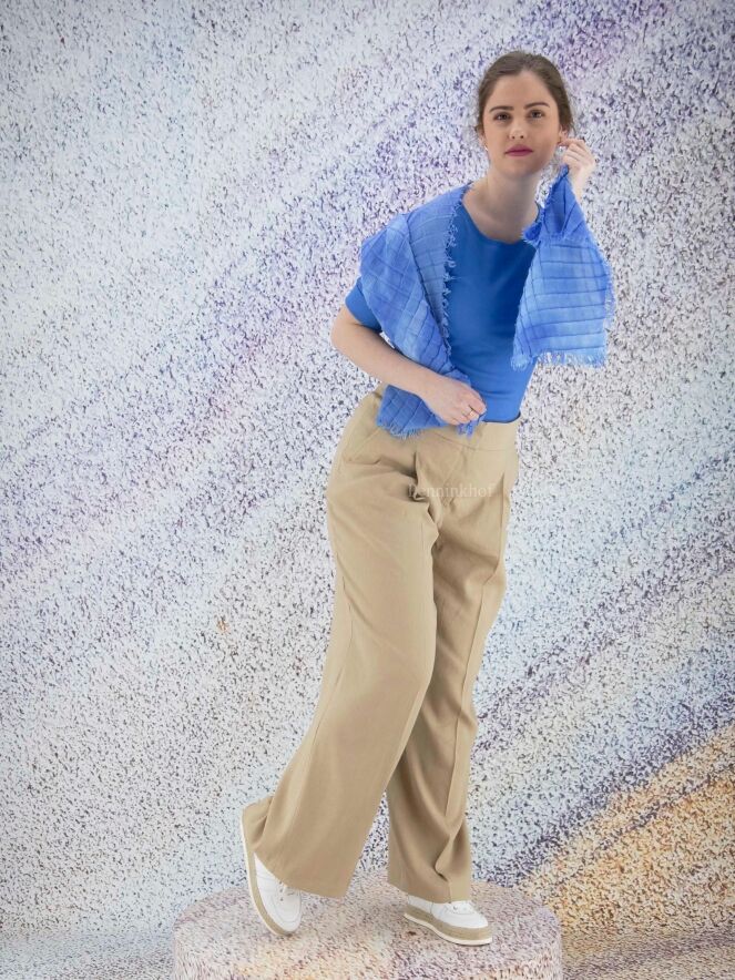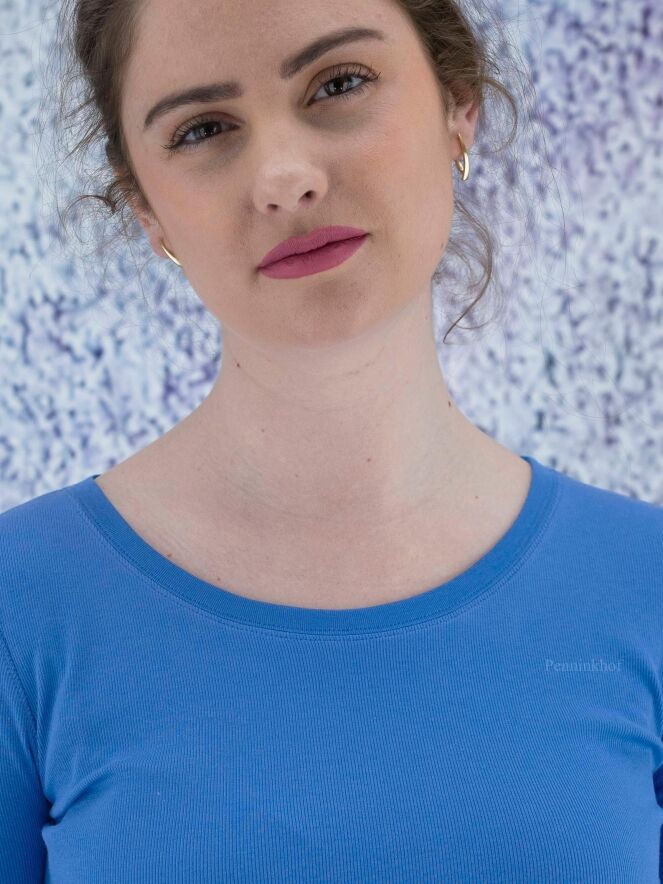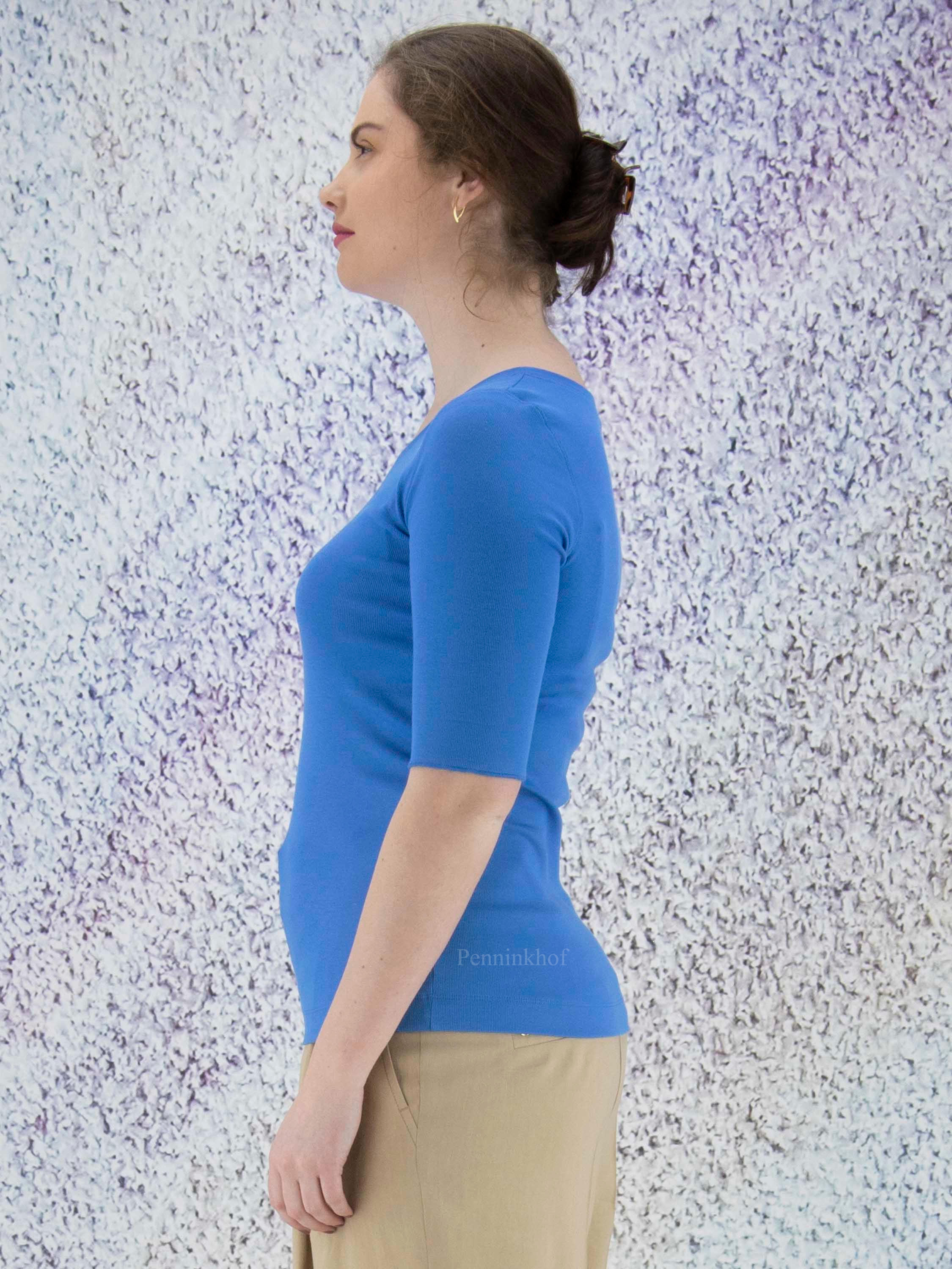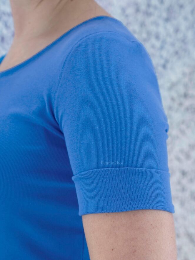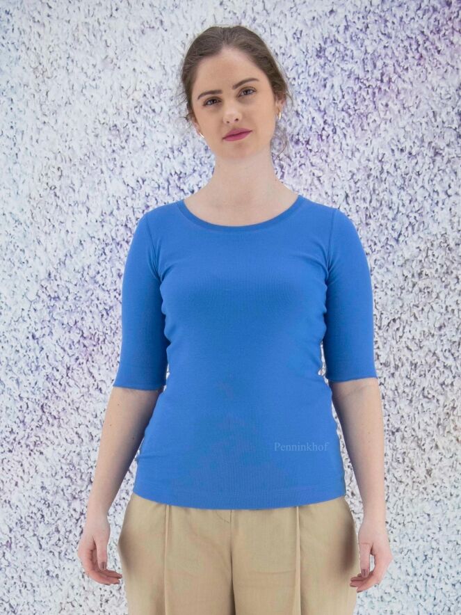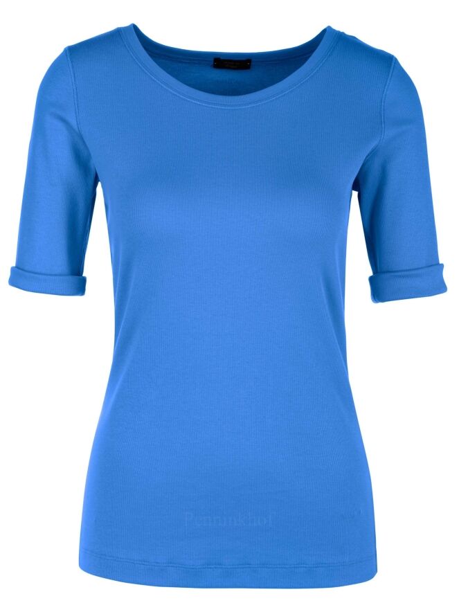 Ein blaues Shirt der Designermode von Marc Cain. Das Shirt hat einen Rundhalsausschnitt und kurze Ärmel mit Umschlag. Dieses Shirt kann bei 30 Grad gewaschen werden.
