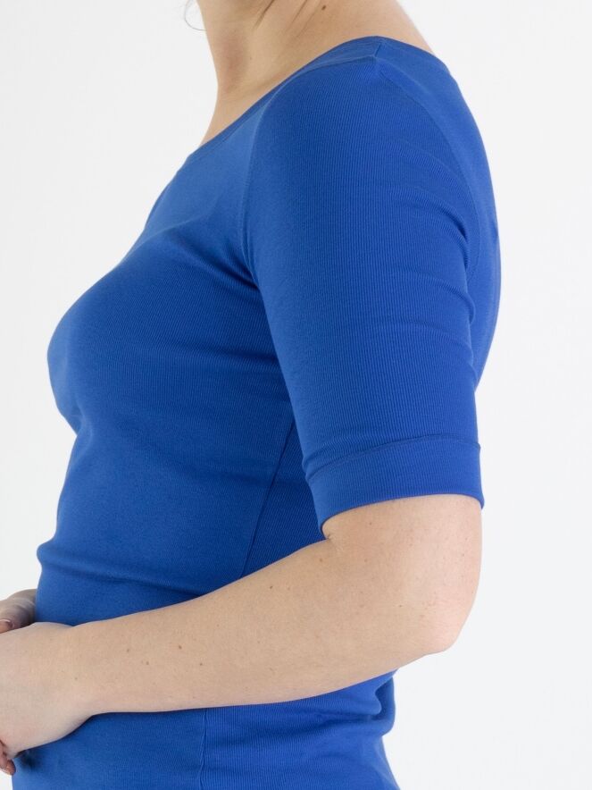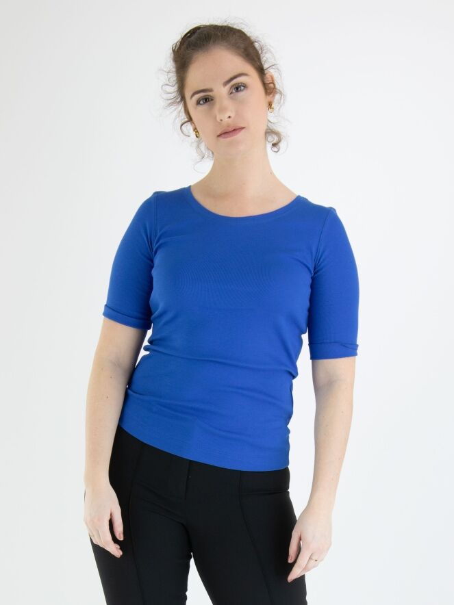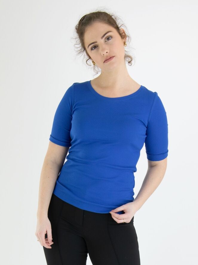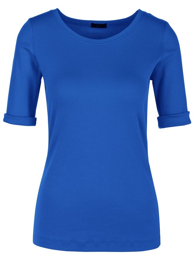 Ein Shirt von Marc Cain in Kobaltblau. Die kurzen Ärmel haben einen Umschlag. Das Shirt hat einen runden Halsausschnitt und kann bei 30 Grad gewaschen werden.